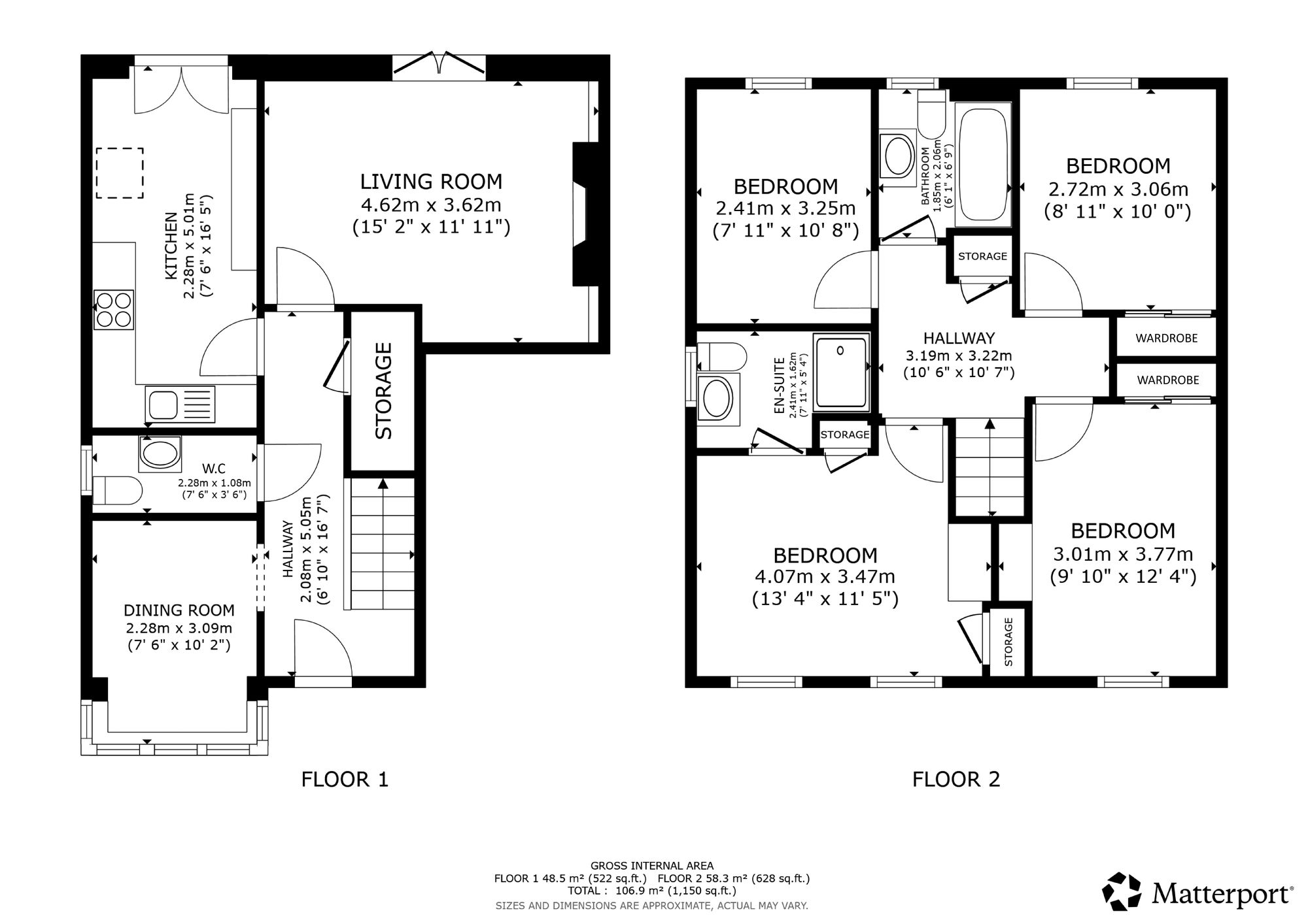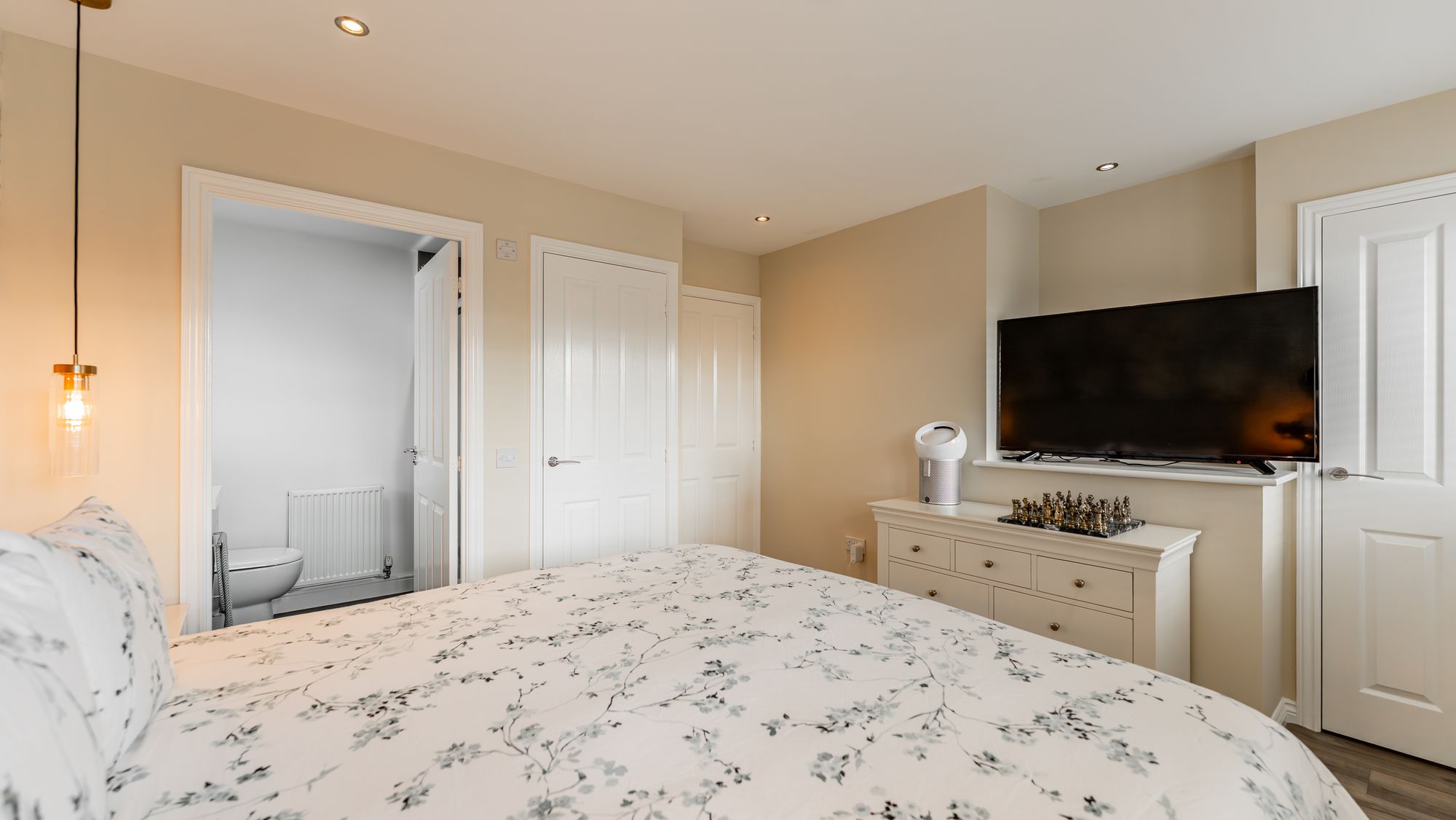 The upper-level leads to four bedrooms master with en-suite and a fully tiled family bathroom with white three-piece suite.
