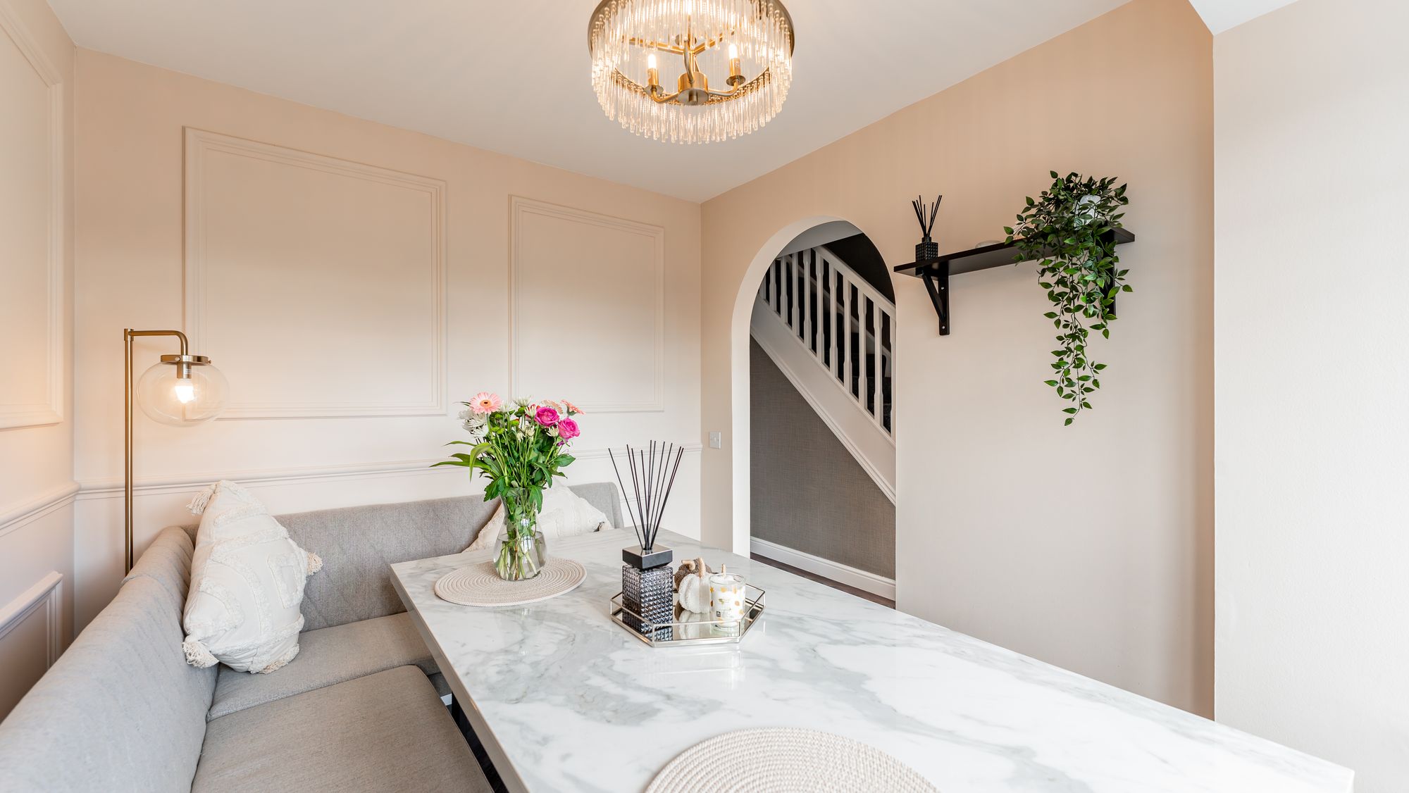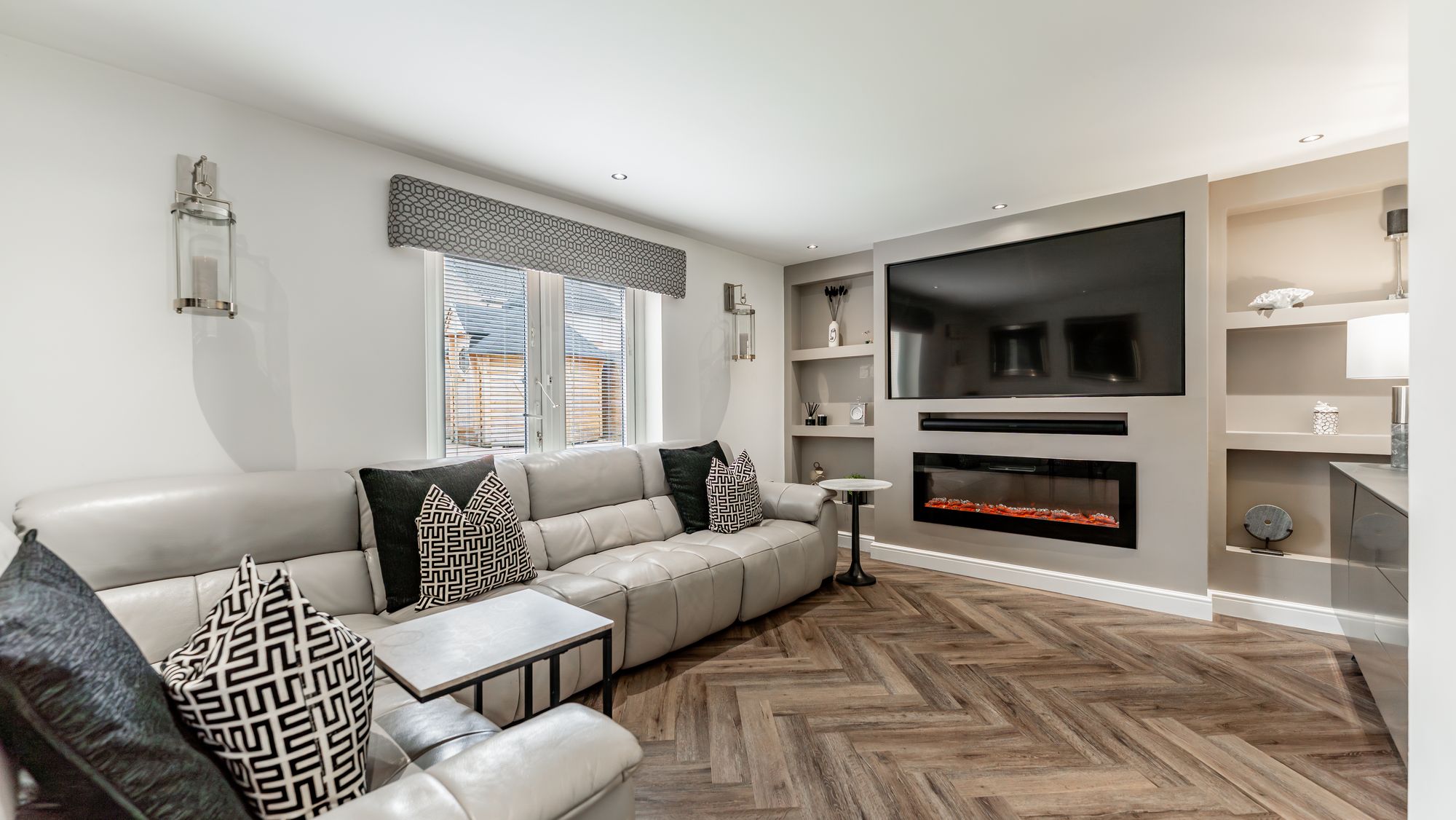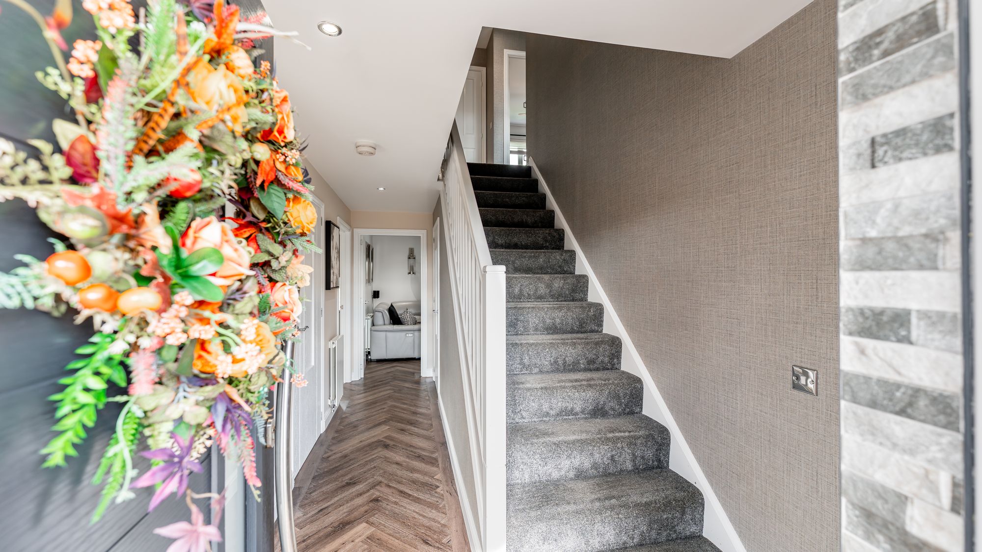 Internally, the accommodation extends to nearly 1200 square feet and comprises a welcoming reception hallway with handy w/c off complete with beautiful Porcelanosa tiling, formal lounge to rear with feature media wall, dining room that is semi open plan to reception hall, modern kitchen housing a range of integrated appliances with generous floor and wall mounted units . The ground floor accommodation is completed with access to garage which provides convenient utility area.