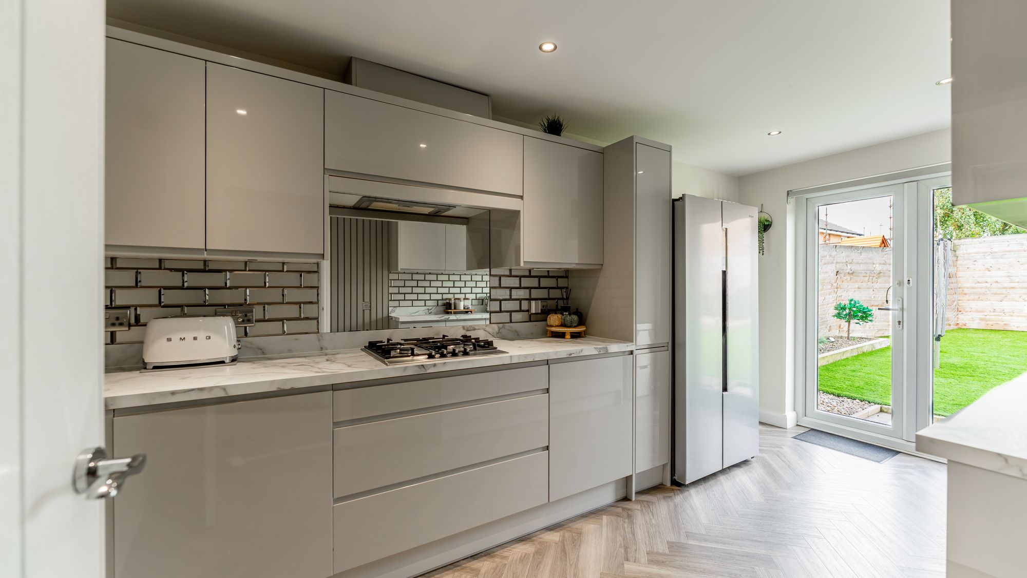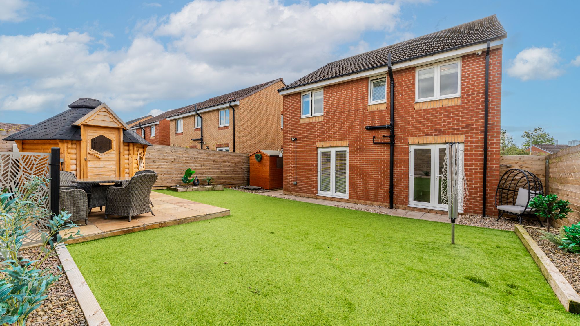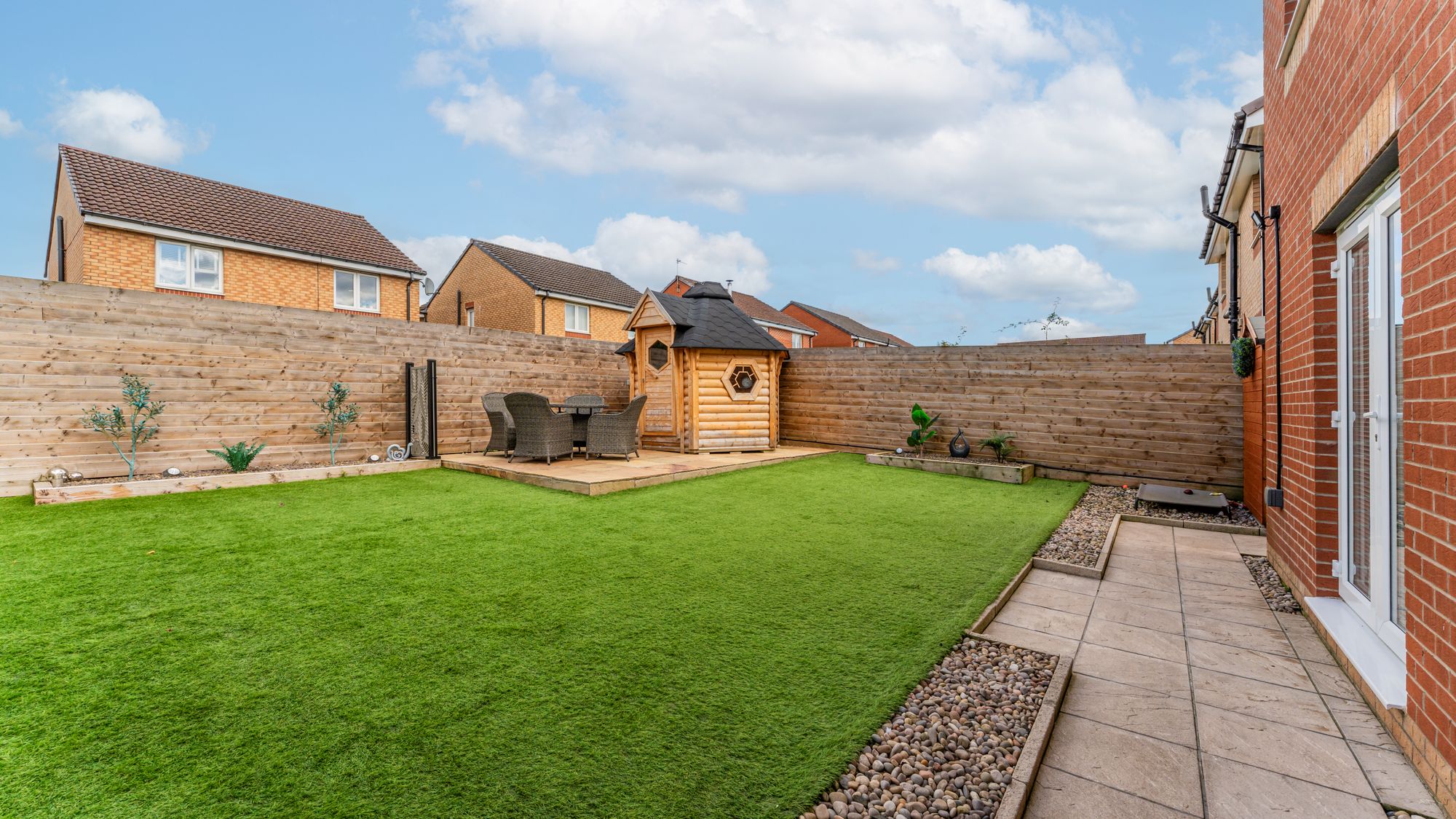 The mono-blocked driveway covers the whole of the front garden area providing great off-street parking. The rear gardens have been designed for easy of maintenance and are laid totally with artificial grass with elevated patio area.