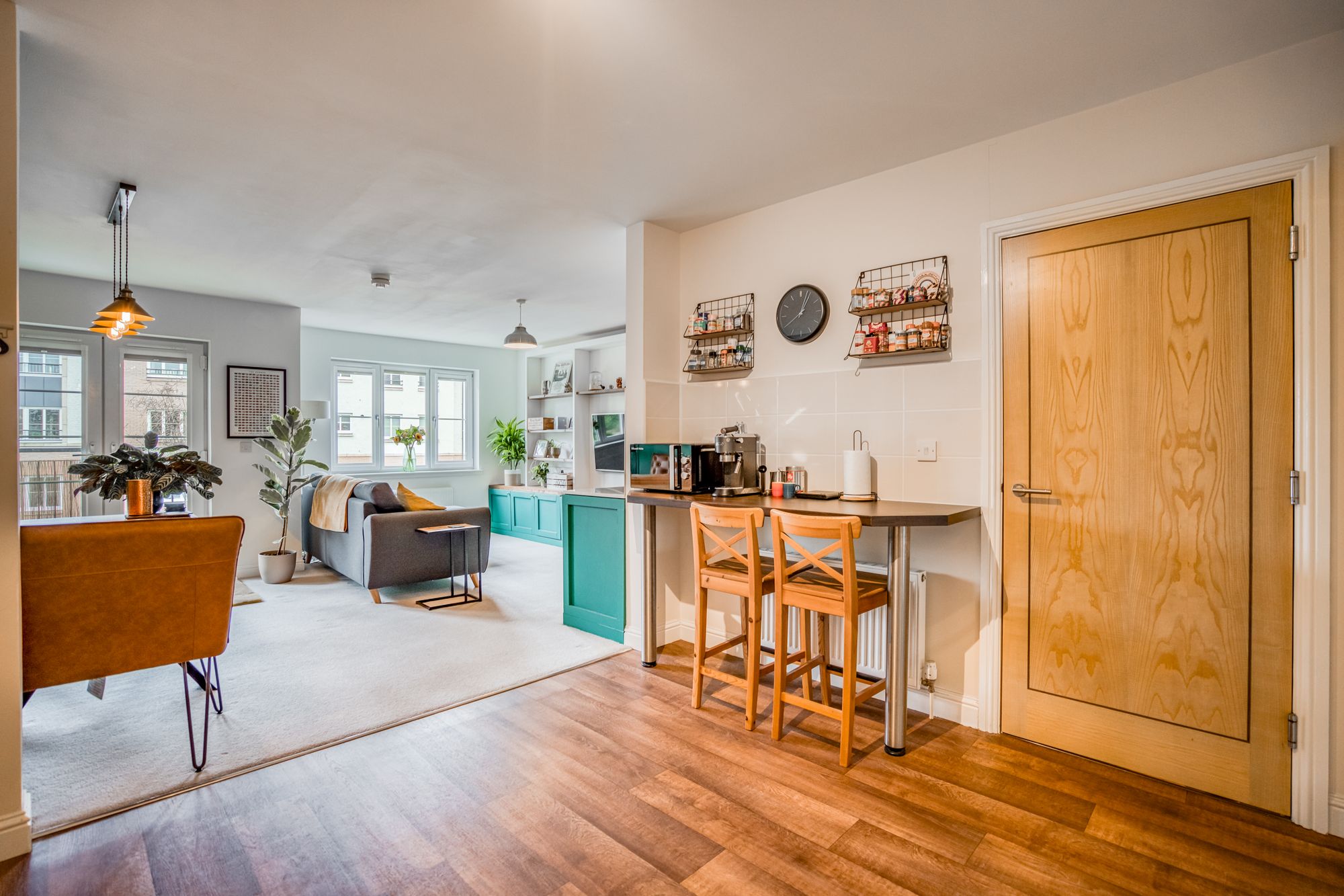 The principal bedroom is generously sized and benefits from a sleek en-suite shower room. A second double bedroom provides flexible space for guests, a home office, or additional storage. The main bathroom is finished to a high standard with modern fittings.
