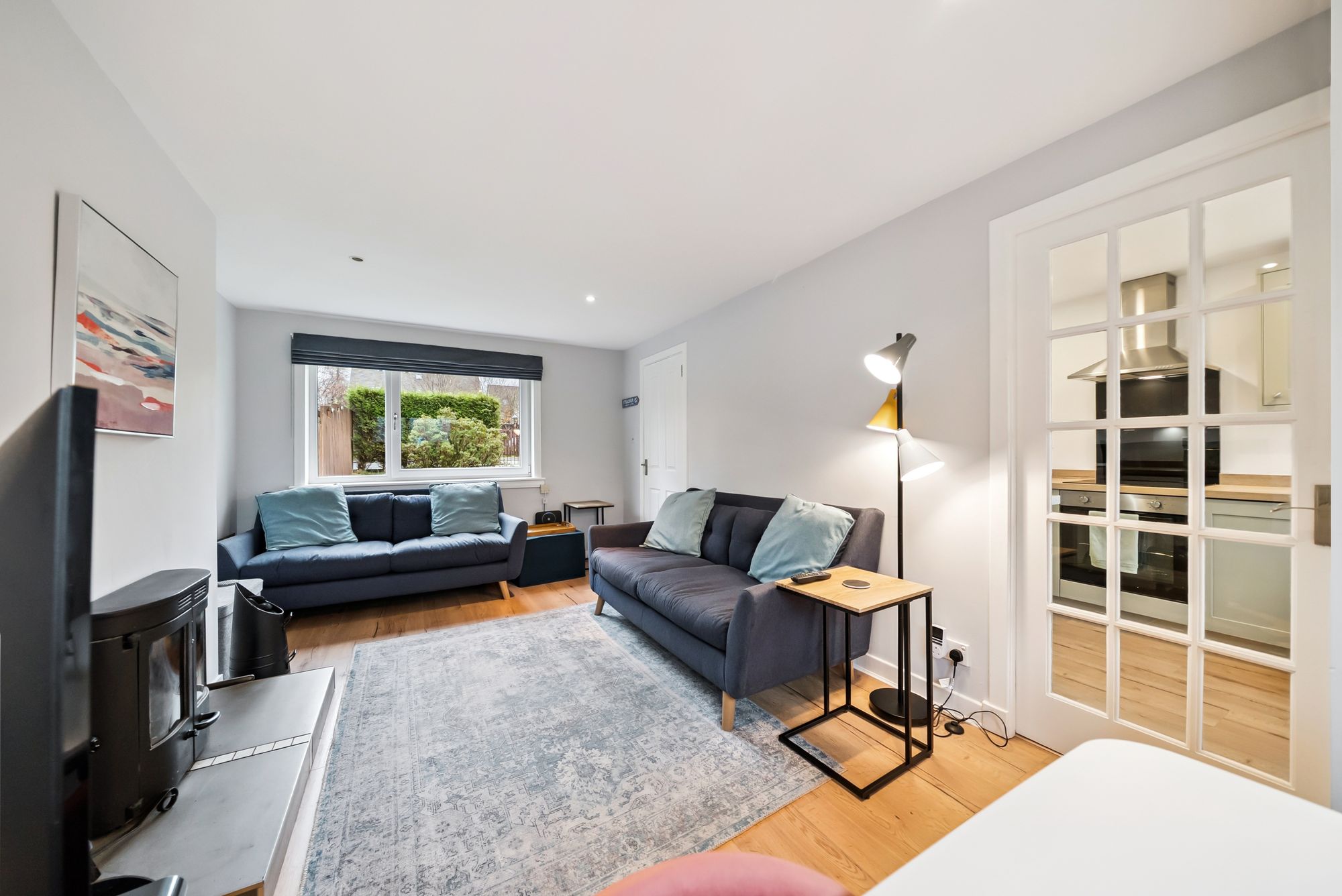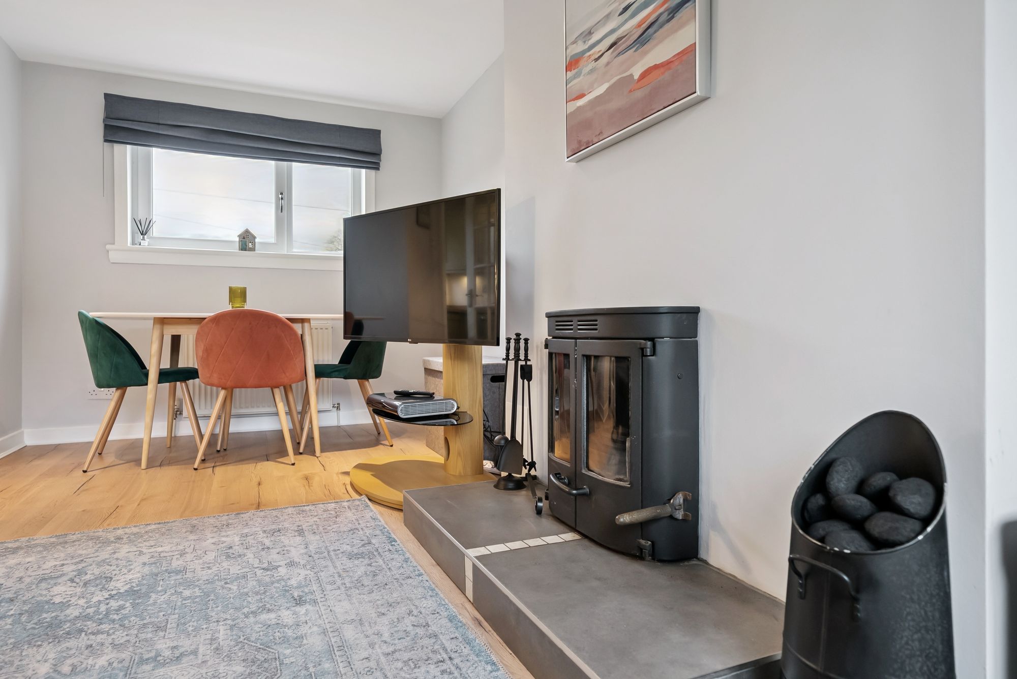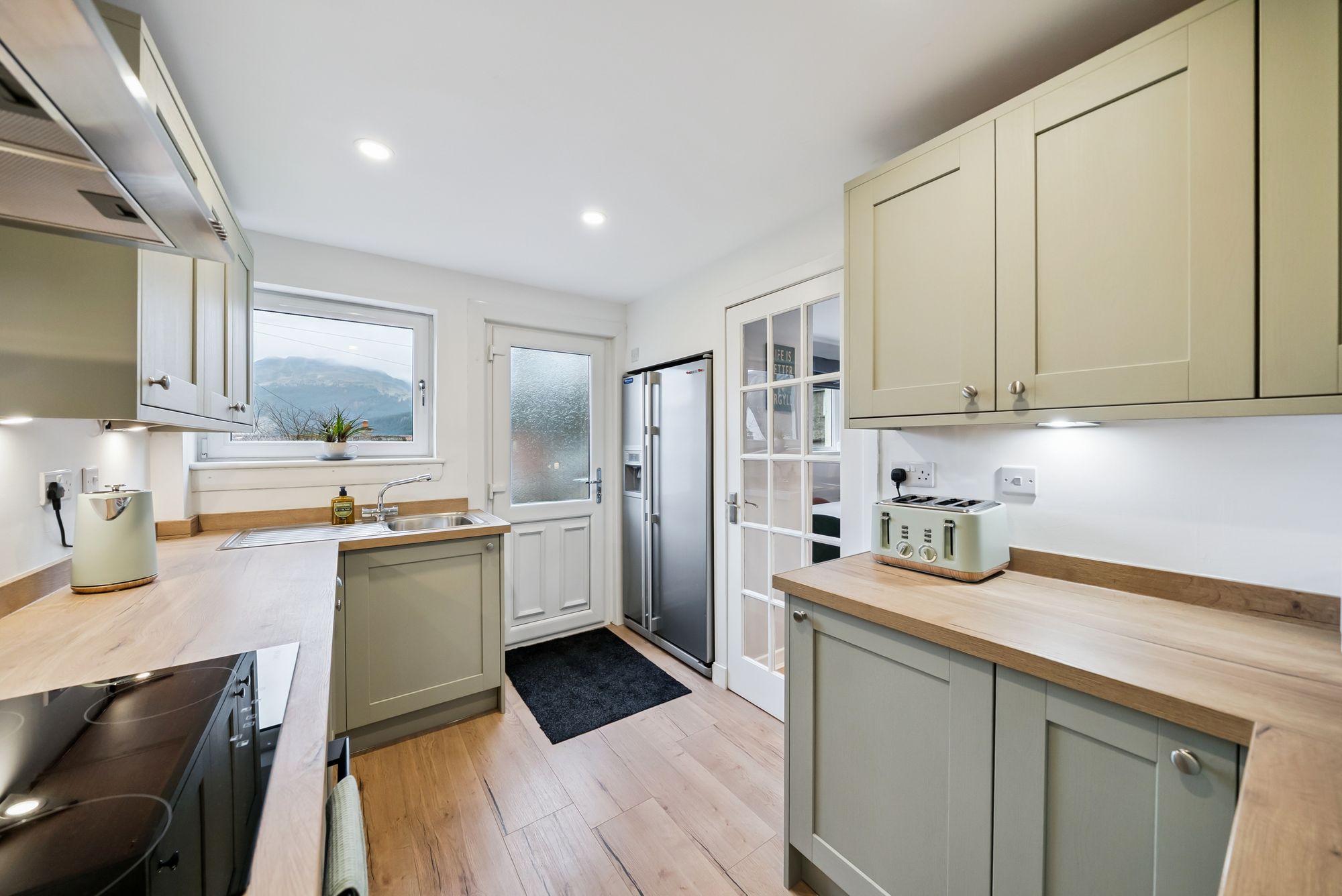 The home is arranged over two levels and begins with a bright, modern entrance hallway. This leads through to a spacious and welcoming lounge, featuring a charming enclosed dual-fuel stove and attractive wooden flooring that flows seamlessly through the hall and into the kitchen. Large windows to either side of the lounge flood the space with natural light, creating a warm and inviting atmosphere. The kitchen is beautifully finished, fitted with a modern range of wall and floor-mounted units, electric hob and oven. A door from the kitchen provides direct access to the garden, perfect for enjoying the outdoor space and scenic surroundings.