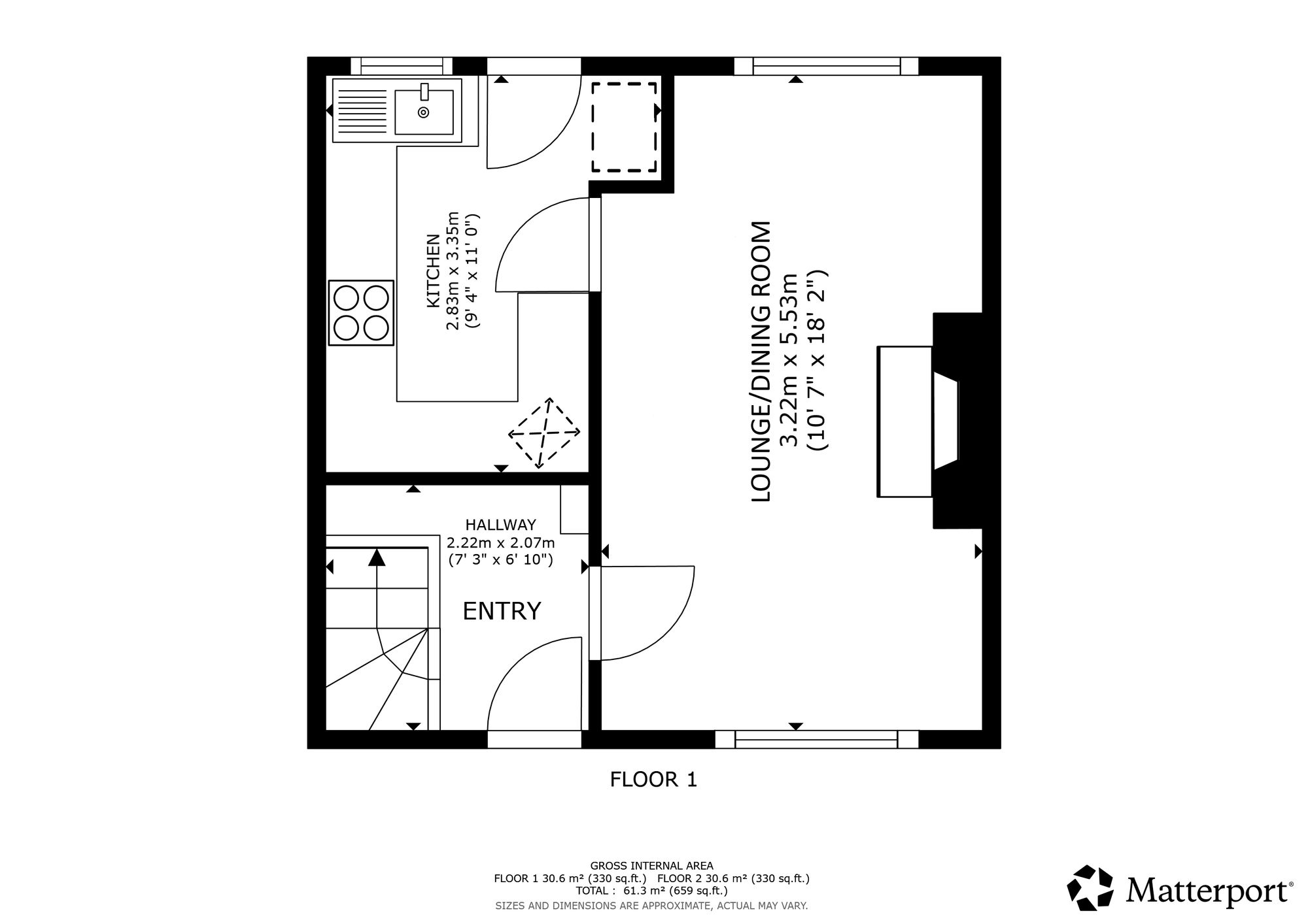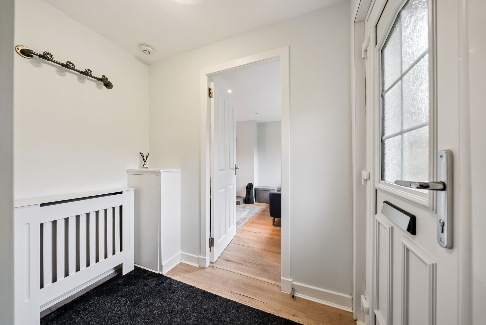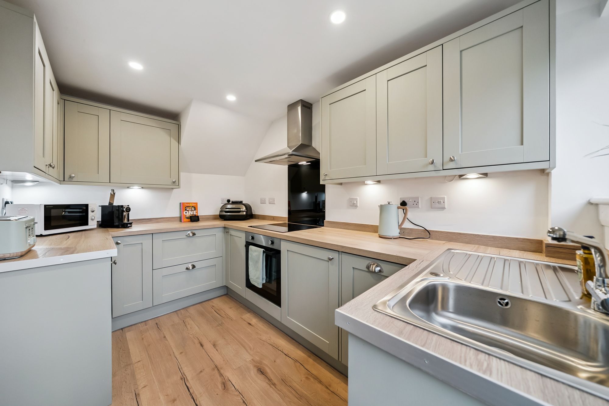 The home is arranged over two levels and begins with a bright, modern entrance hallway. This leads through to a spacious and welcoming lounge, featuring a charming enclosed dual-fuel stove and attractive wooden flooring that flows seamlessly through the hall and into the kitchen. Large windows to either side of the lounge flood the space with natural light, creating a warm and inviting atmosphere. The kitchen is beautifully finished, fitted with a modern range of wall and floor-mounted units, electric hob and oven. A door from the kitchen provides direct access to the garden, perfect for enjoying the outdoor space and scenic surroundings.