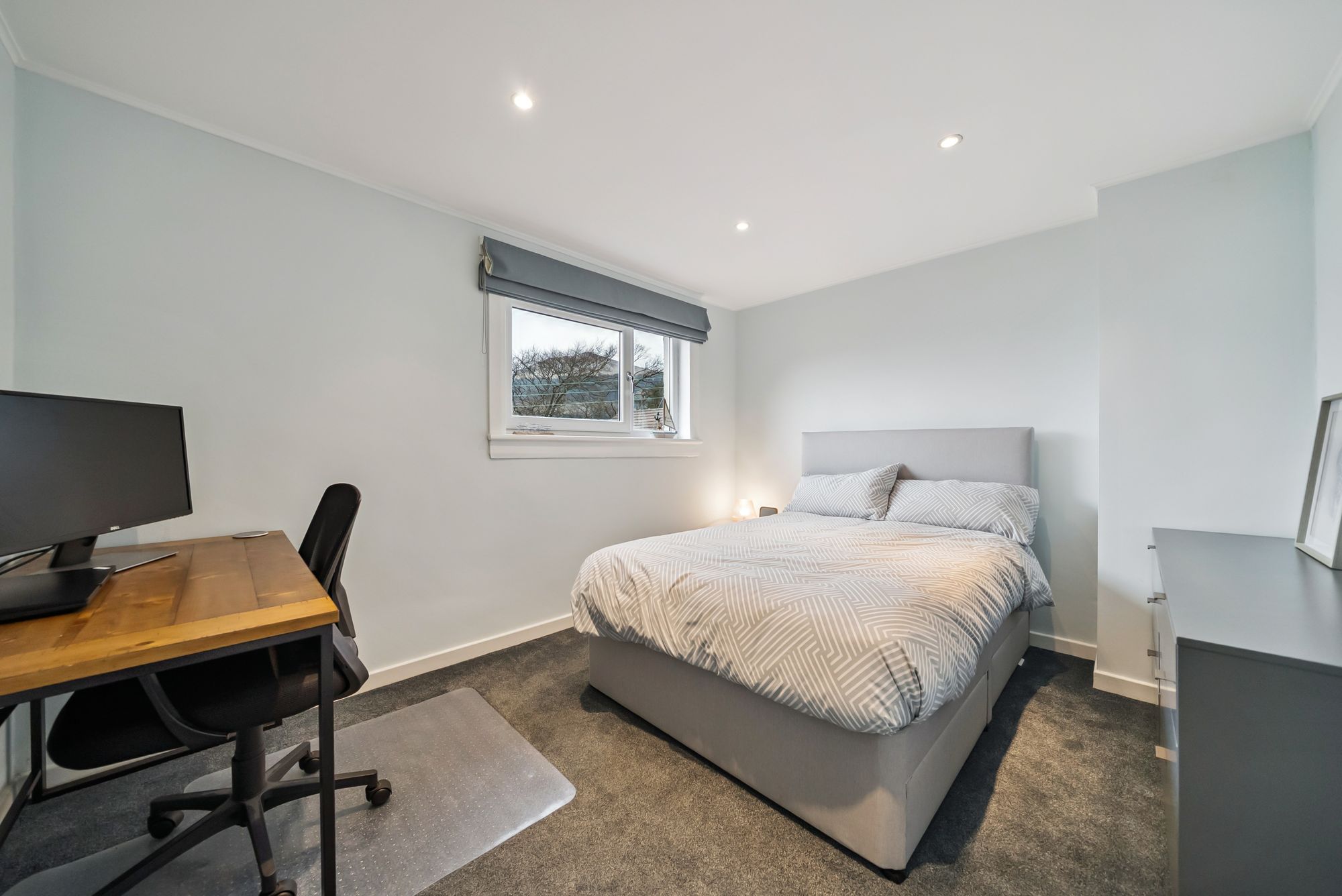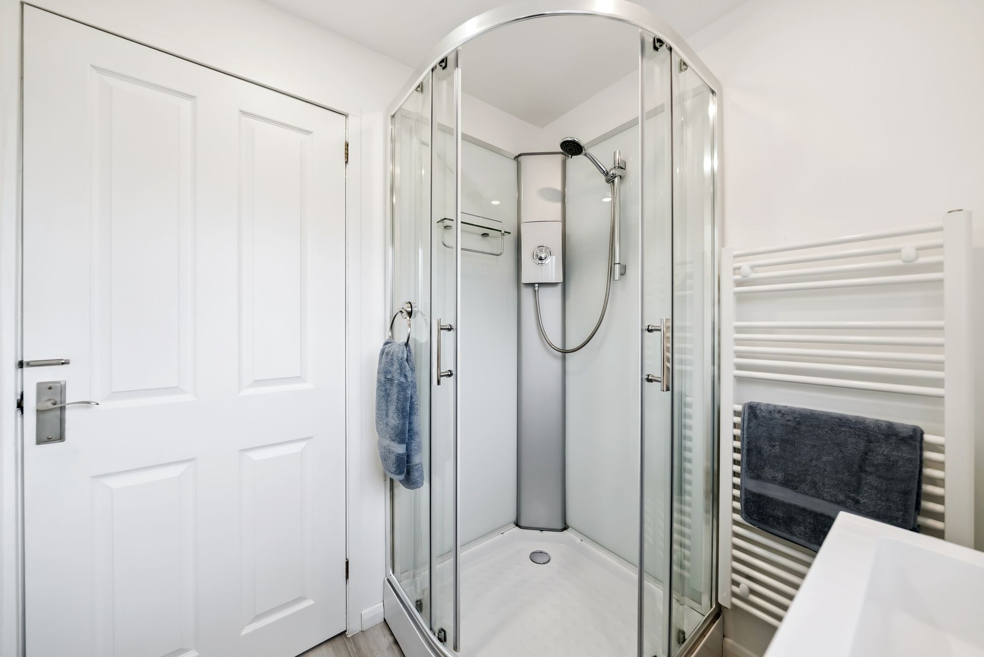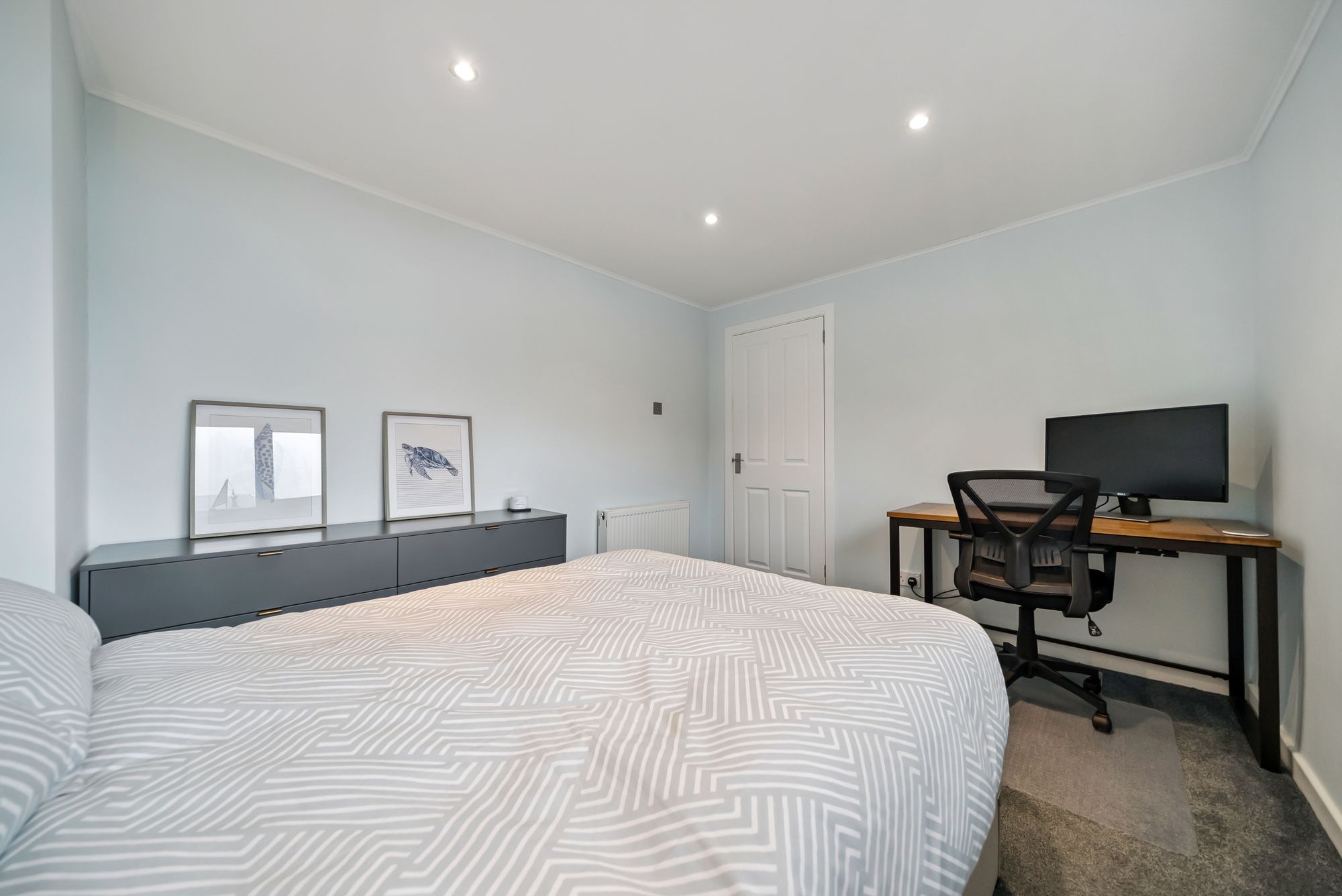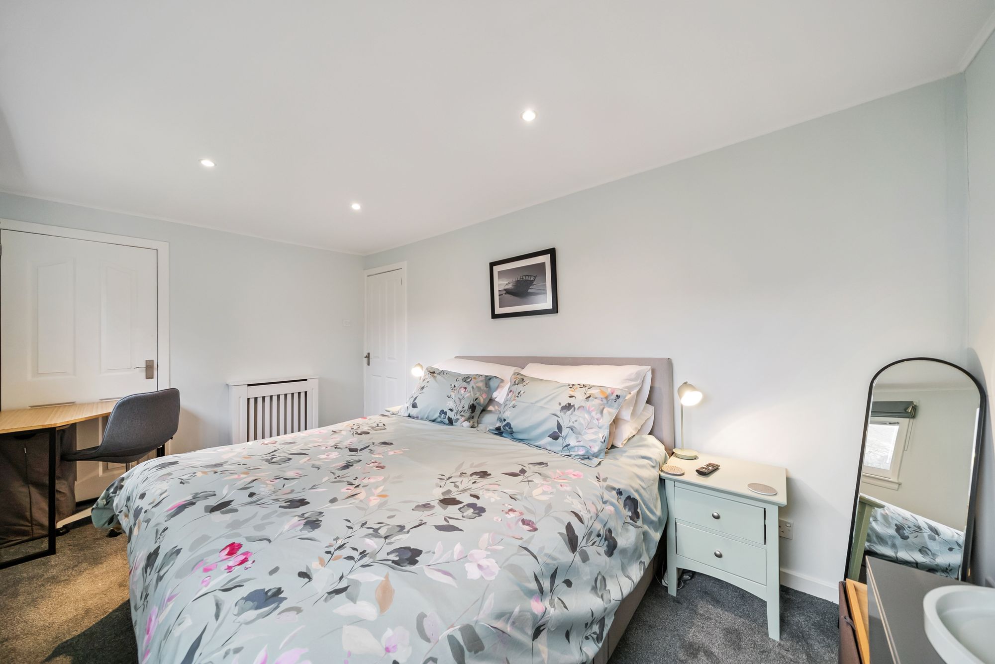 Upstairs, the generous master bedroom is tastefully decorated and enjoys open aspects over the garden through two bright windows. The second bedroom is also an excellent size, offering ample space for storage and furnishings. Completing the accommodation is a modern shower room, finished to a high standard with a stylish wash-hand basin, spacious shower enclosure and wc. The property benefits from recently replaced PVC-framed double-glazed windows throughout, along with PVC double-glazed front and rear entrance doors.