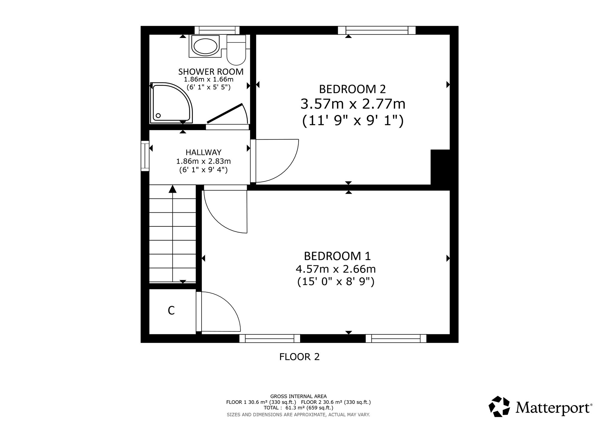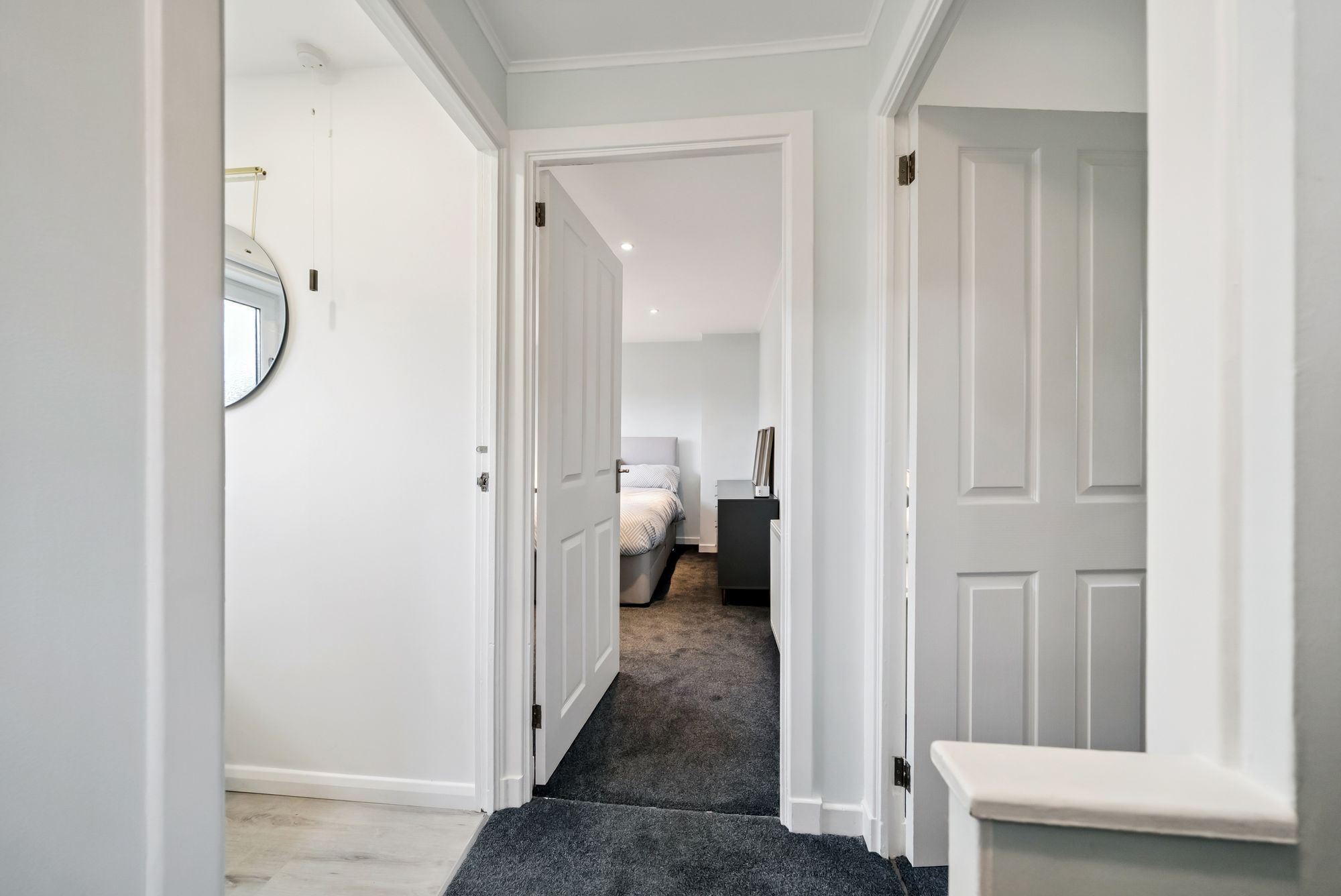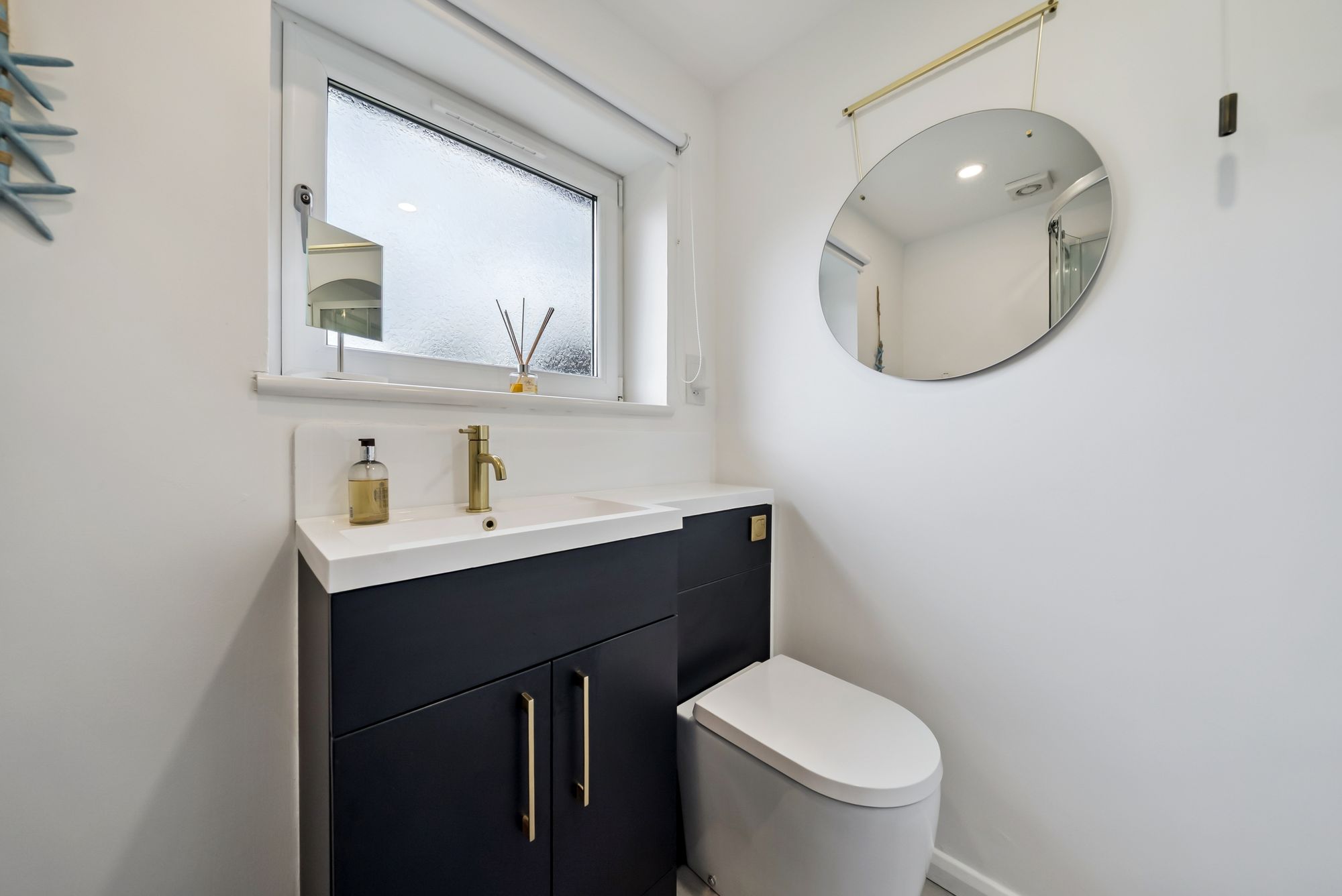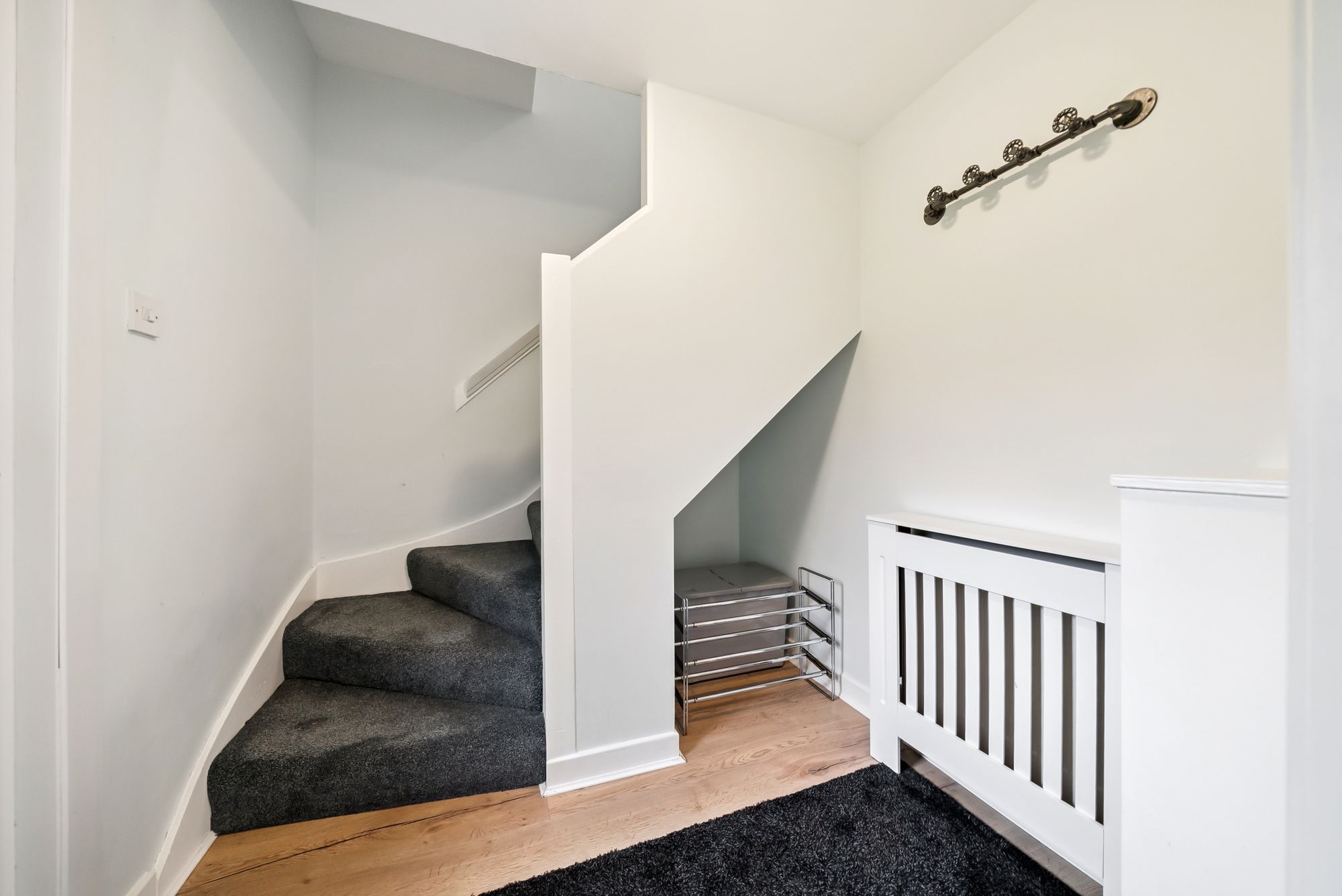 Upstairs, the generous master bedroom is tastefully decorated and enjoys open aspects over the garden through two bright windows. The second bedroom is also an excellent size, offering ample space for storage and furnishings. Completing the accommodation is a modern shower room, finished to a high standard with a stylish wash-hand basin, spacious shower enclosure and wc. The property benefits from recently replaced PVC-framed double-glazed windows throughout, along with PVC double-glazed front and rear entrance doors.