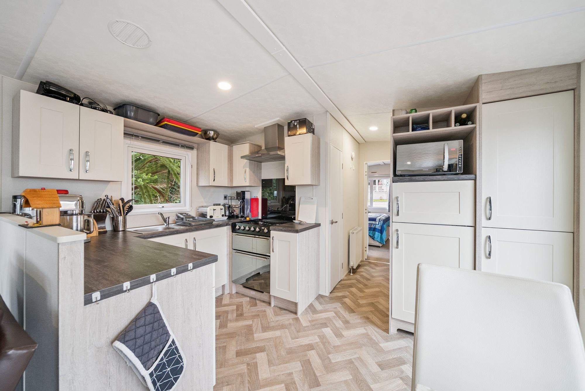 Designed for comfortable coastal living, the home features a bright, open plan layout with a well equipped kitchen which has wall mounted and counter level units as well as an oven and hob. From the kitchen is a large open plan lounge/dining area with patio doors leading out to a private decking area perfect for relaxing and taking in the stunning scenery and the fantastic views.