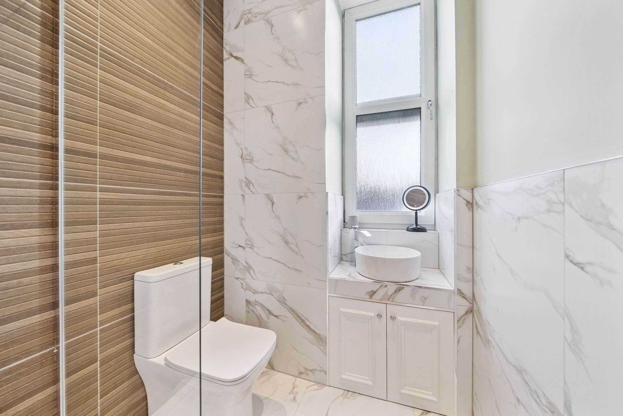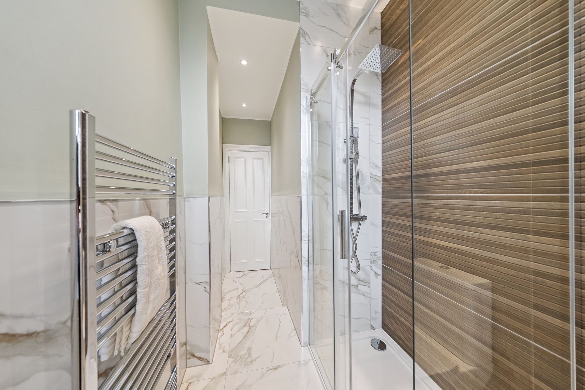 To the rear, the generously proportioned double bedroom offers a peaceful retreat, complete with in-built storage. The main bathroom is a true highlight — luxuriously finished with a large walk-in shower enclosure, contemporary WC, and vanity unit, showcasing a high level of attention to detail.