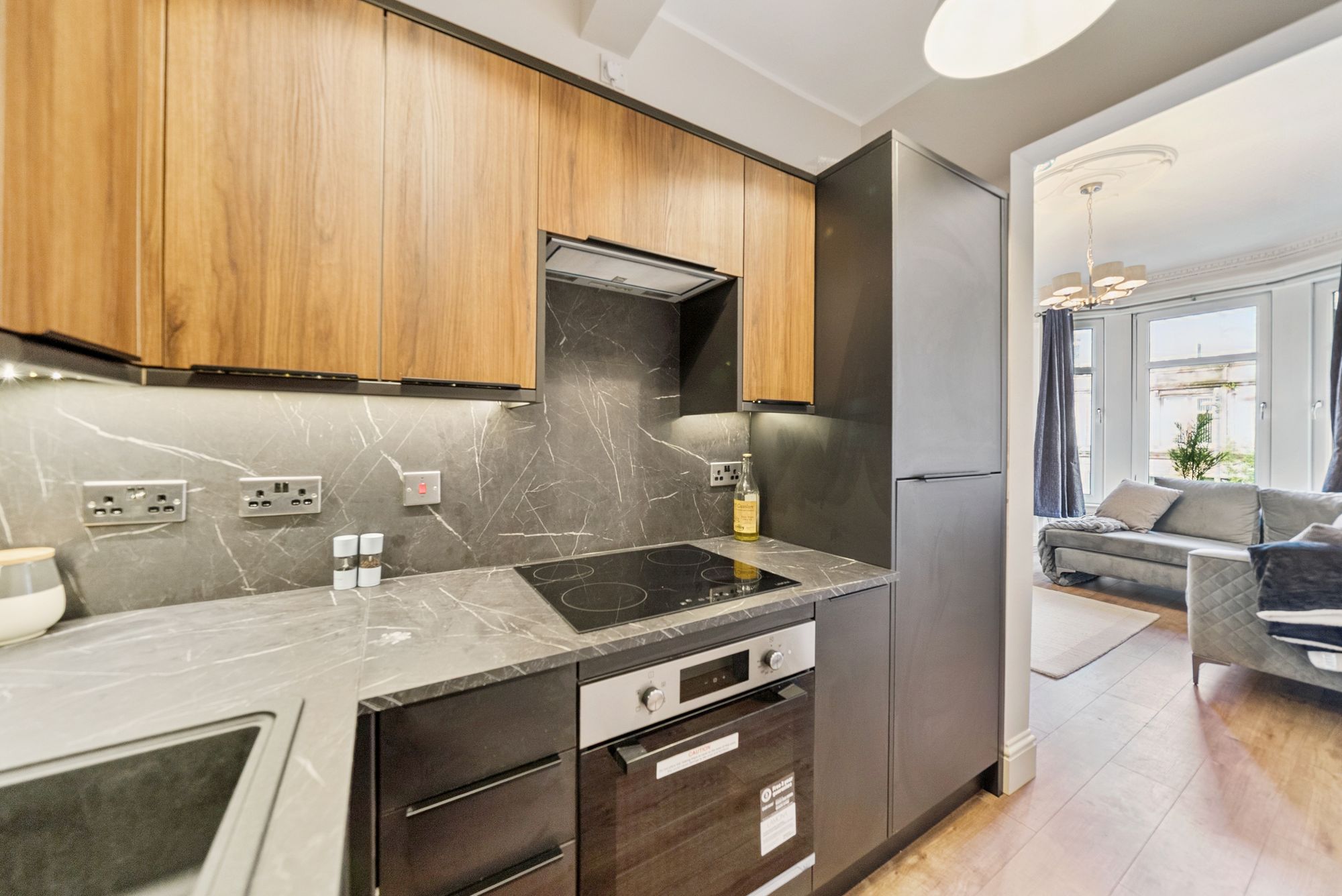 Accessed via secure door entry into a well-maintained communal close, the apartment opens into a welcoming hallway that leads to all principal rooms. The standout feature is the impressive open-plan living space, combining a bright and spacious lounge with an impeccably designed modern galley kitchen. The kitchen is fitted with a sleek range of base and wall-mounted units and includes integrated appliances, providing both style and functionality.