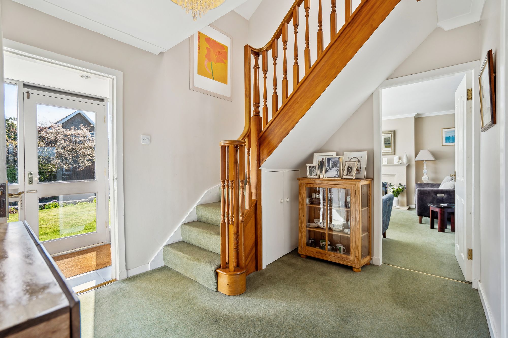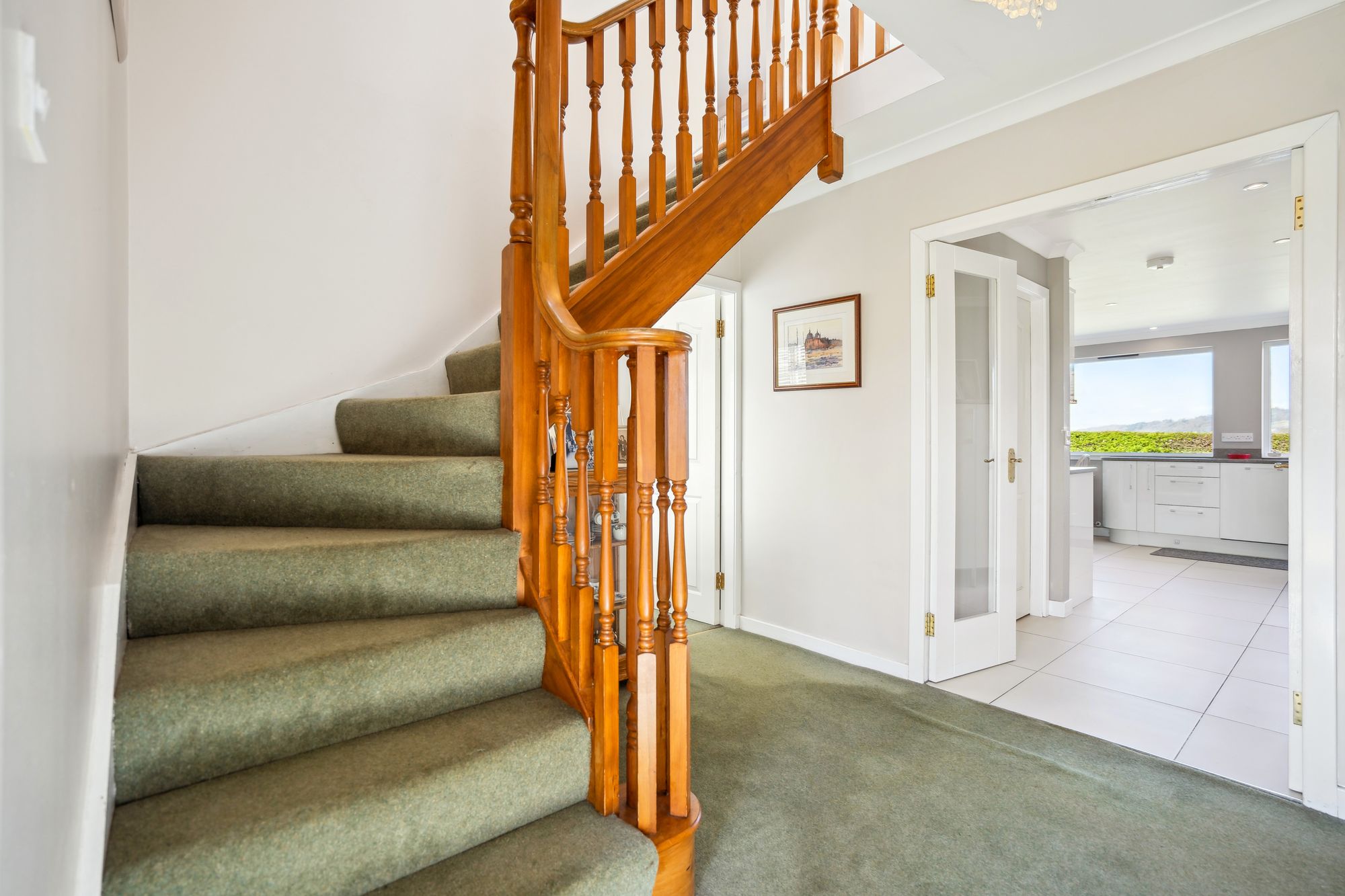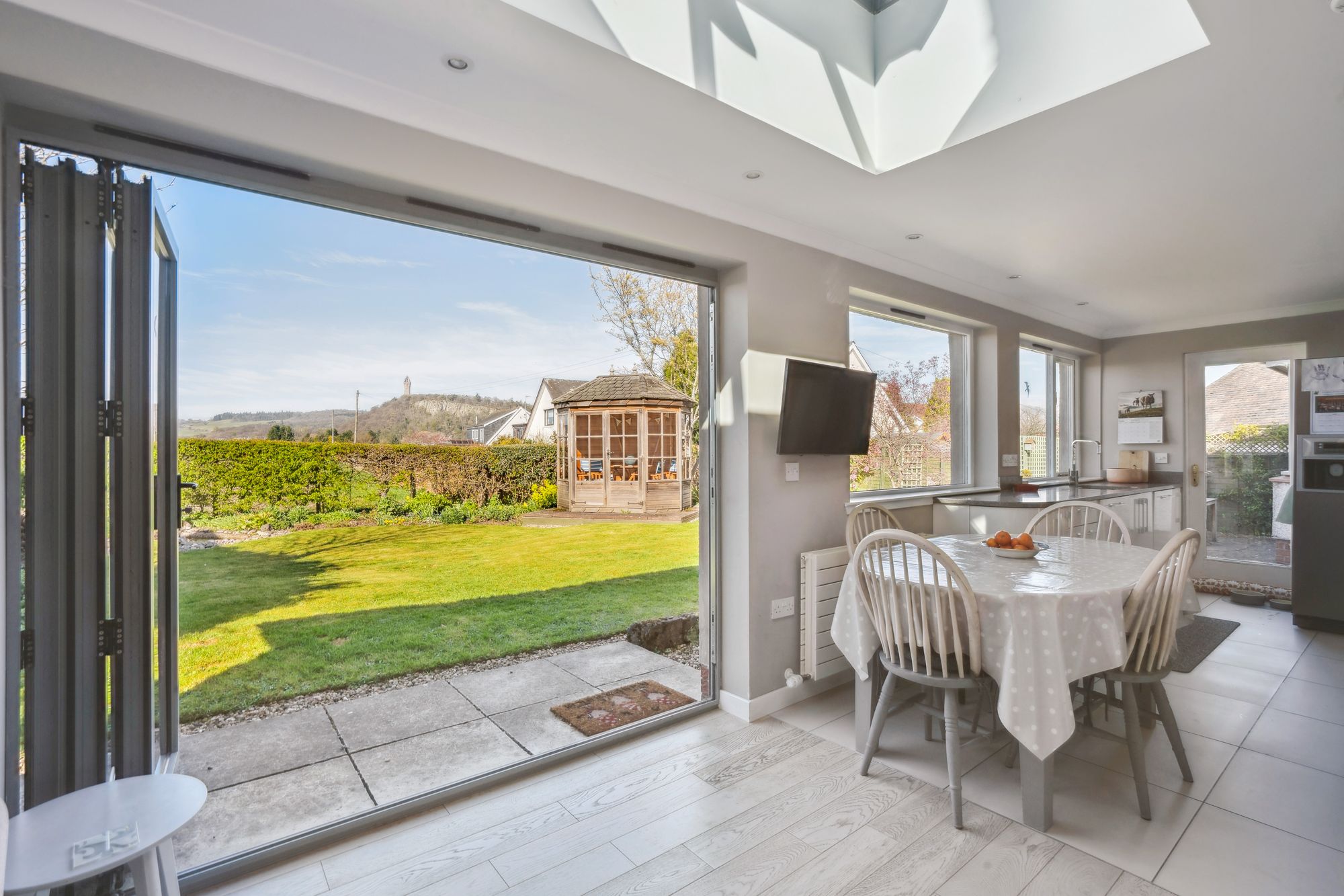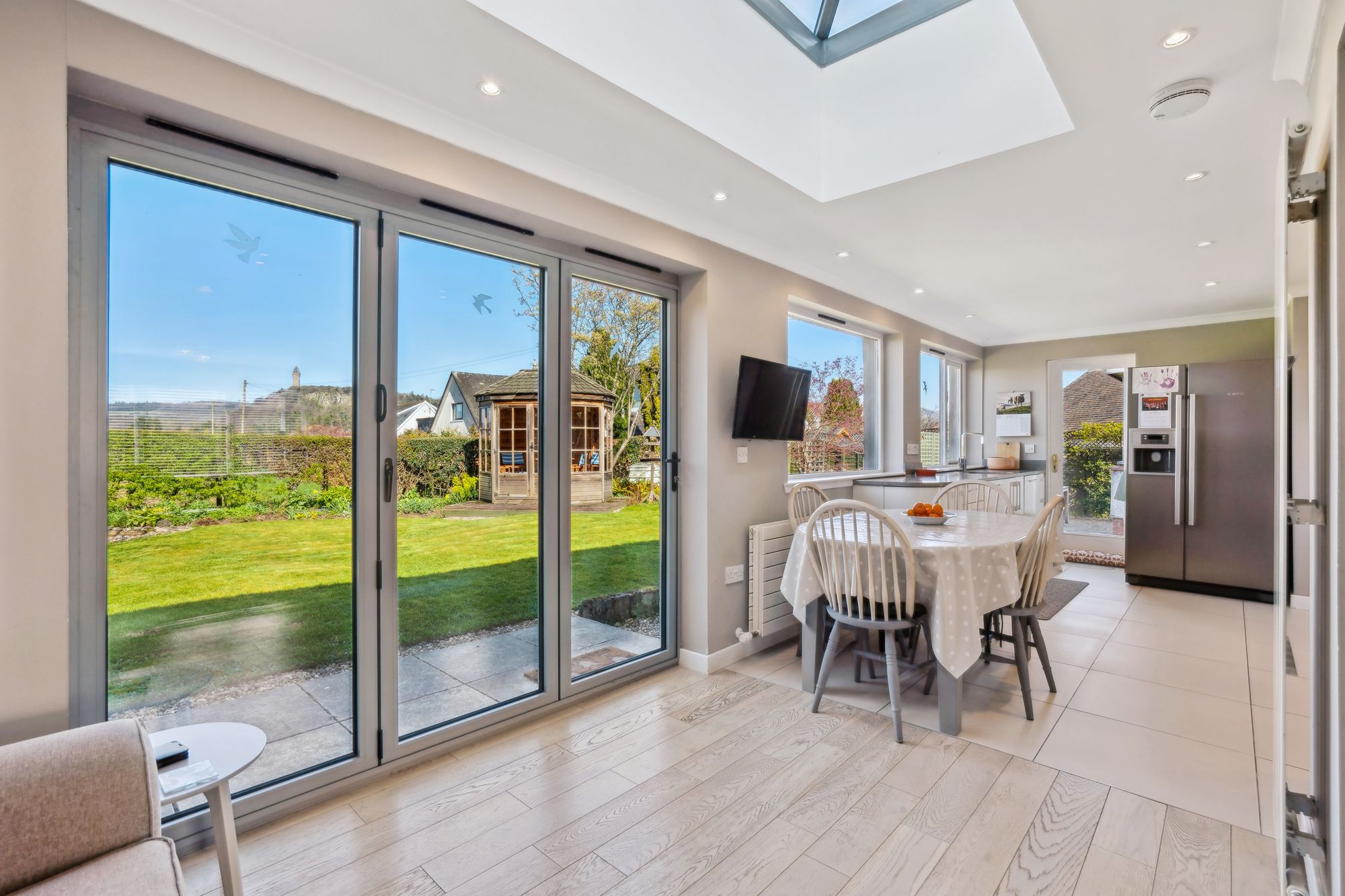 The ground floor begins with an entrance vestibule leading into a central hall which provides access to the principal living spaces. The open-plan kitchen, diner and sitting area is a key feature of the home, creating a bright and sociable environment ideal for both everyday family life and entertaining. This space flows effortlessly and benefits from excellent natural light, while the adjacent lounge and dining area offers a more formal yet inviting setting. A striking cupola enhances this room, drawing light down into the space and framing superb views over the Wallace Monument, adding a real sense of character and distinction.
