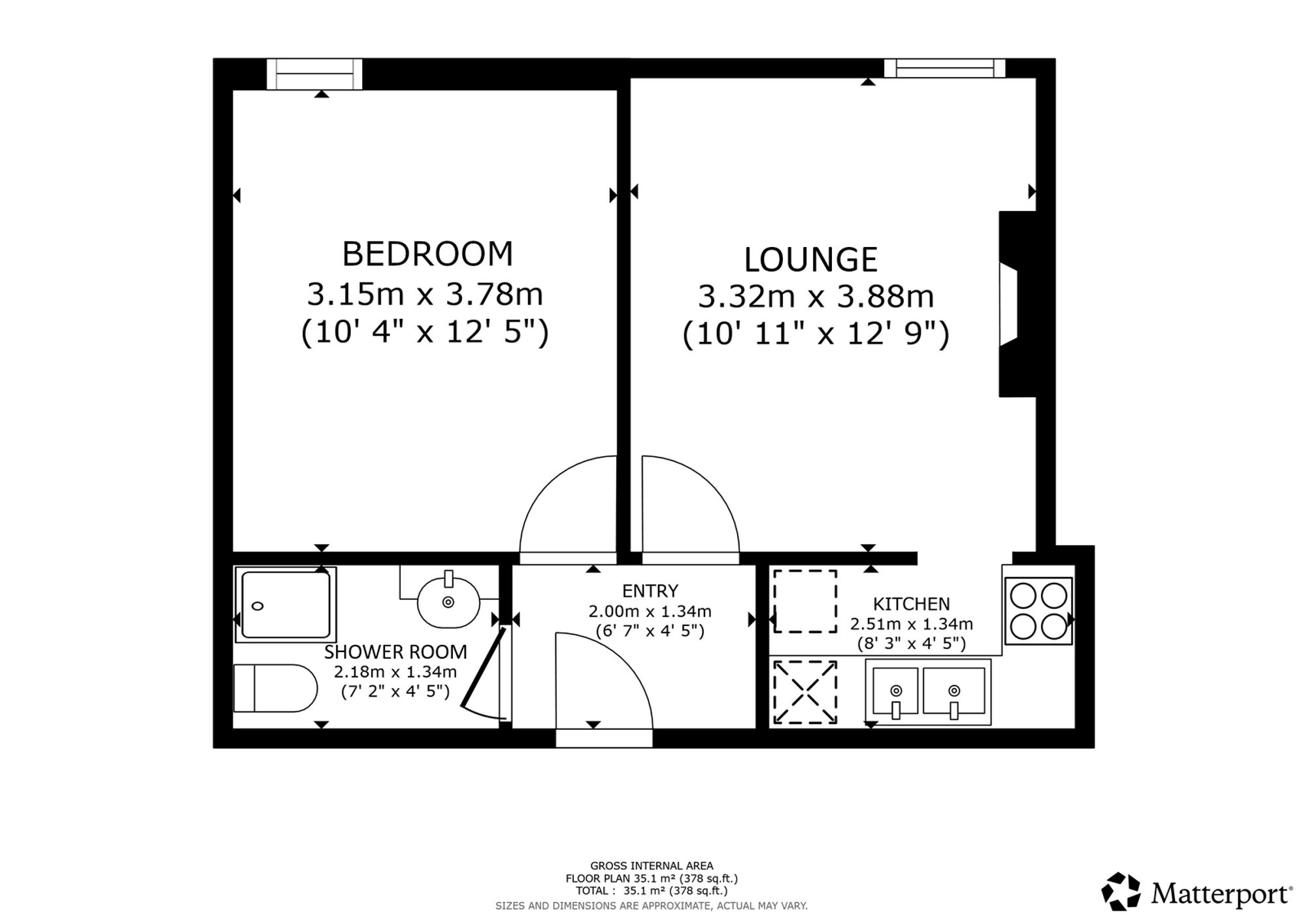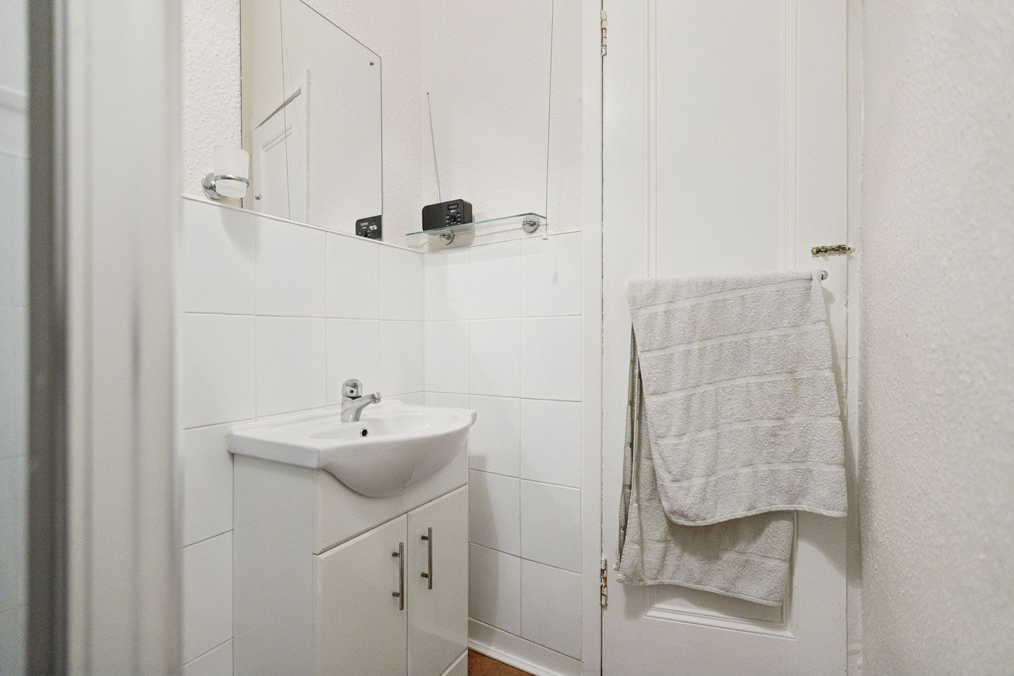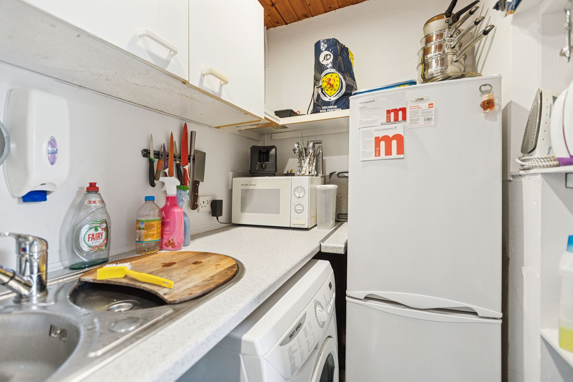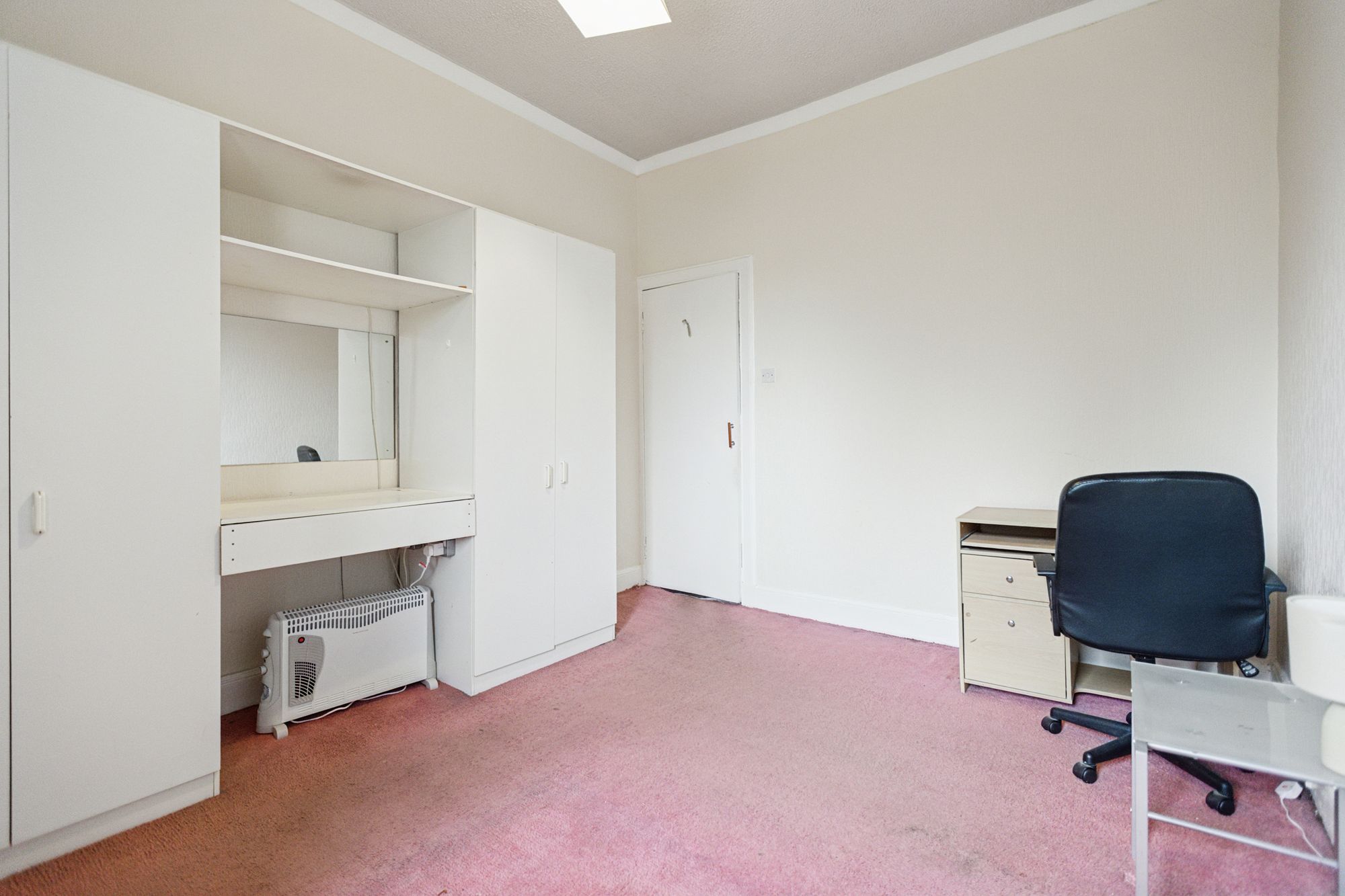 Inside, the flat offers a practical and efficient layout, with a large entrance hallway leading into a bright and welcoming lounge. The lounge is further enhanced by a charming painted brick fireplace surround, with the original opening now boarded over and currently housing a decorative electric heater. The adjacent kitchenette is compact but functional, featuring a selection of wall and floor mounted units, along with a free standing electric cooker and shelving for additional storage. The bedroom is spacious in size and can fit a double bed and offers ample space for furnishings. The internal shower room is conveniently accessed from the hallway, coming complete with walk in shower enclosure, wc and wash hand basin. The property benefits from double glazing throughout, helping to maintain warmth and reduce noise and comes with gas fired central heating. Additional highlights include the flat’s elevated position on the top floor, offering enhanced privacy and outlooks, and the characterful communal stairwell which serves all nine flats in the block. neighbourhood.