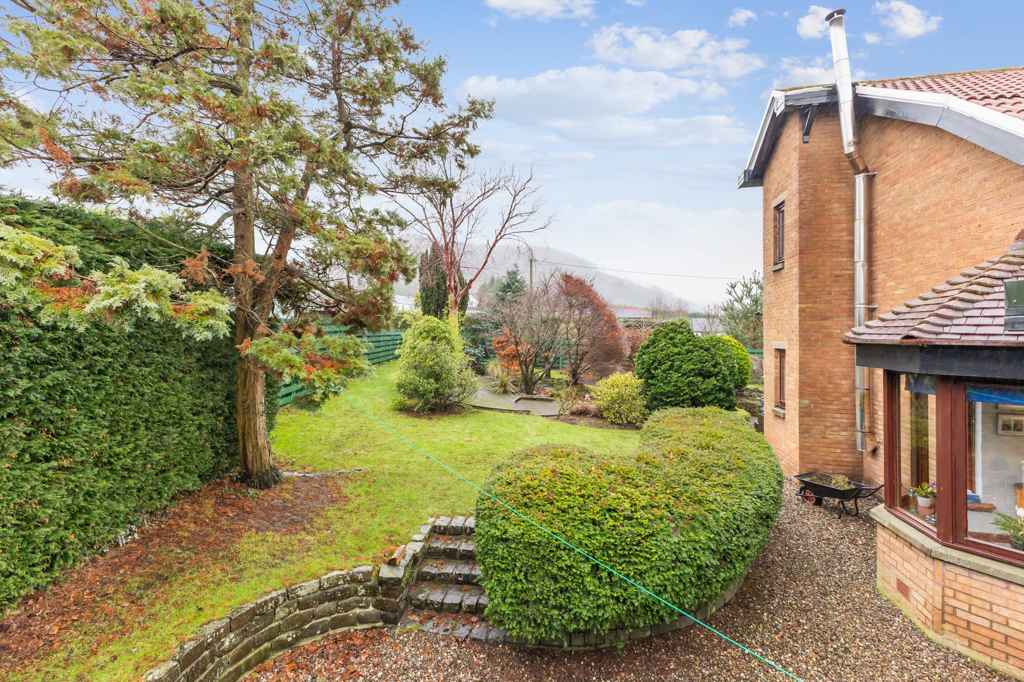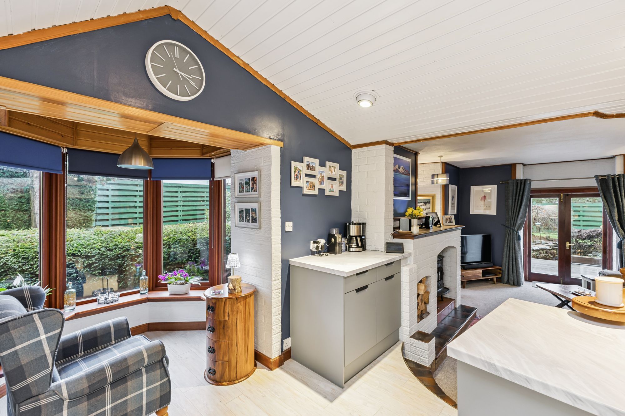 Externally, the property is set within mature and private gardens, thoughtfully laid out with a mix of lawn, paved, and gravelled areas. A timber decked structure to the rear provides an ideal spot for outdoor entertaining, while a covered seating and drying area beside the integral garage adds further versatility. The gardens are enclosed by a combination of stone walling and timber fencing, ensuring privacy and security.