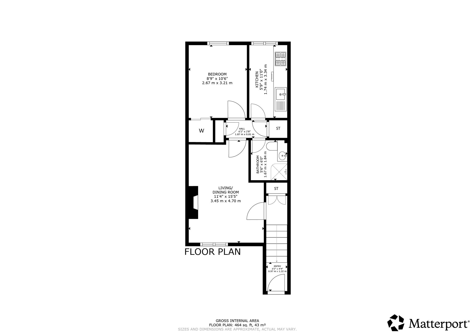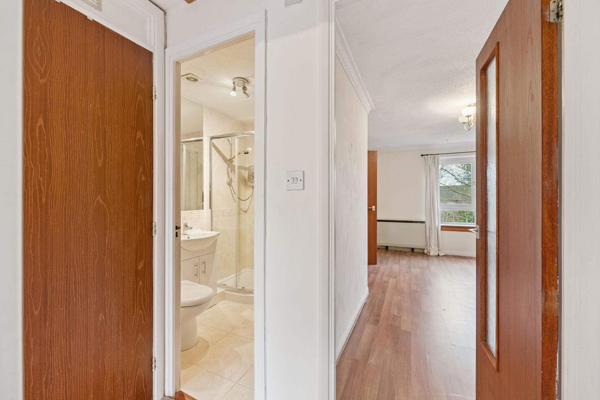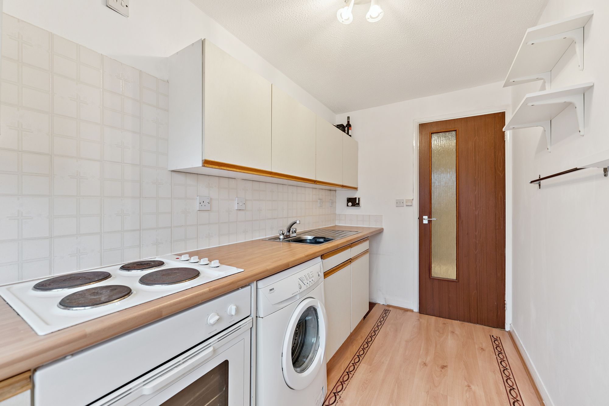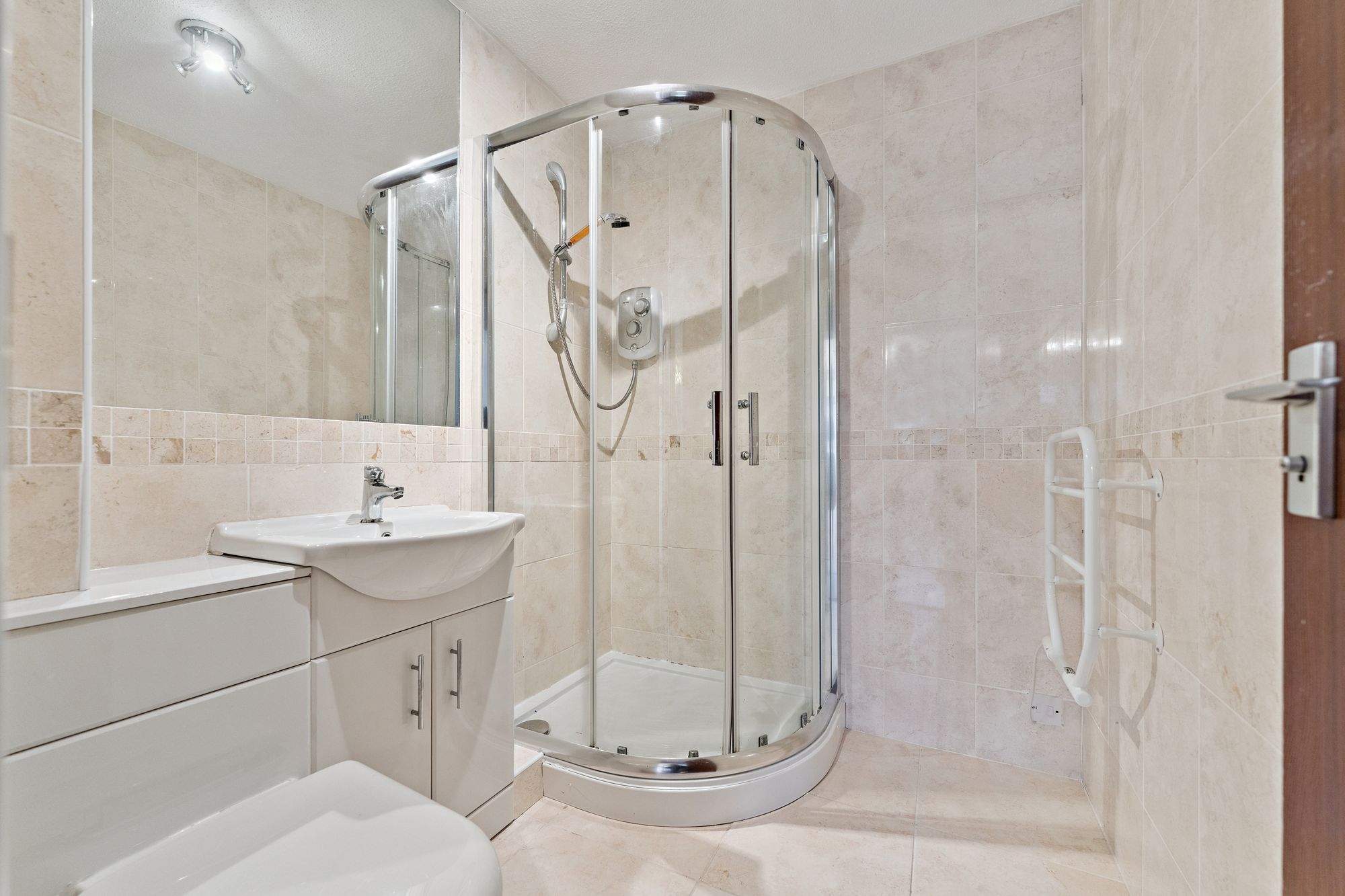 Freshly decorated in light, neutral tones throughout, the accommodation comprises a bright and spacious living room overlooking the central green, alongside a fully fitted kitchen with integrated oven and hob and tile splashback. The generously proportioned double bedroom benefits from deep fitted wardrobes, while further storage is provided within the hallway cupboard. A fully tiled shower room completes the accommodation, featuring an electric shower, white sanitaryware and vanity unit.