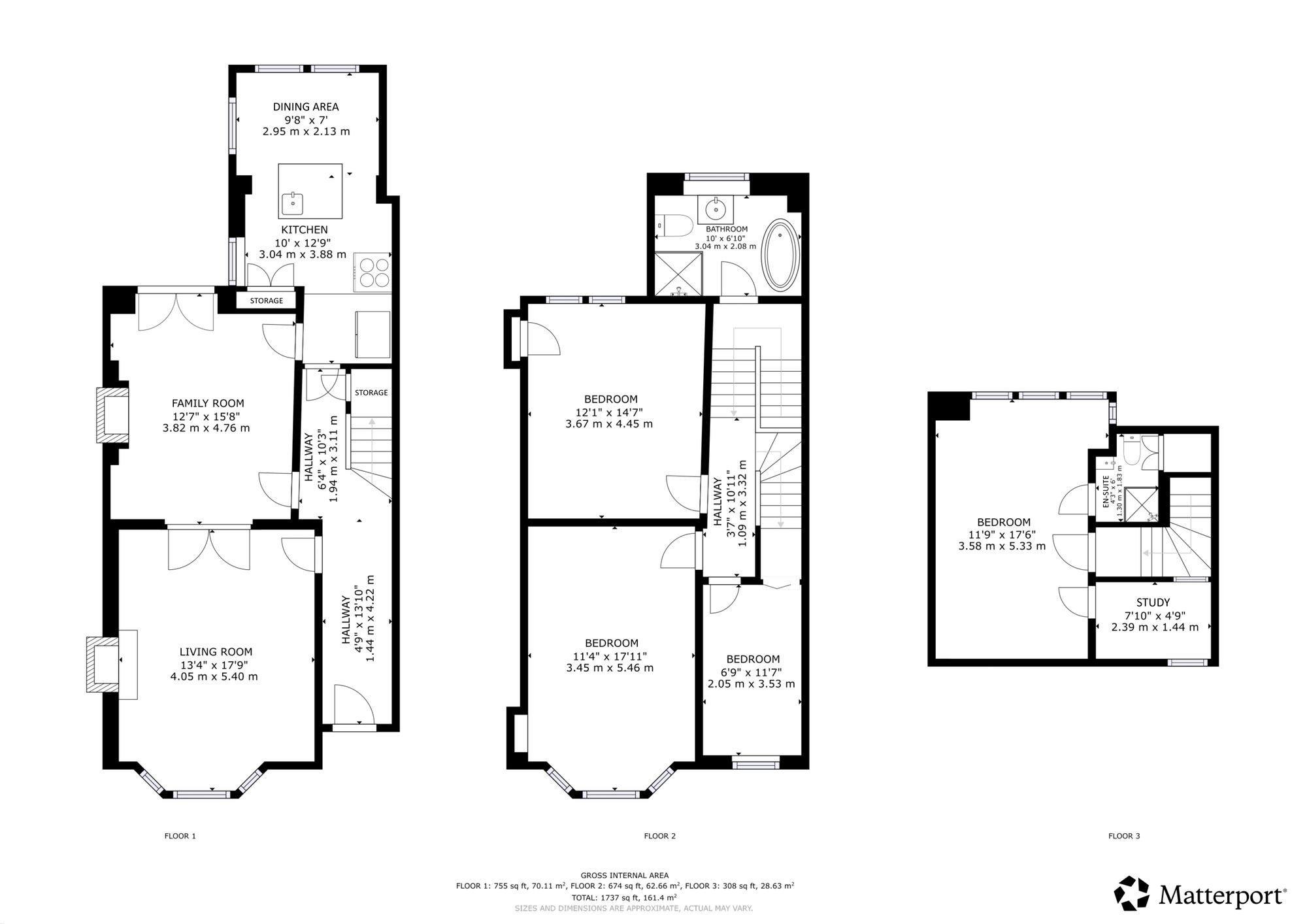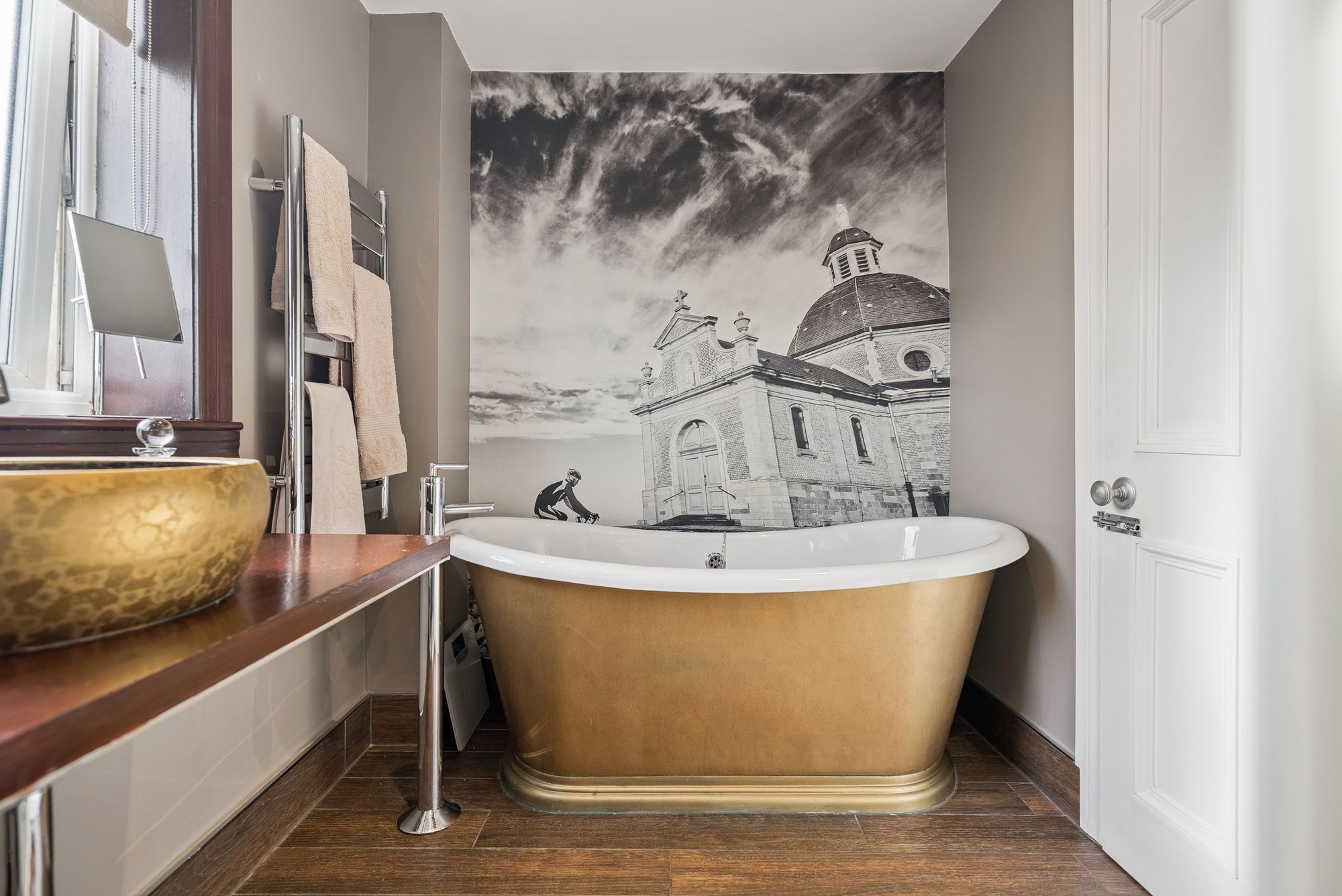 The staircase ascends to the mid landing, where a stylish family bathroom awaits, featuring a freestanding bath, Porcelanosa tiled shower area, contemporary sink, chrome heated towel rail, and Porcelanosa ceramic tiled wood effect flooring with under floor heating. On the first floor, there are two generous double bedrooms, with the principal room enjoying a large bay window that enhances the sense of space and light. The second bedroom is equally well proportioned, while the third smaller bedroom includes a convenient walk in wardrobe.