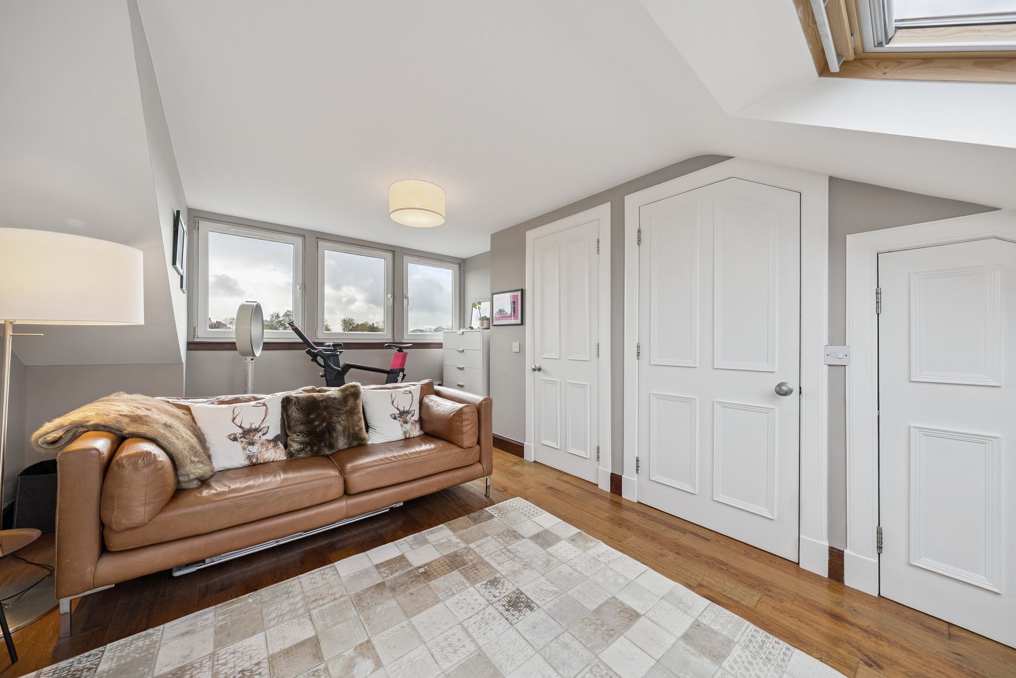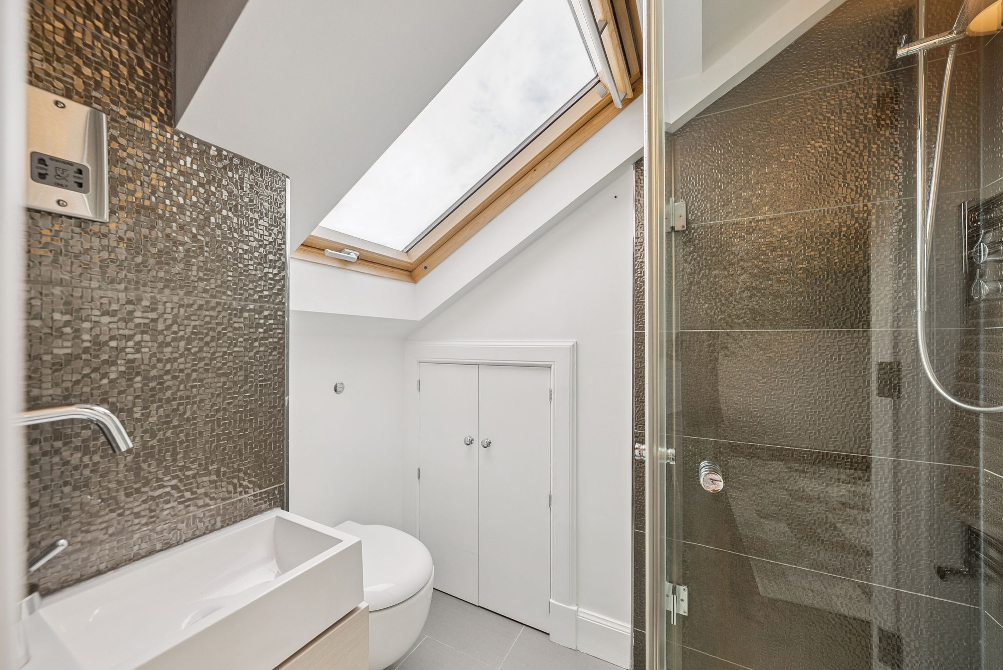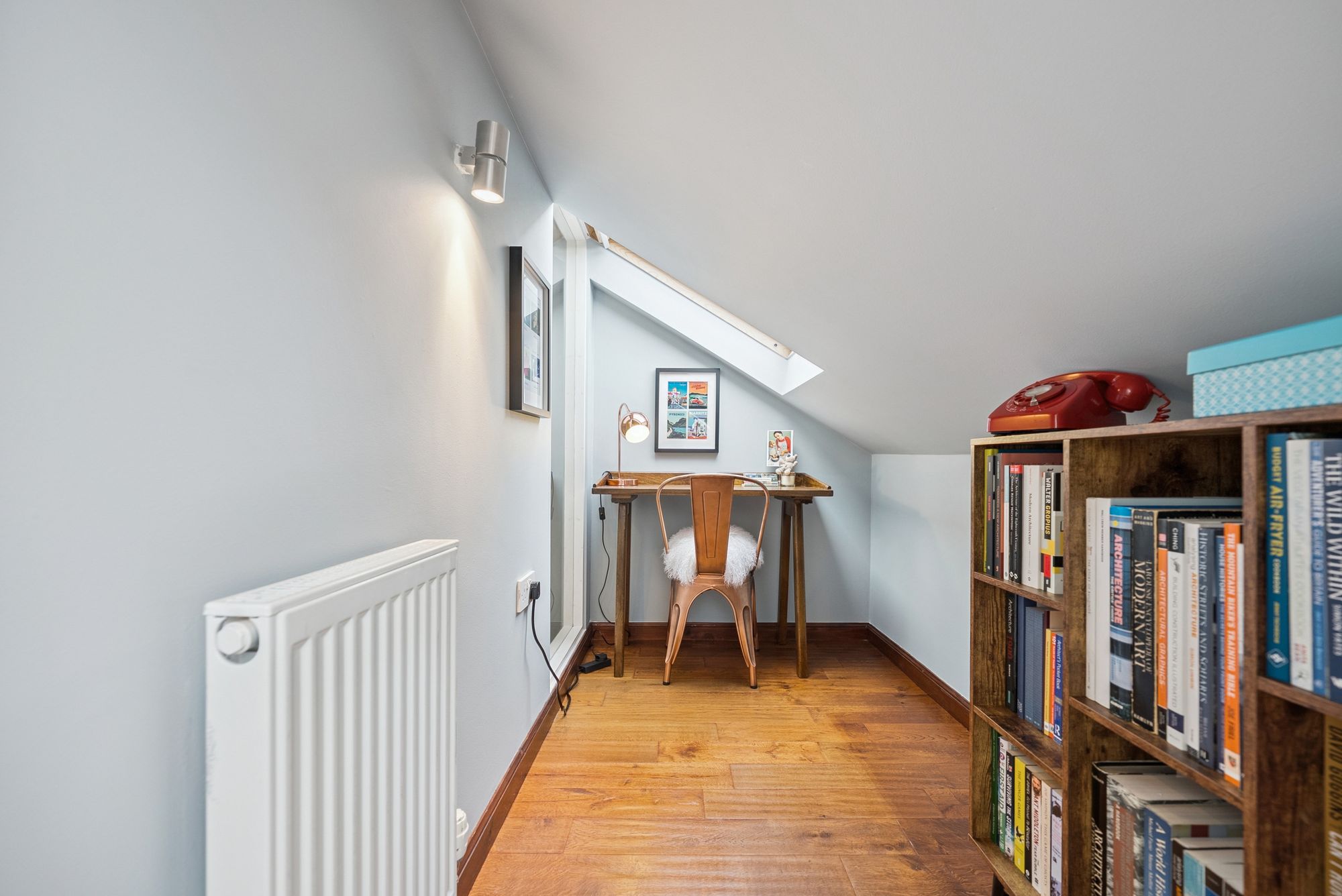 The loft conversion provides an exceptional fourth bedroom with dual aspect windows, a spacious walk in cupboard currently used as a home office, a modern en-suite shower room, and additional eaves storage. A Velux window at the top of the staircase allows light to flood the upper level, creating an airy and open feel throughout.