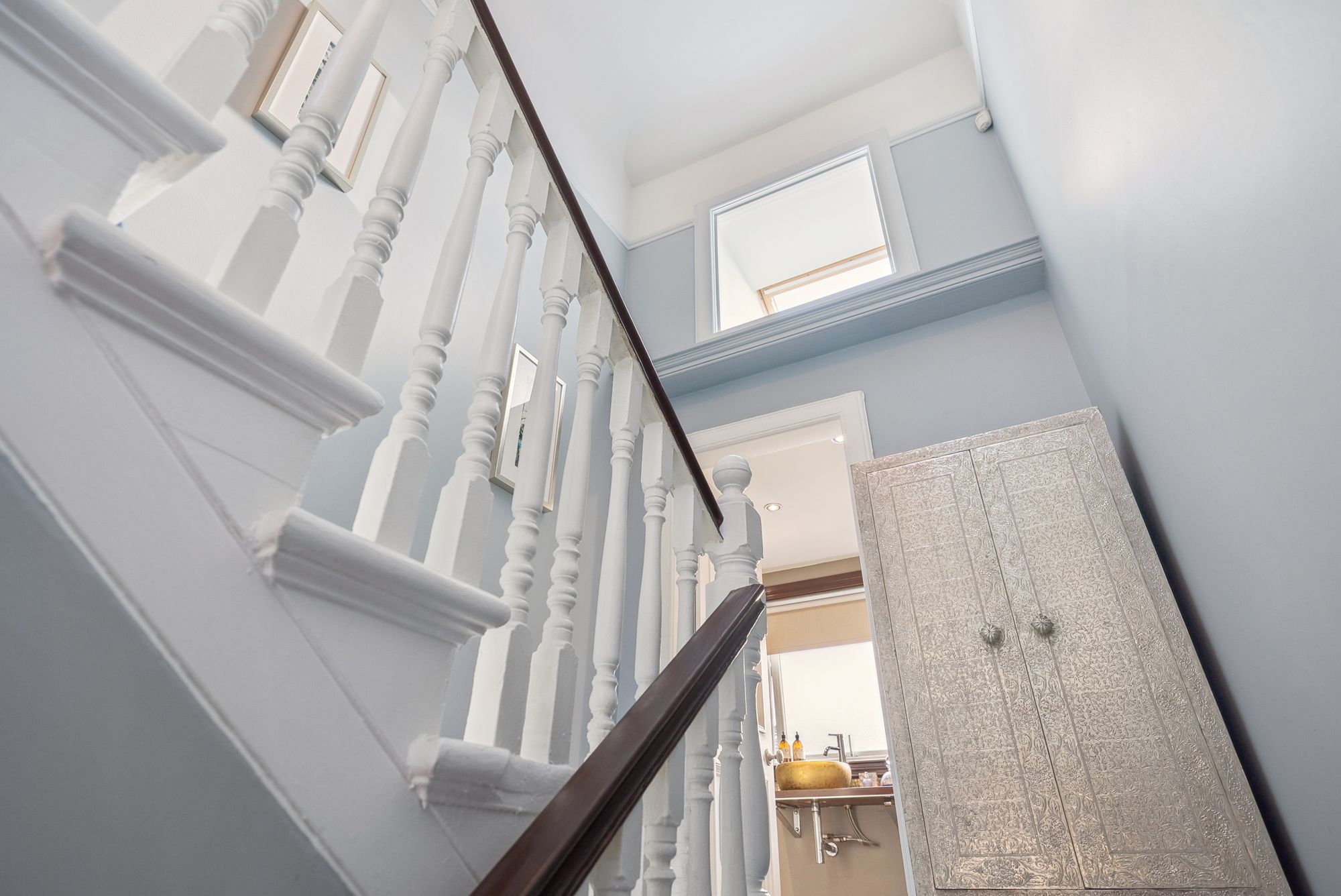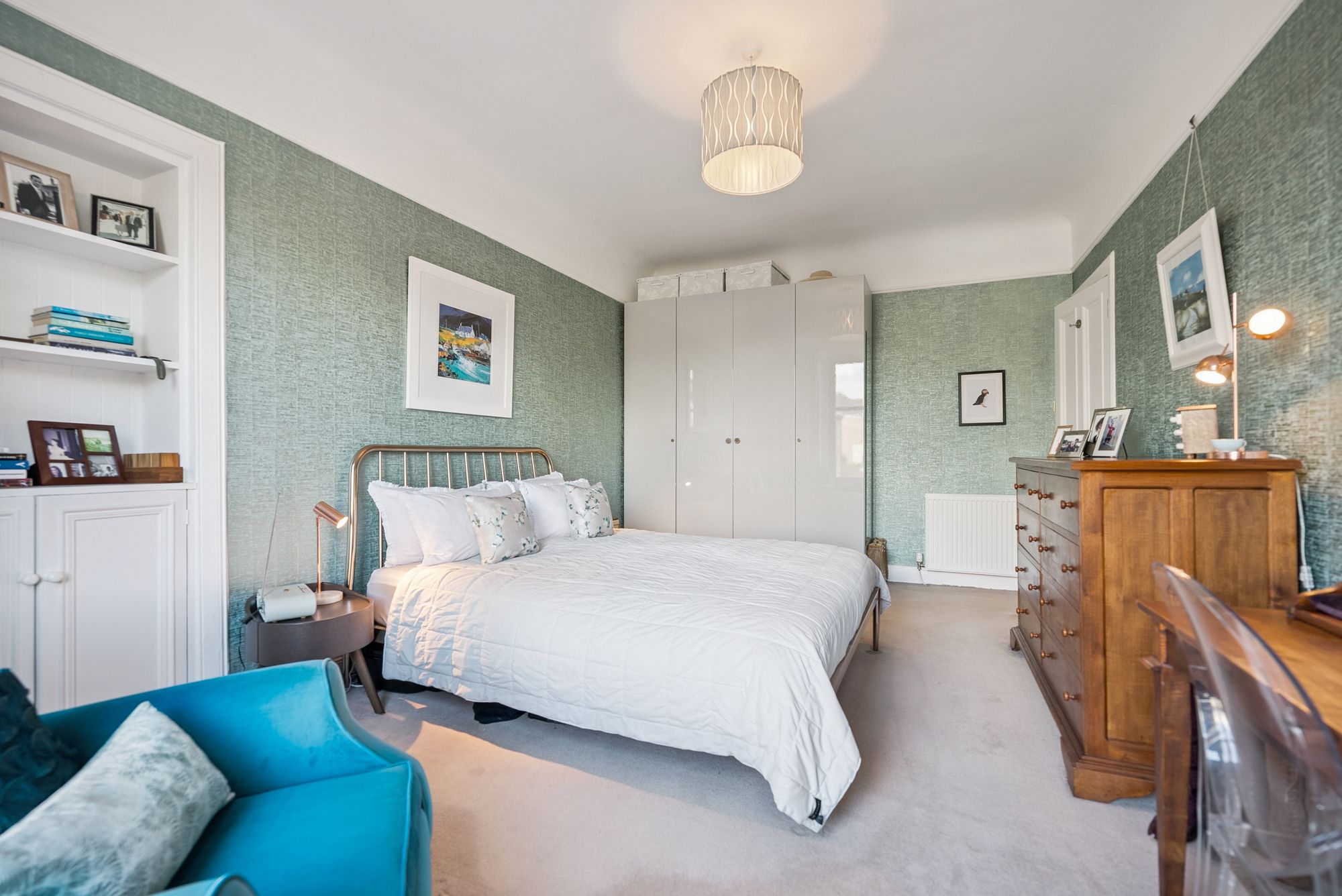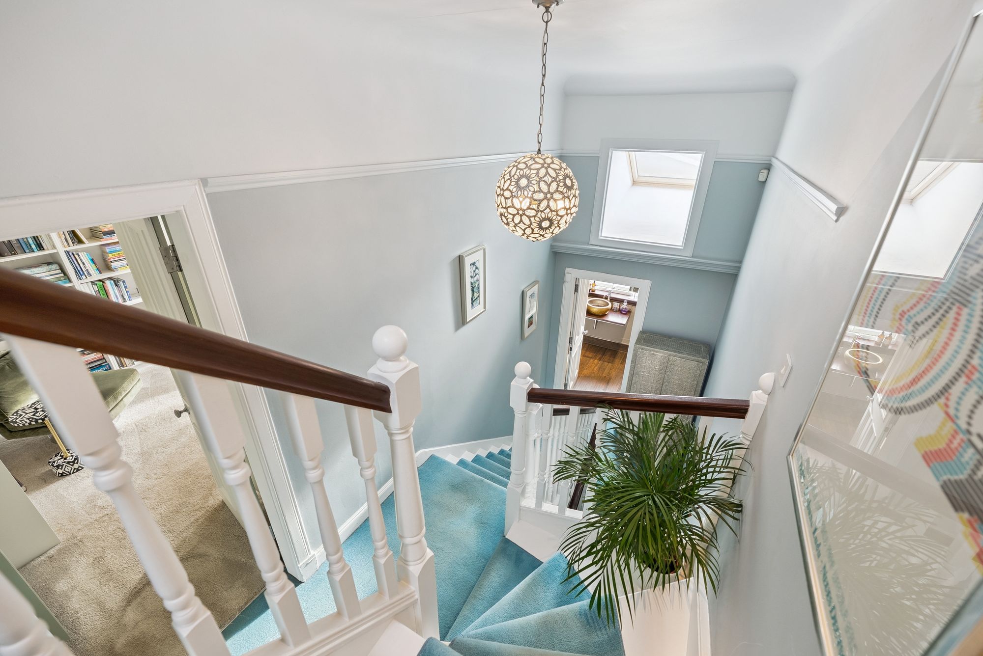 The loft conversion provides an exceptional fourth bedroom with dual aspect windows, a spacious walk in cupboard currently used as a home office, a modern en-suite shower room, and additional eaves storage. A Velux window at the top of the staircase allows light to flood the upper level, creating an airy and open feel throughout.