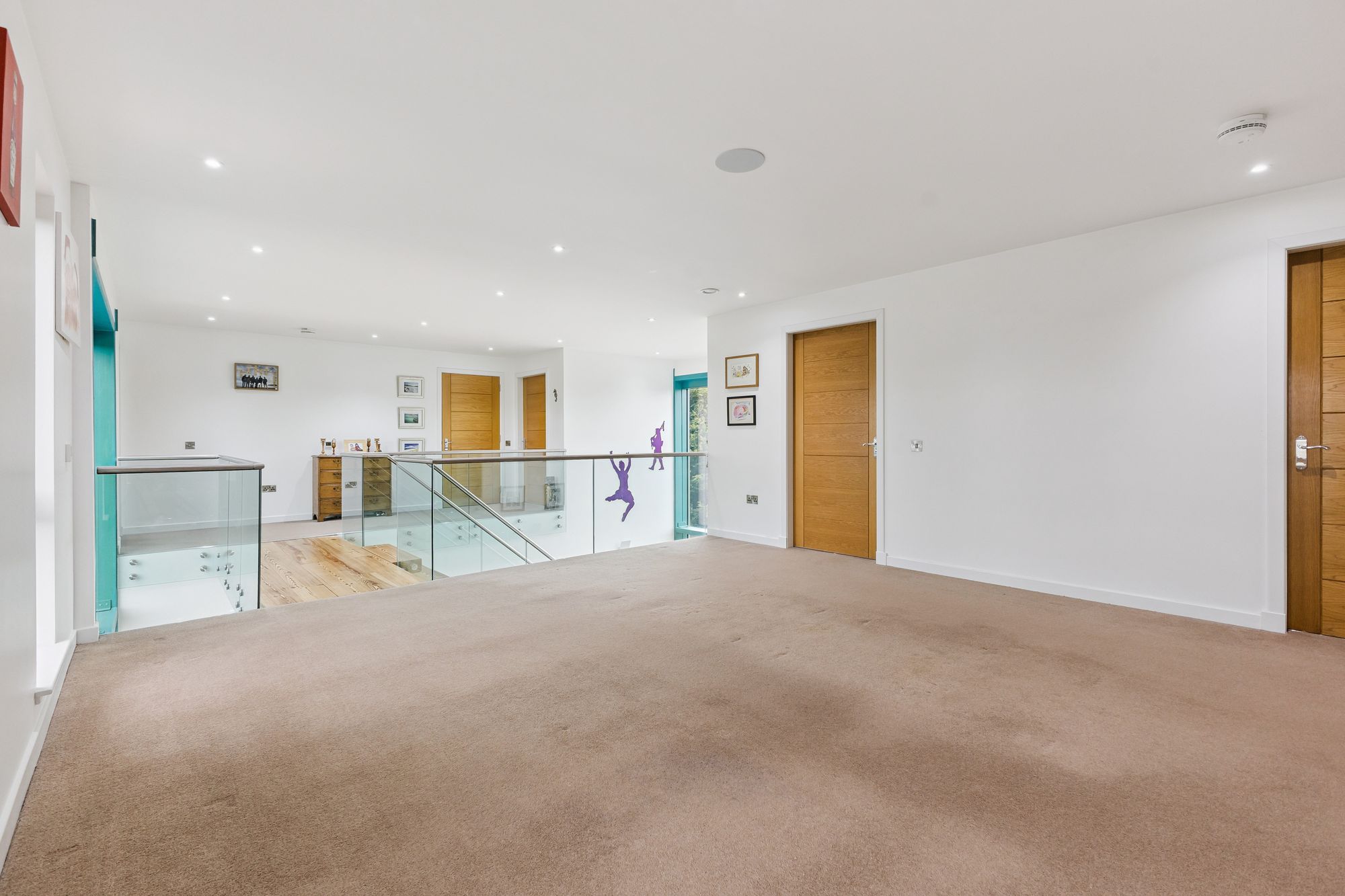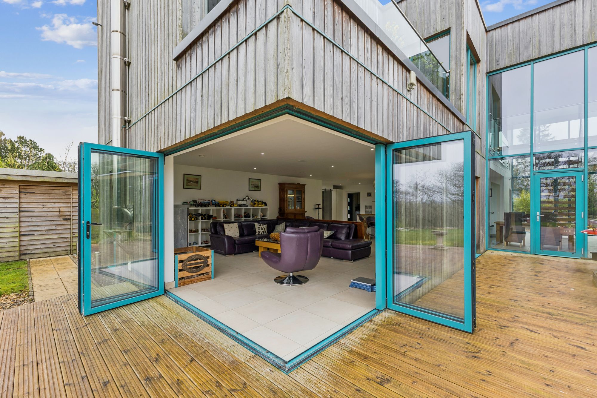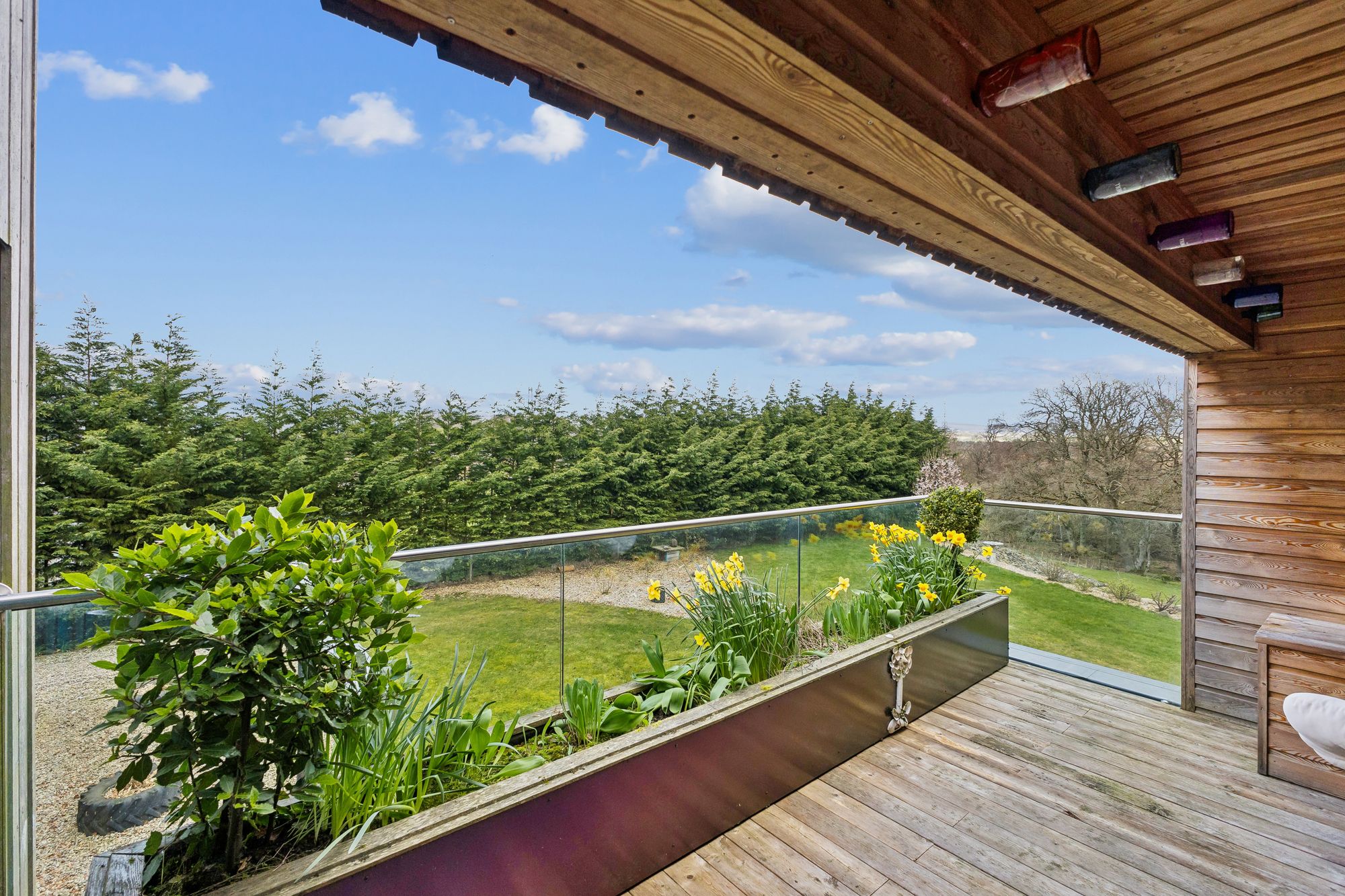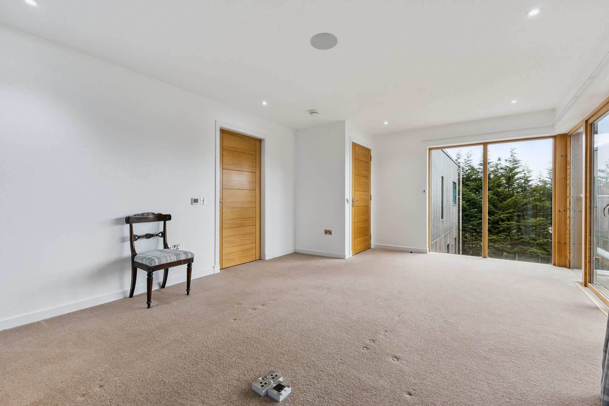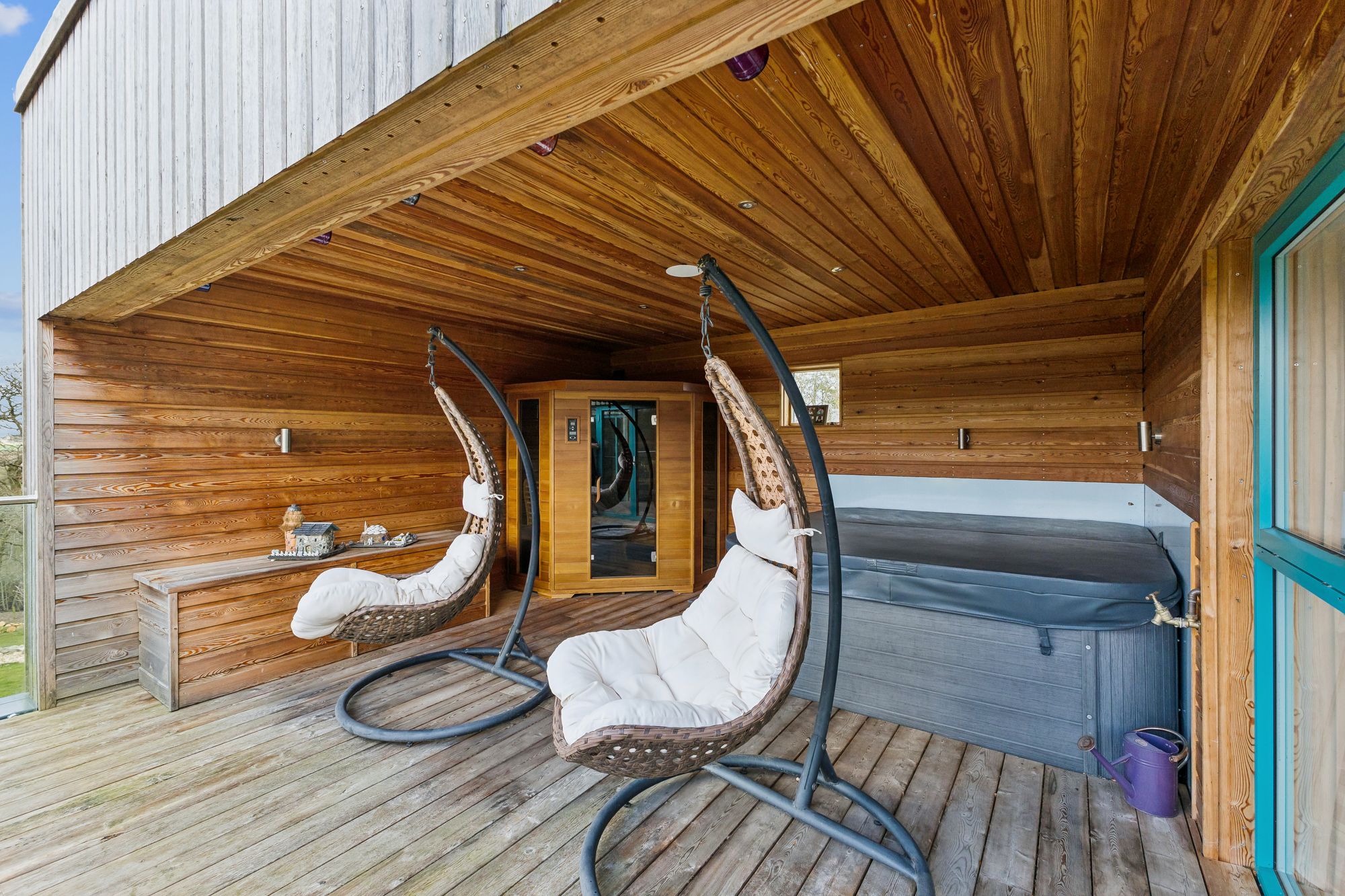 The staircase leads to a spacious landing, giving access to two double bedrooms and a family bathroom. The principal bedroom offers exceptional space and connects to a covered outdoor balcony, featuring a hot tub and sauna with views over the surrounding garden and countryside. A large dressing room with walk-in wardrobe and a stylish shower room complete the main suite. A unique chameleon cantilever-clad bedroom projects from the front façade of the house and benefits from its own en suite.