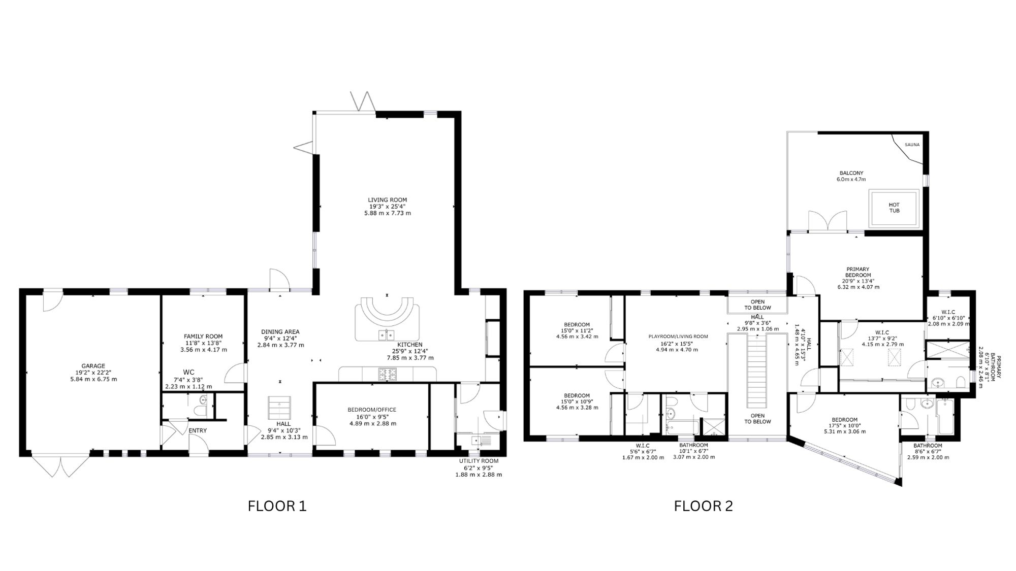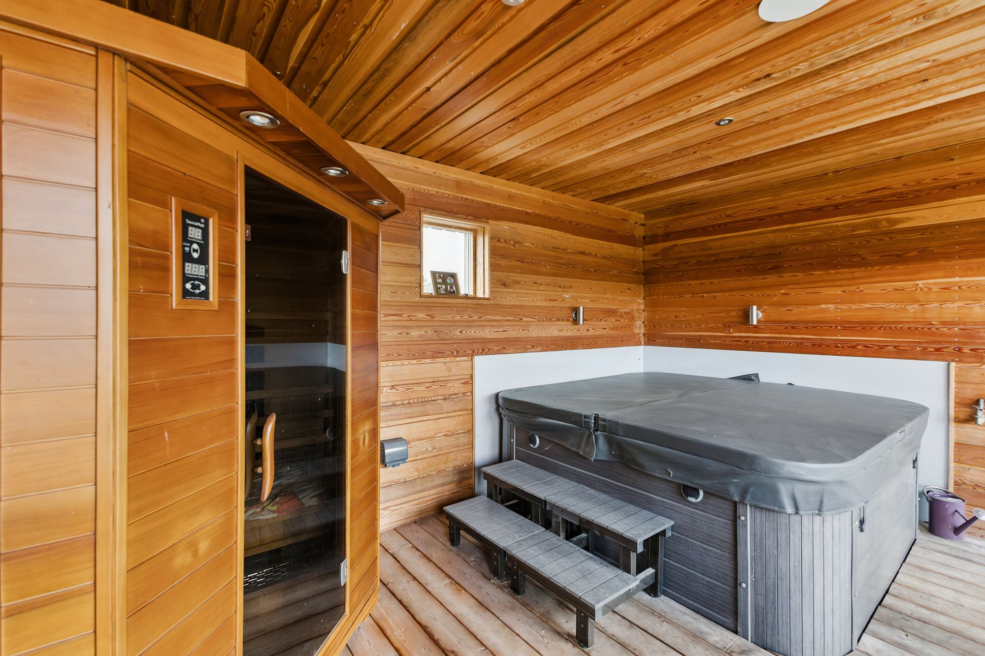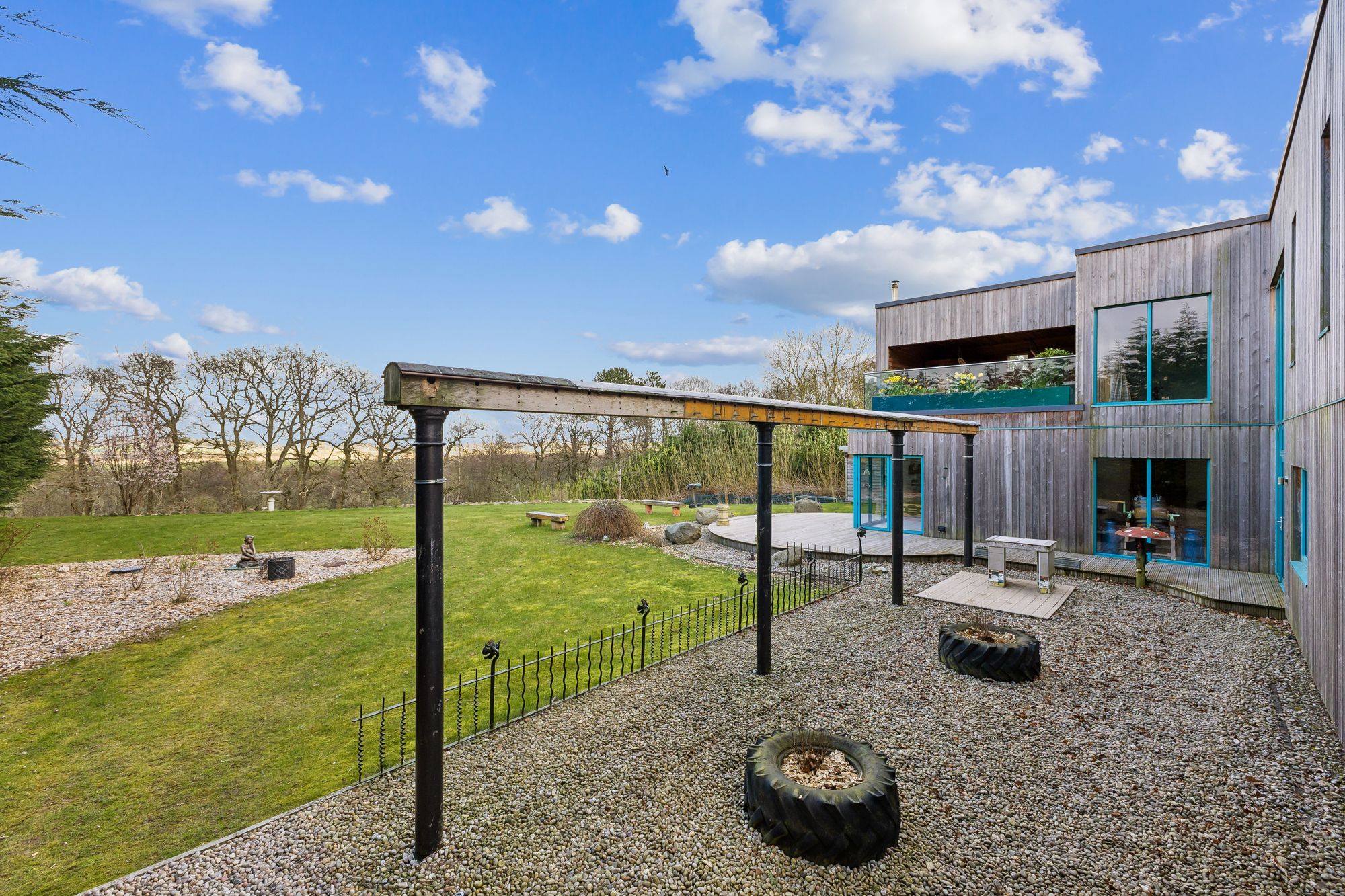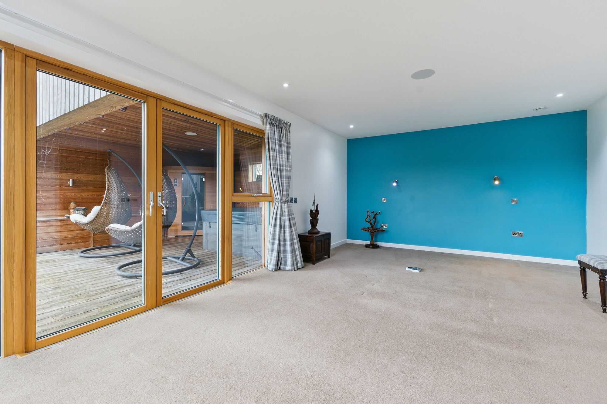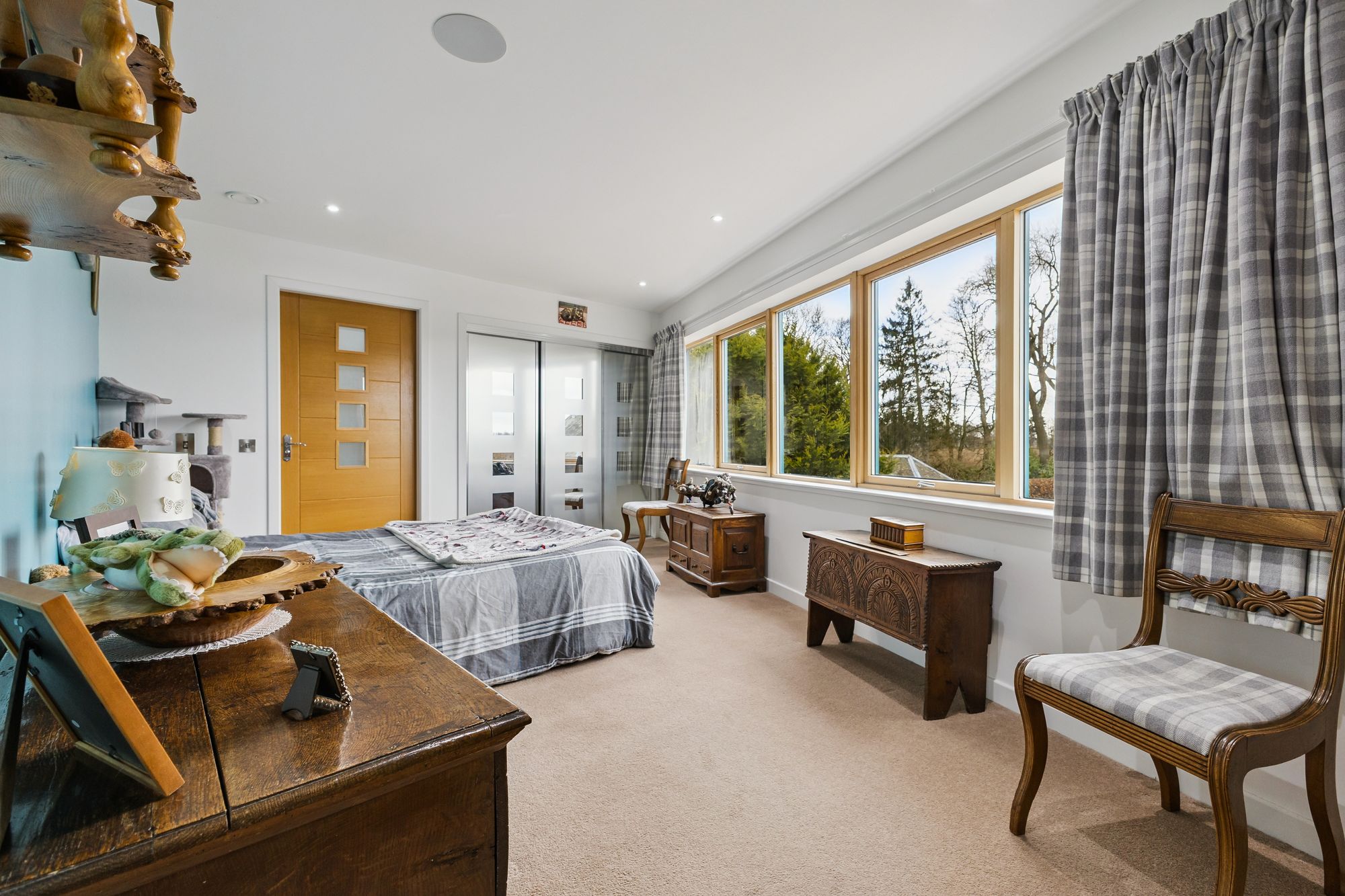 The staircase leads to a spacious landing, giving access to two double bedrooms and a family bathroom. The principal bedroom offers exceptional space and connects to a covered outdoor balcony, featuring a hot tub and sauna with views over the surrounding garden and countryside. A large dressing room with walk-in wardrobe and a stylish shower room complete the main suite. A unique chameleon cantilever-clad bedroom projects from the front façade of the house and benefits from its own en suite.