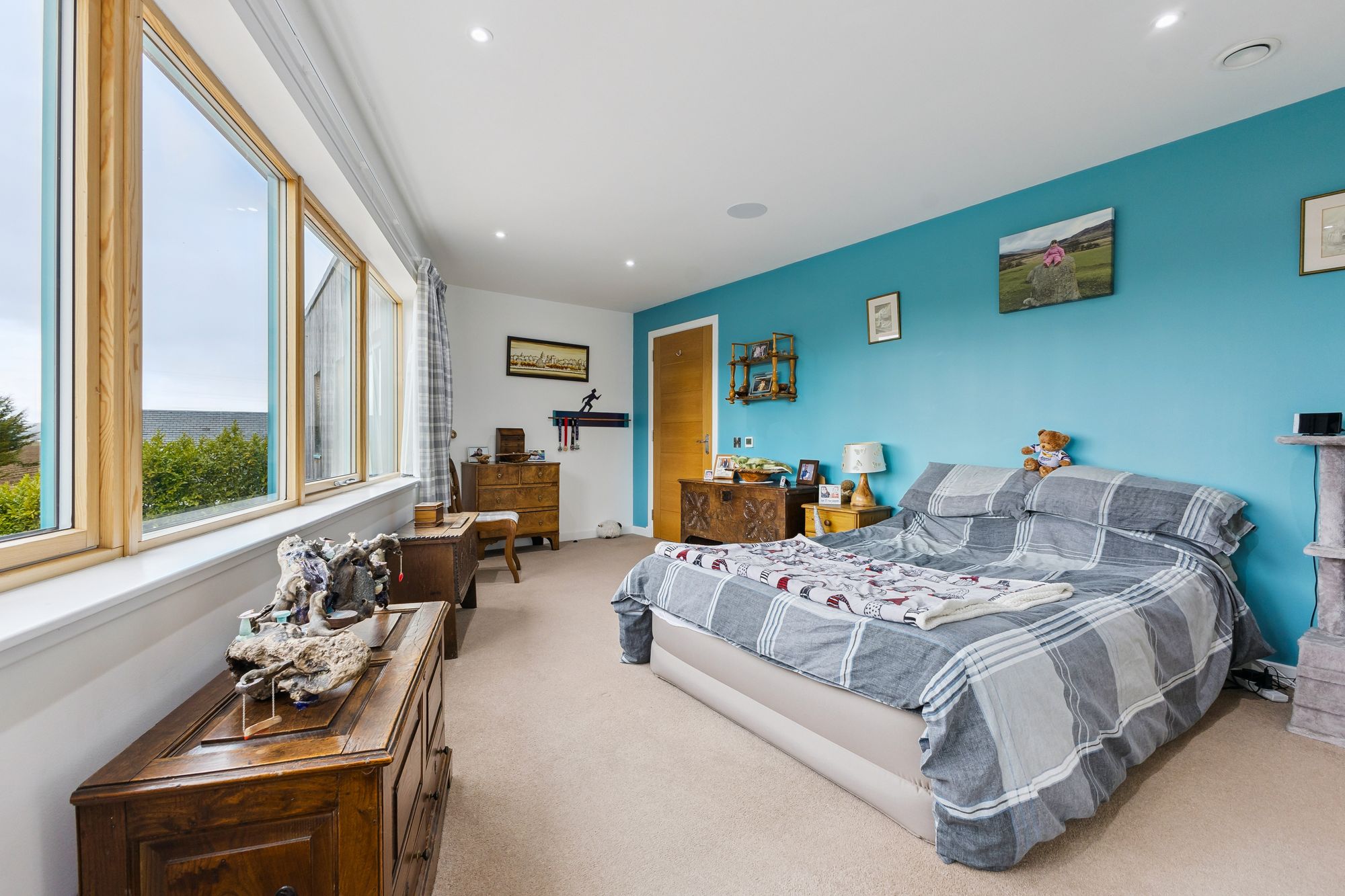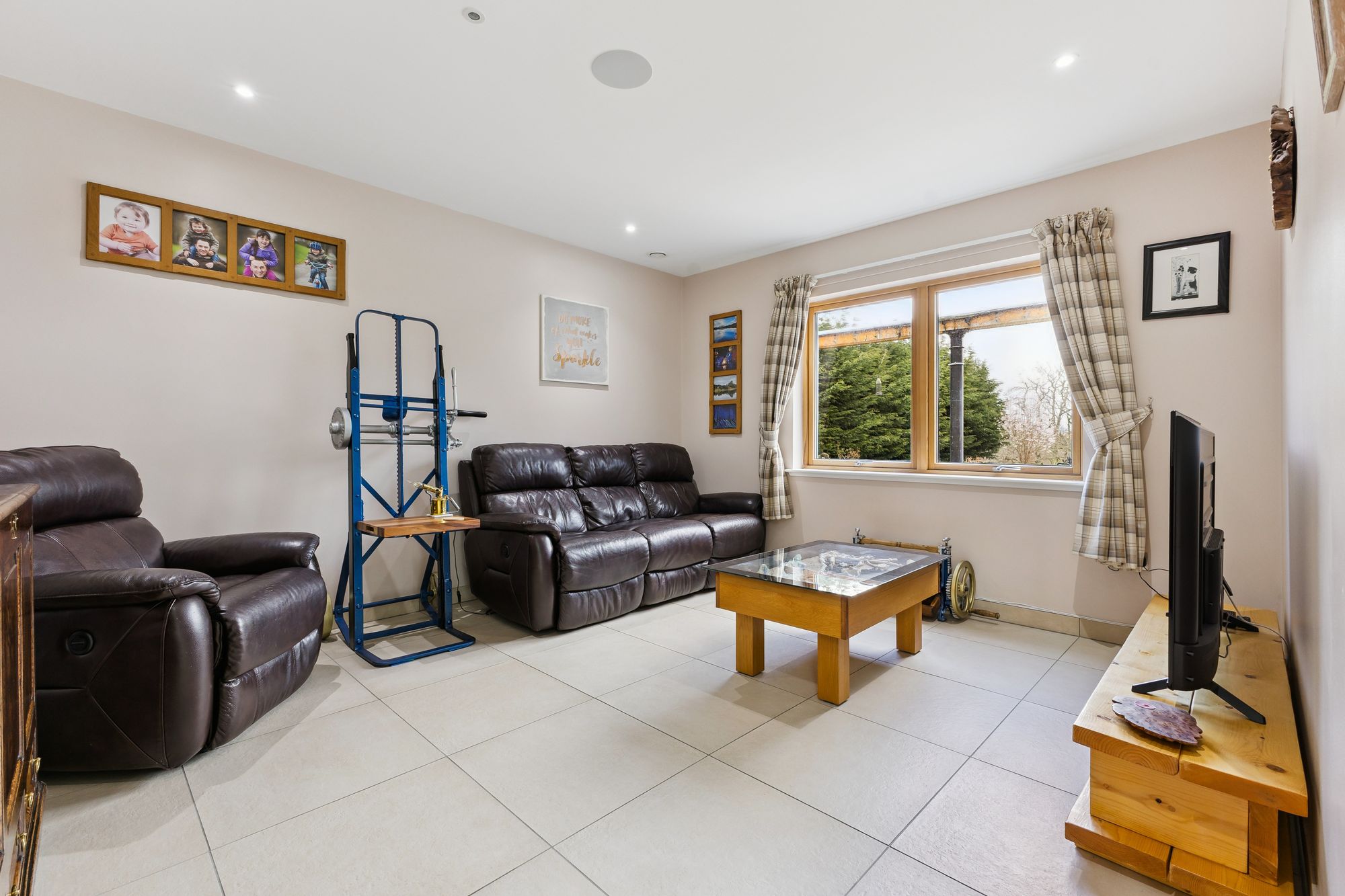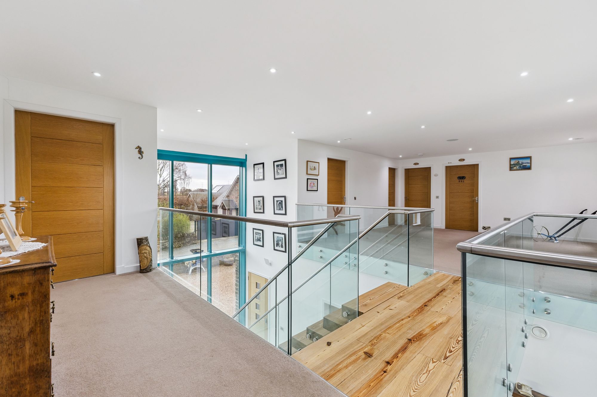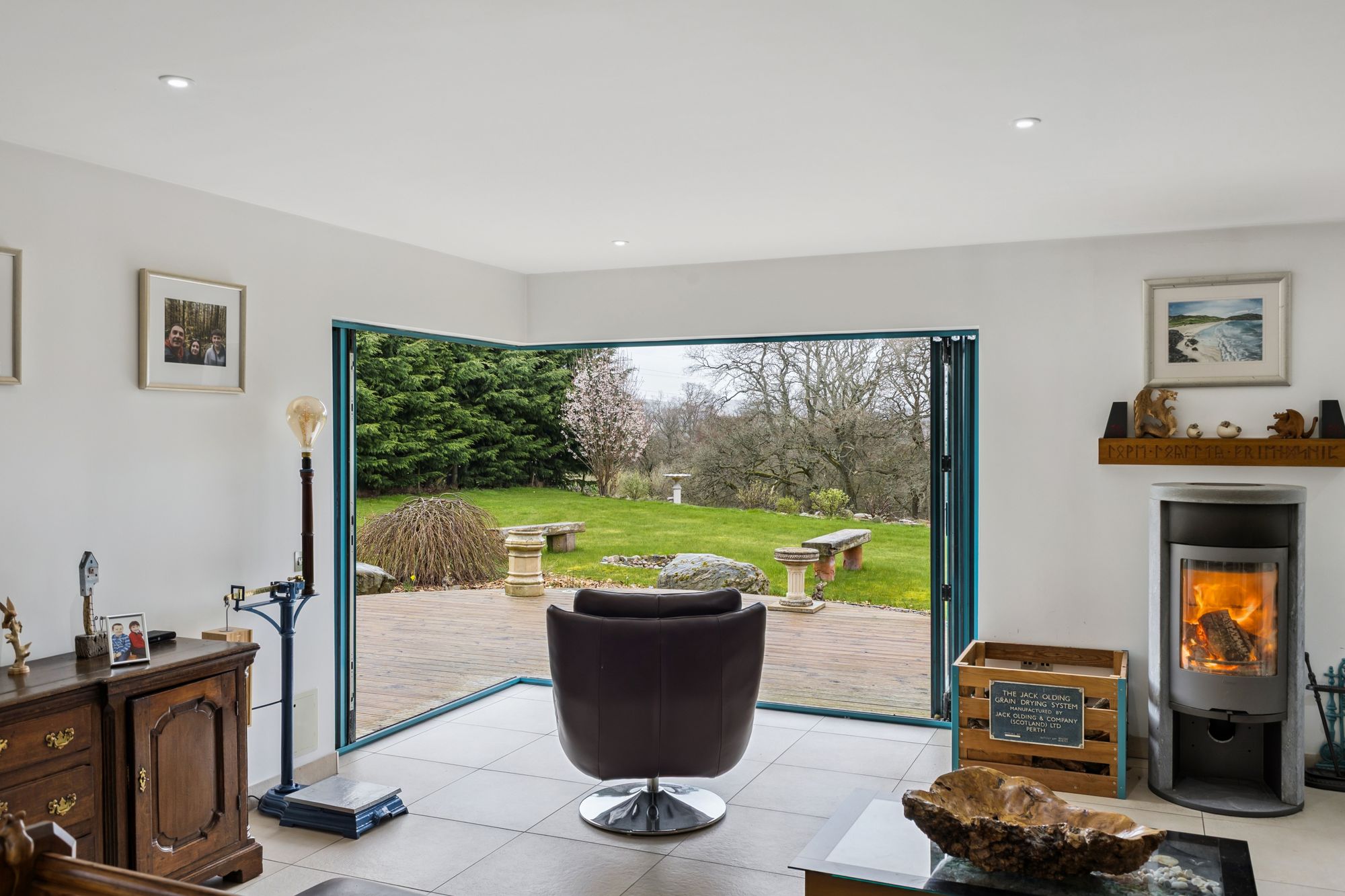The garden and grounds extend to just under an acre, providing a private and secure environment ideal for families. There is a fully insulated and heated double garage integrated within the ground floor of the house, offering excellent storage and practical workspace.