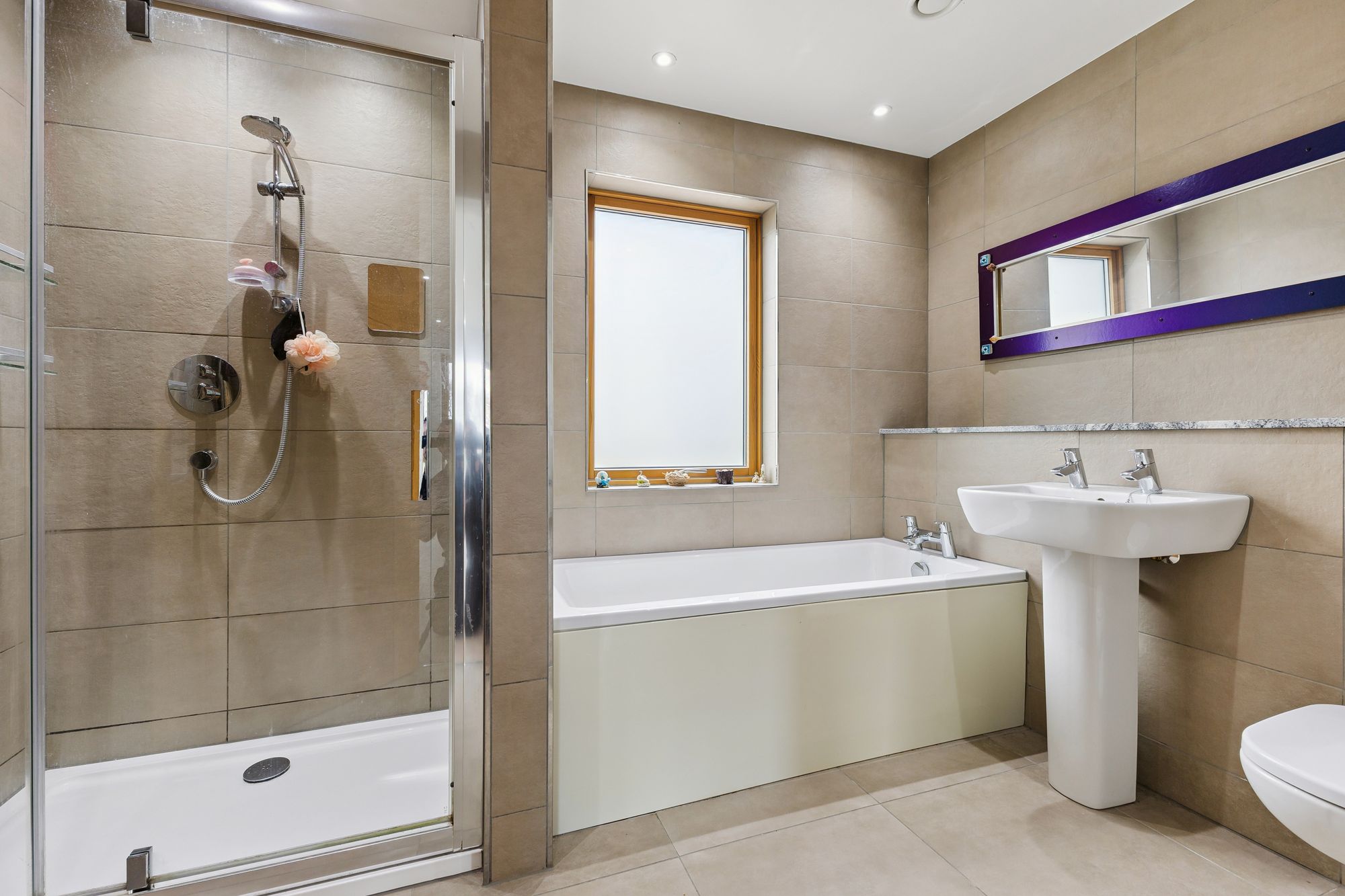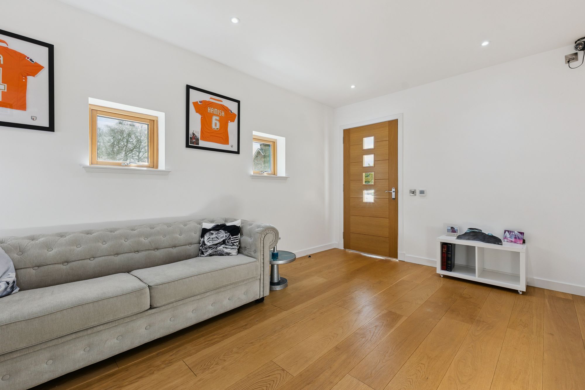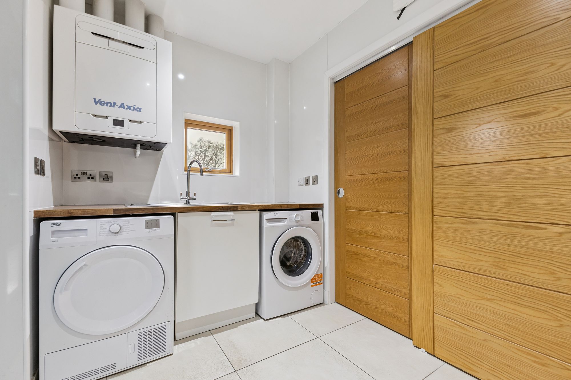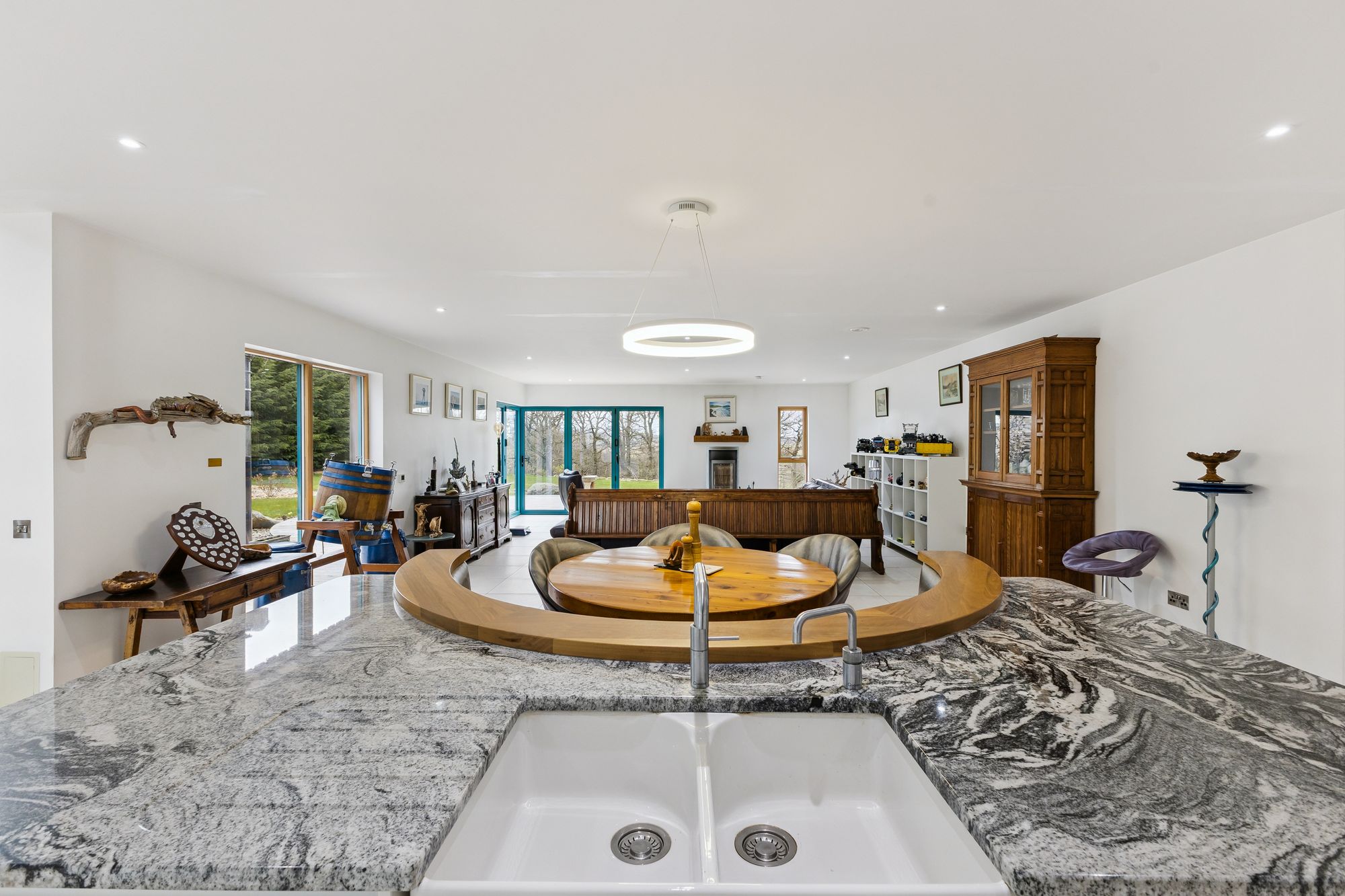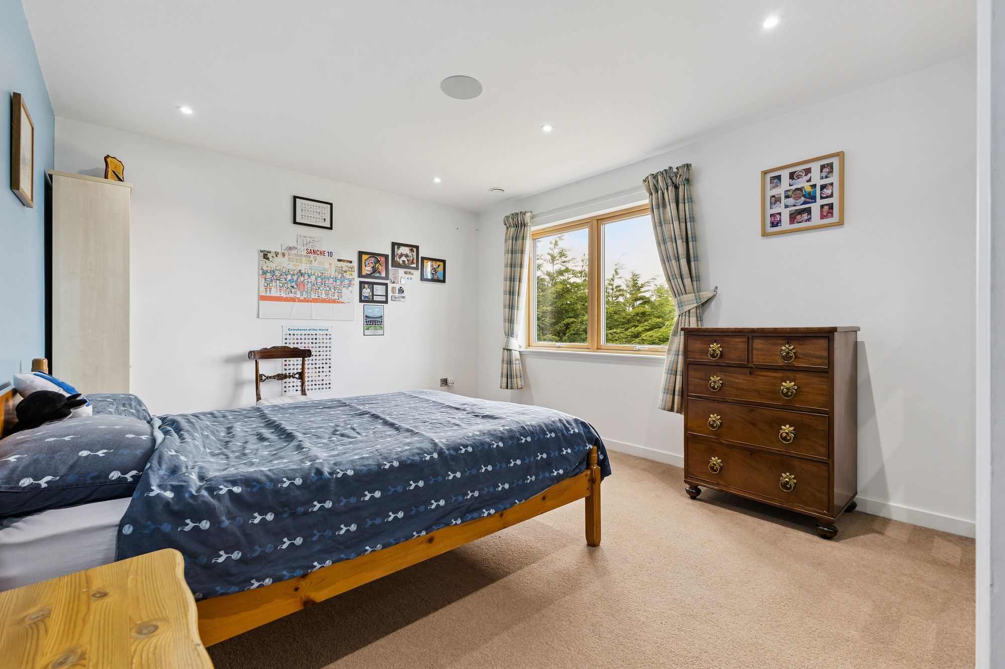 The garden and grounds extend to just under an acre, providing a private and secure environment ideal for families. There is a fully insulated and heated double garage integrated within the ground floor of the house, offering excellent storage and practical workspace.