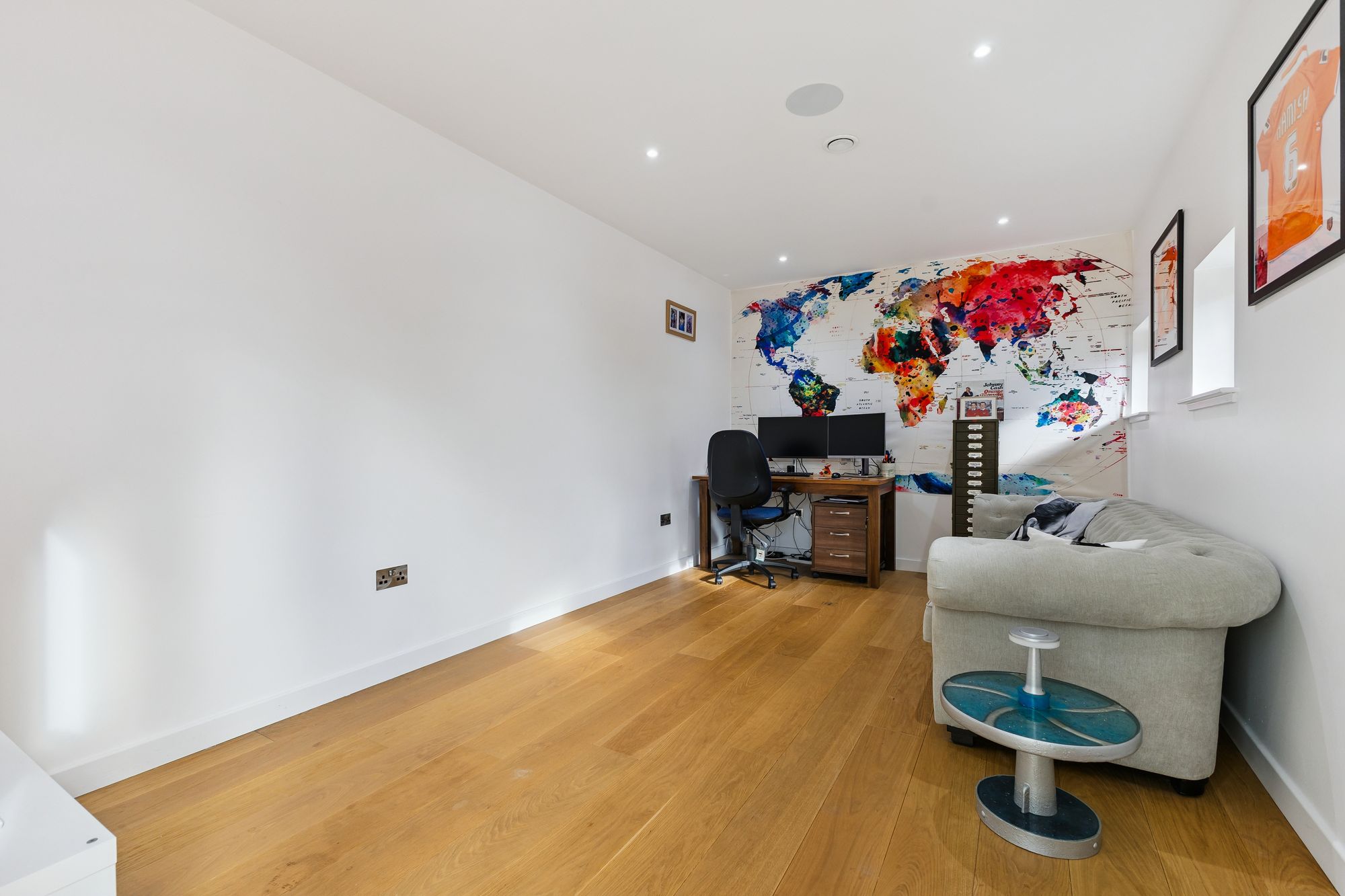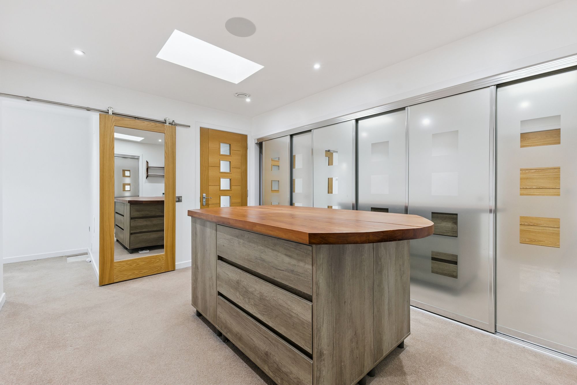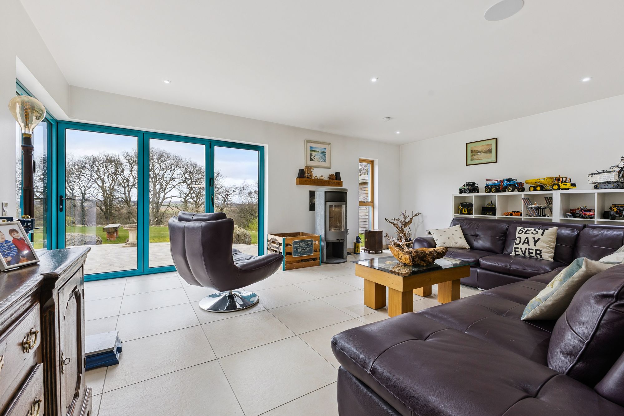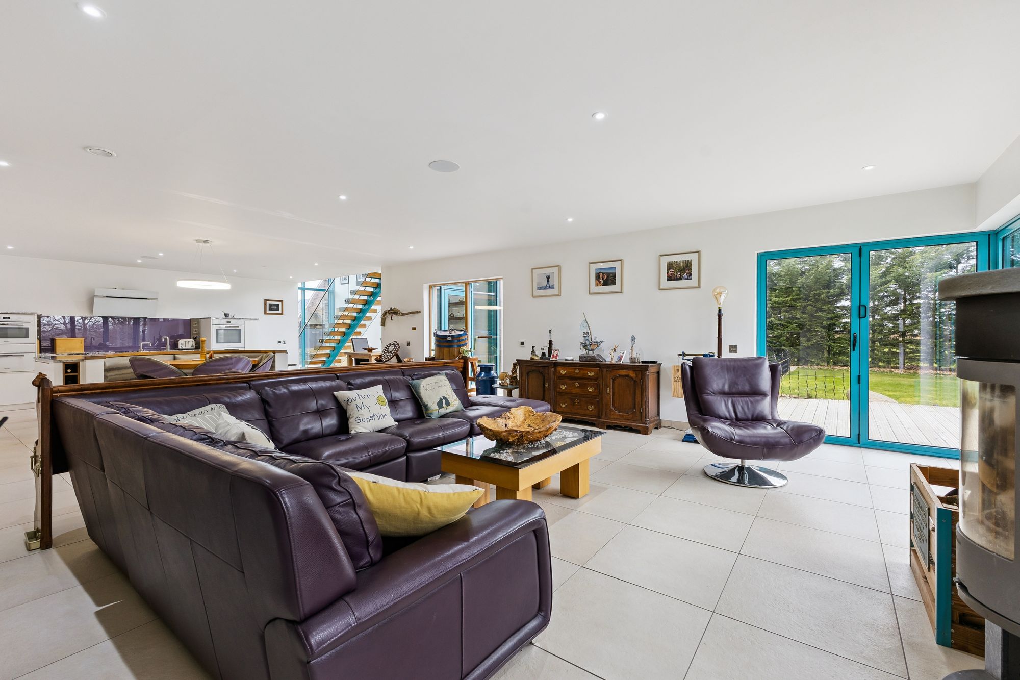 The impressive open-plan living space incorporates a fully integrated kitchen, dining area, pantry, and large living area overlooking the rear garden. Unrestricted bi-fold sliding doors open up the entire corner of the house, seamlessly connecting the interior to the decking area, further enhanced by an 8kW wood-burning stove. There is also a separate utility room with a door providing external access. Completing the ground floor accommodation is a family room and a downstairs bedroom, currently used as a home office.