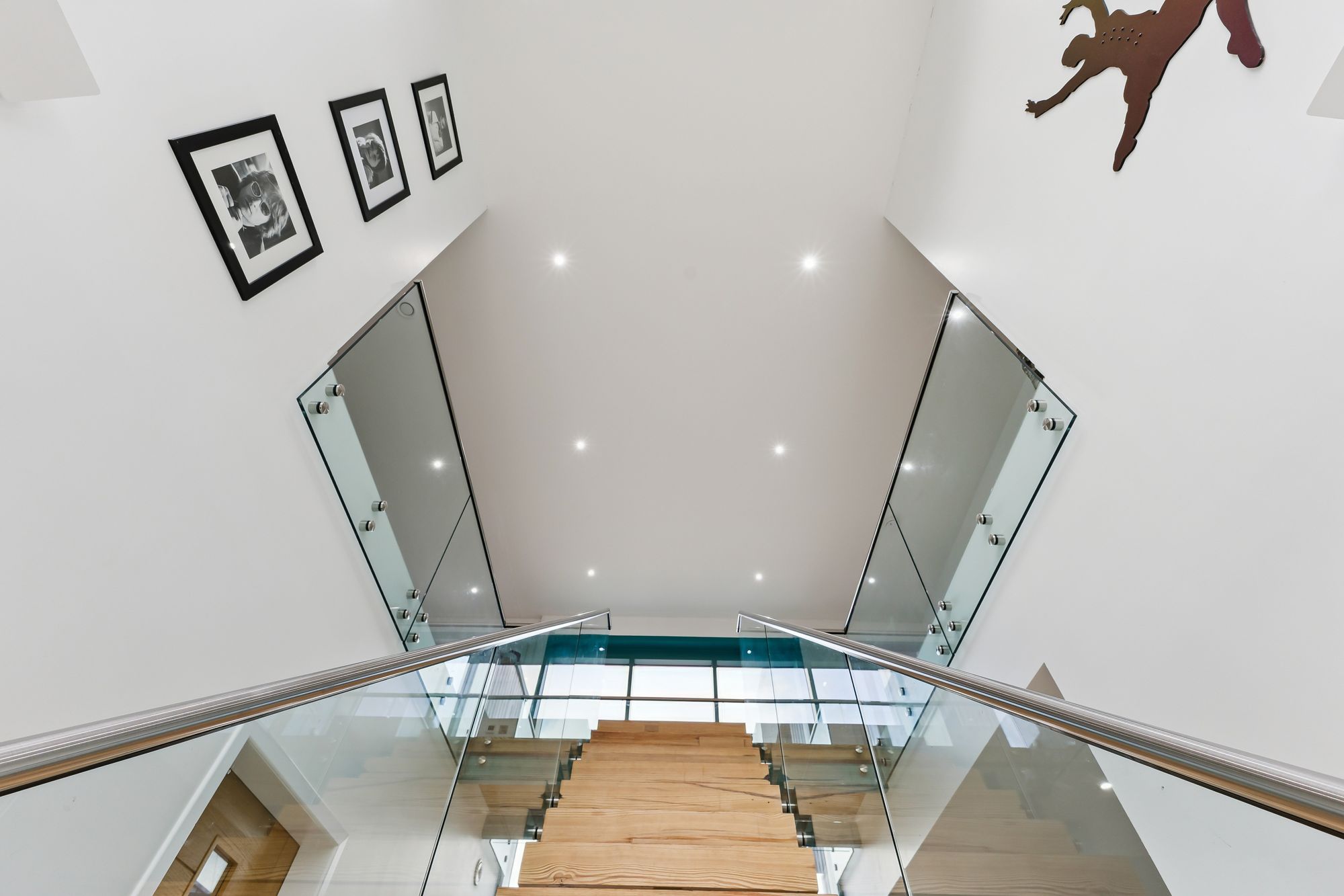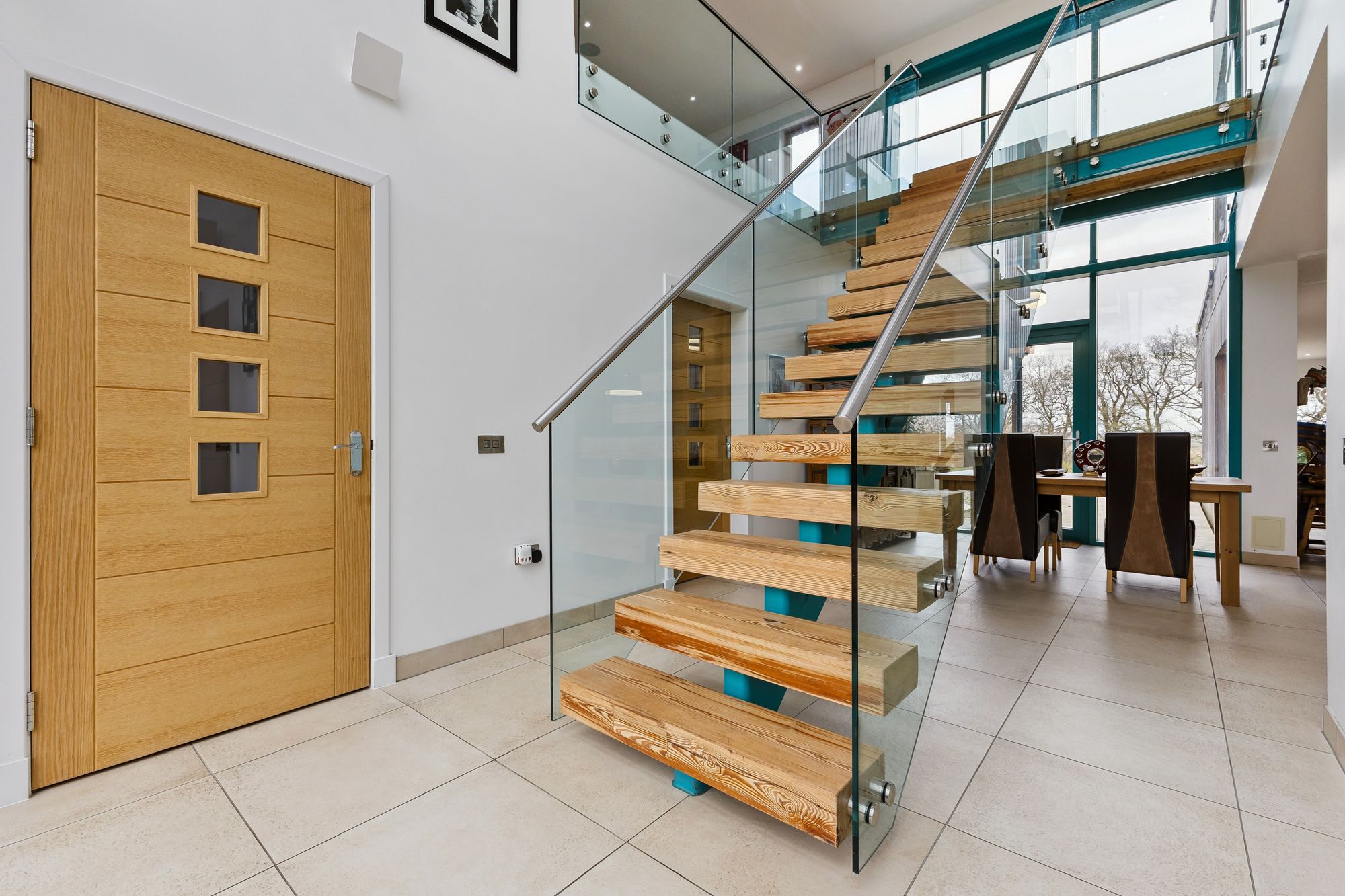 The house is approached by a large gravel driveway bordered by a stone wall, leading to the front door with entrance vestibule and downstairs WC. The hallway features a steel and solid timber tread staircase with a glazed balustrade leading to the upper level.