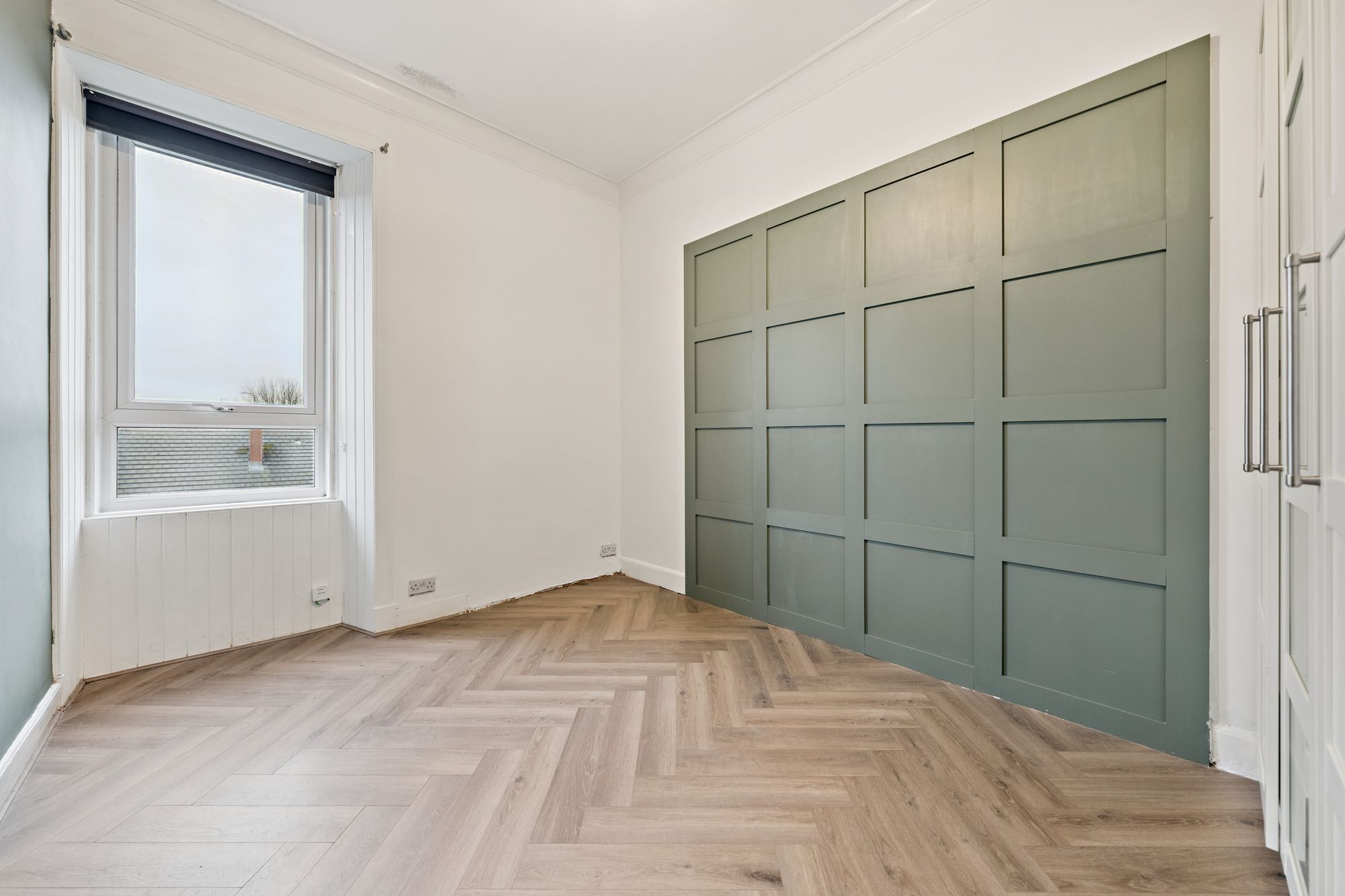 The accommodation comprises a welcoming entrance hallway, a generous rear-facing double bedroom with ample space for freestanding storage, and a superb bay-windowed lounge which benefits from a bright open outlook. The dining-sized kitchen is modern and well-equipped, featuring a range of base and wall mounted units, integrated appliances, and excellent space for dining and entertaining. A large walk-in box room, accessed from the kitchen, provides valuable additional flexibility and could be utilised as a home office, occasional guest room, or further storage.