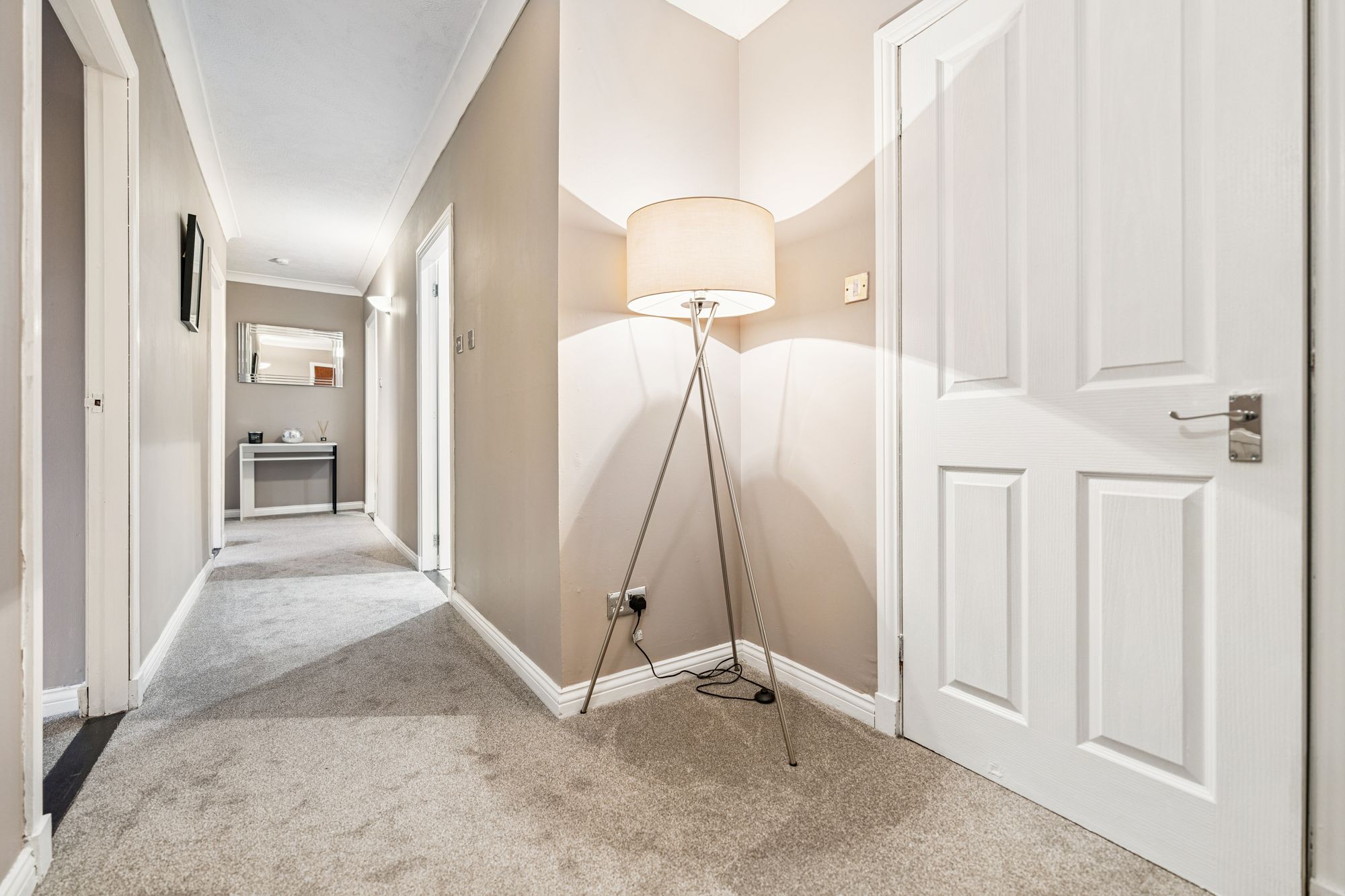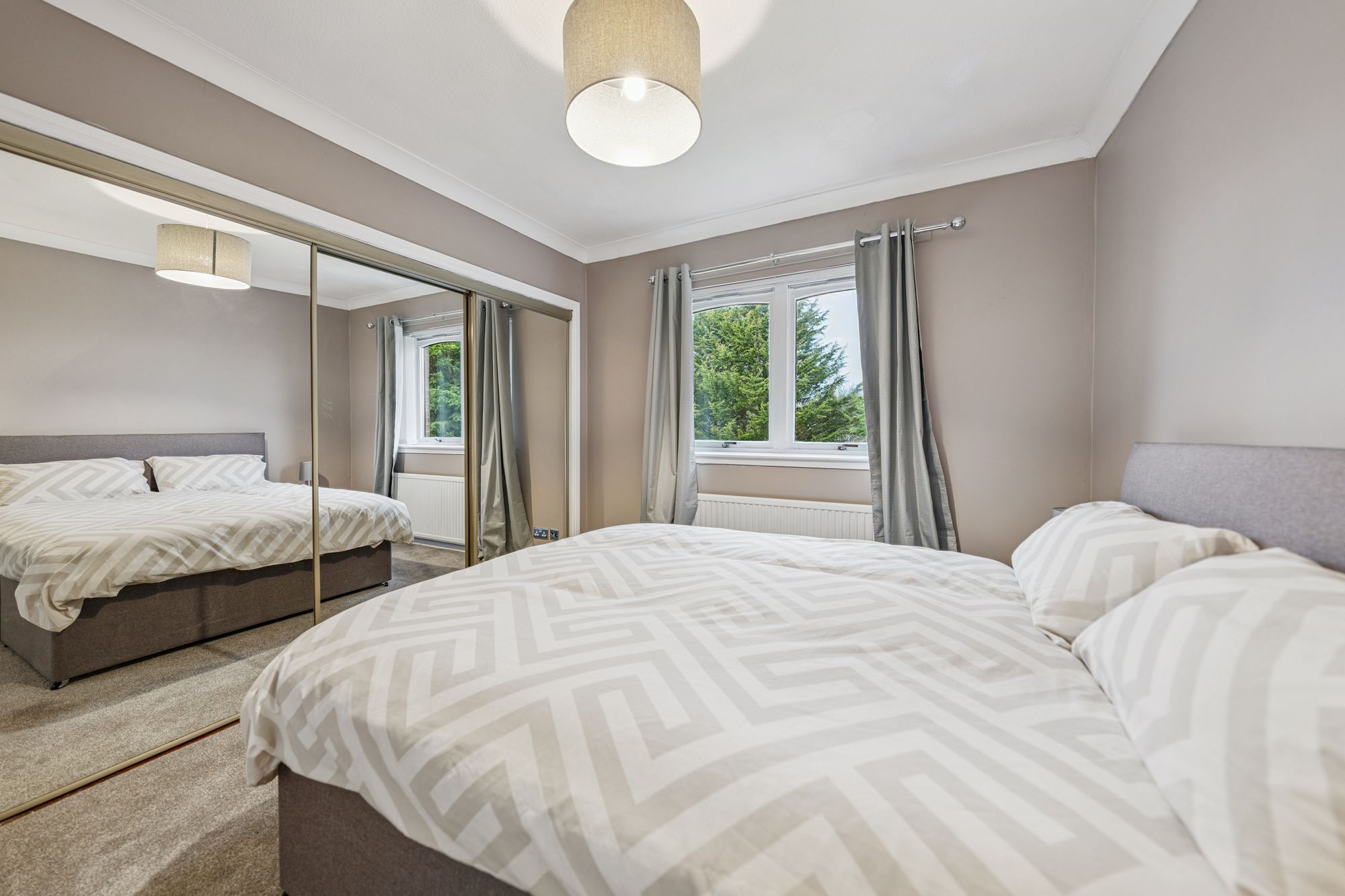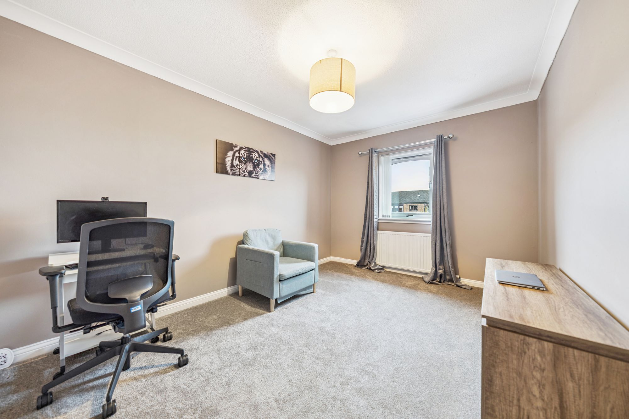 There are two generous double bedrooms. The impressive principal bedroom benefits from integrated wardrobes with sliding mirrored doors and a beautifully finished en-suite shower room. The second double bedroom, positioned to the front of the property, offers excellent proportions and flexibility and is currently utilised as a stylish home office. Completing the accommodation is a well-appointed main bathroom, fitted with a three-piece suite and shower over the bath.