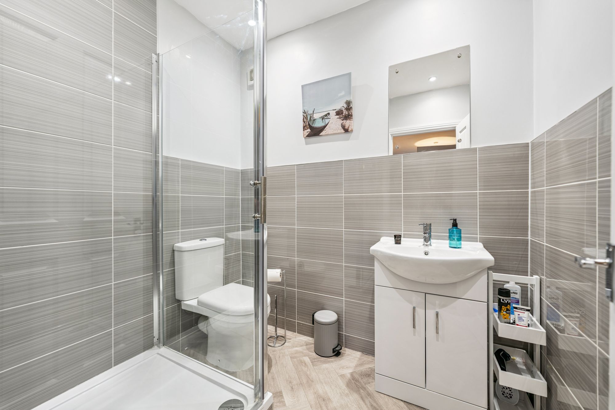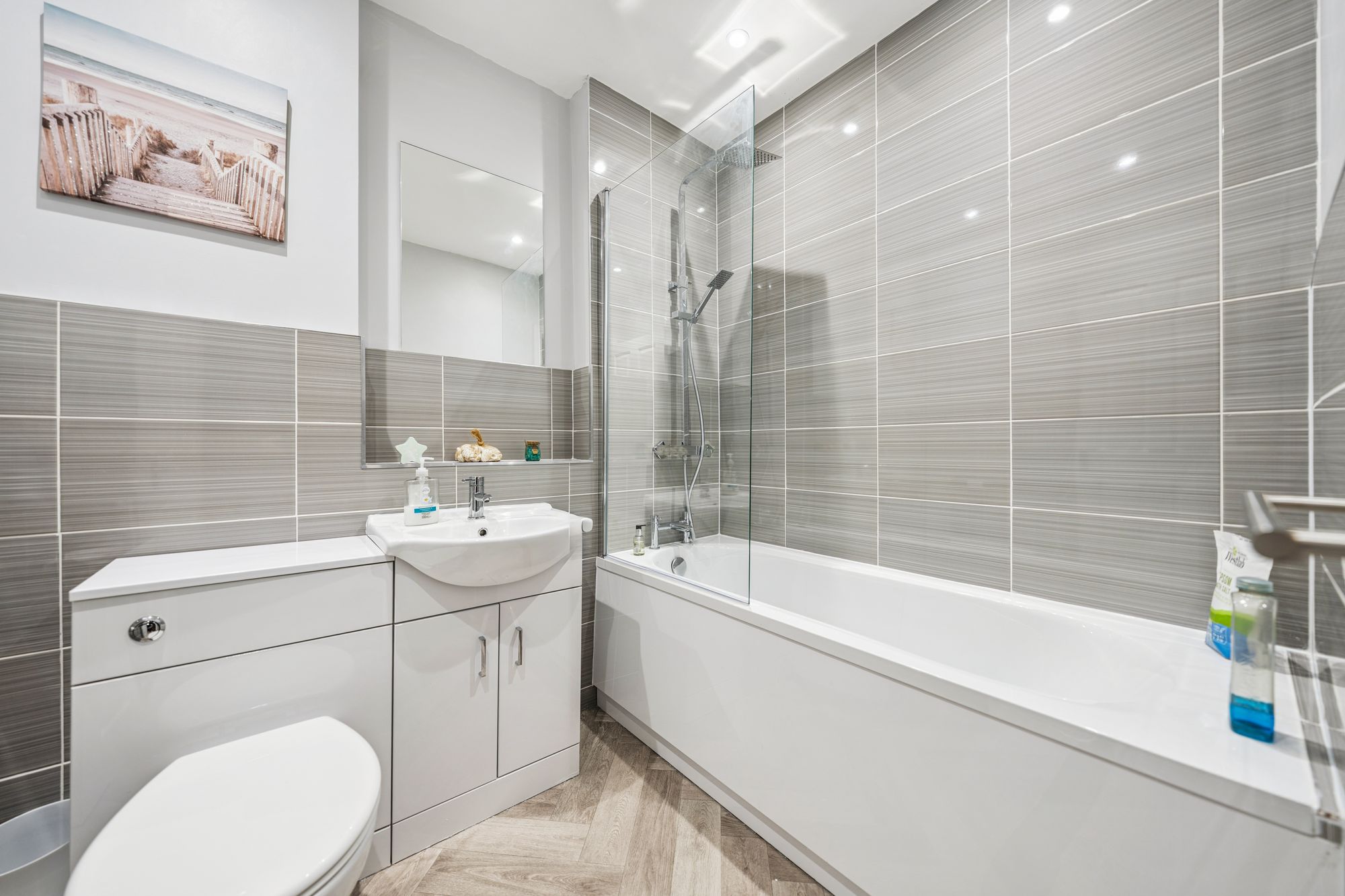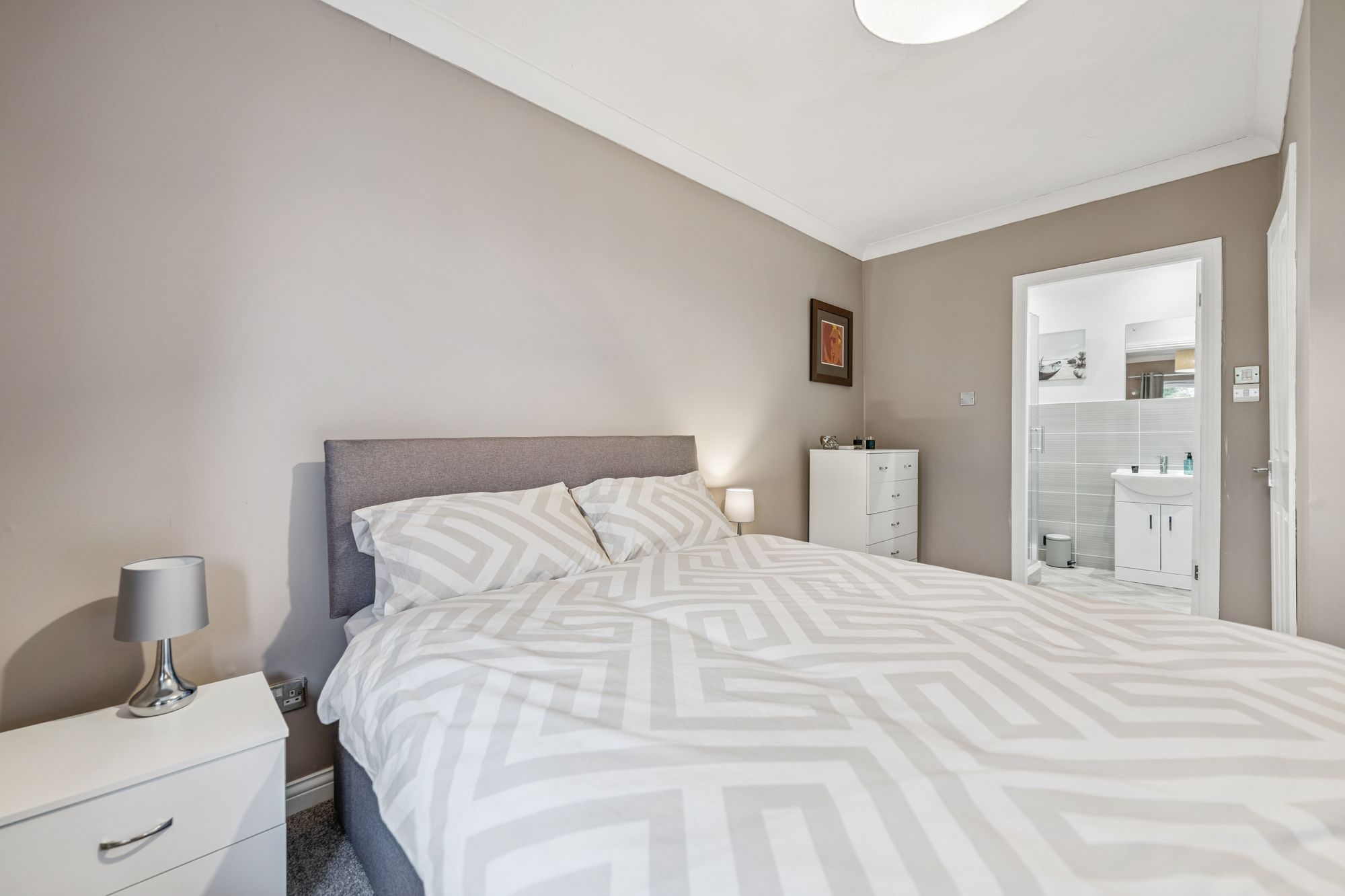 There are two generous double bedrooms. The impressive principal bedroom benefits from integrated wardrobes with sliding mirrored doors and a beautifully finished en-suite shower room. The second double bedroom, positioned to the front of the property, offers excellent proportions and flexibility and is currently utilised as a stylish home office. Completing the accommodation is a well-appointed main bathroom, fitted with a three-piece suite and shower over the bath.