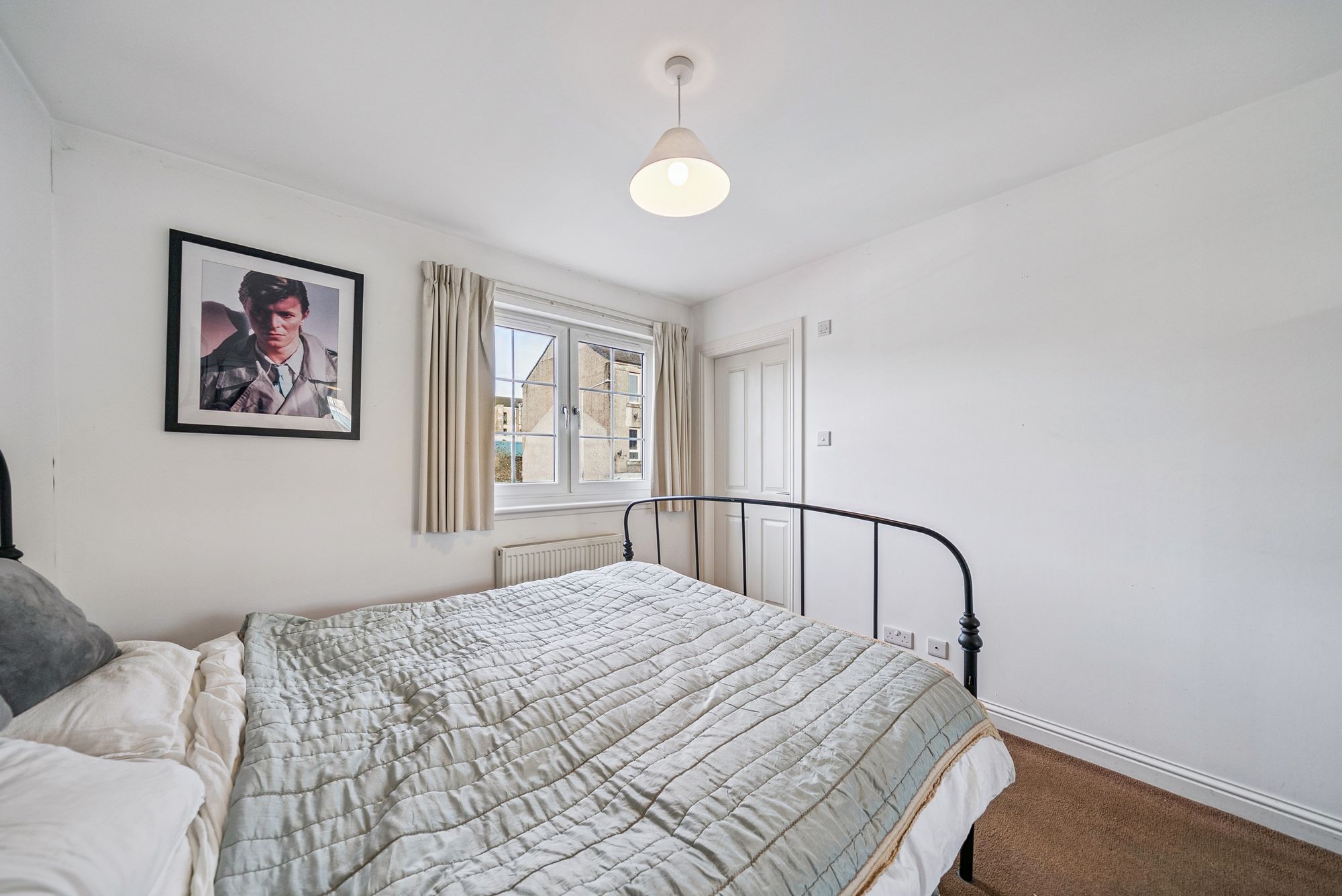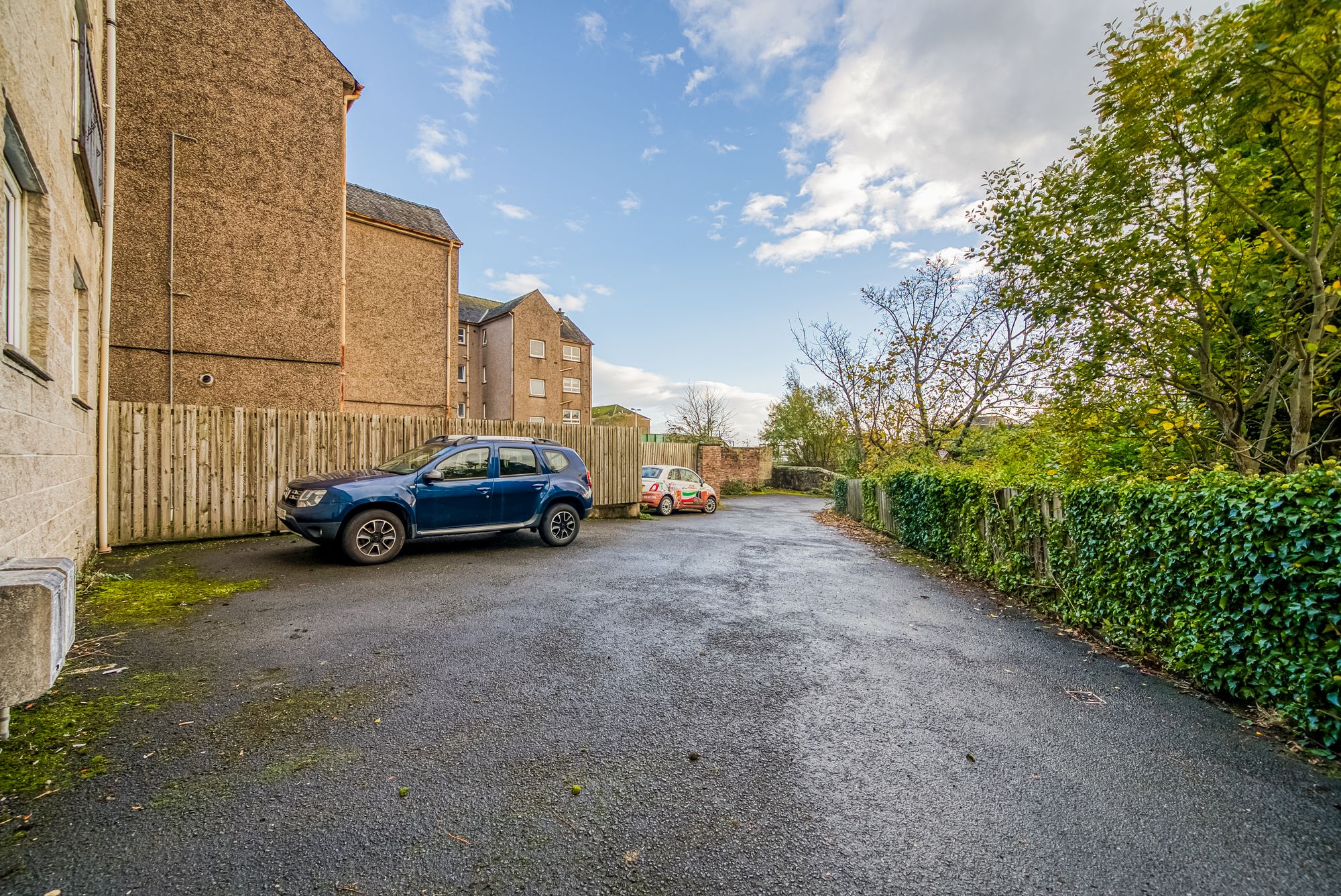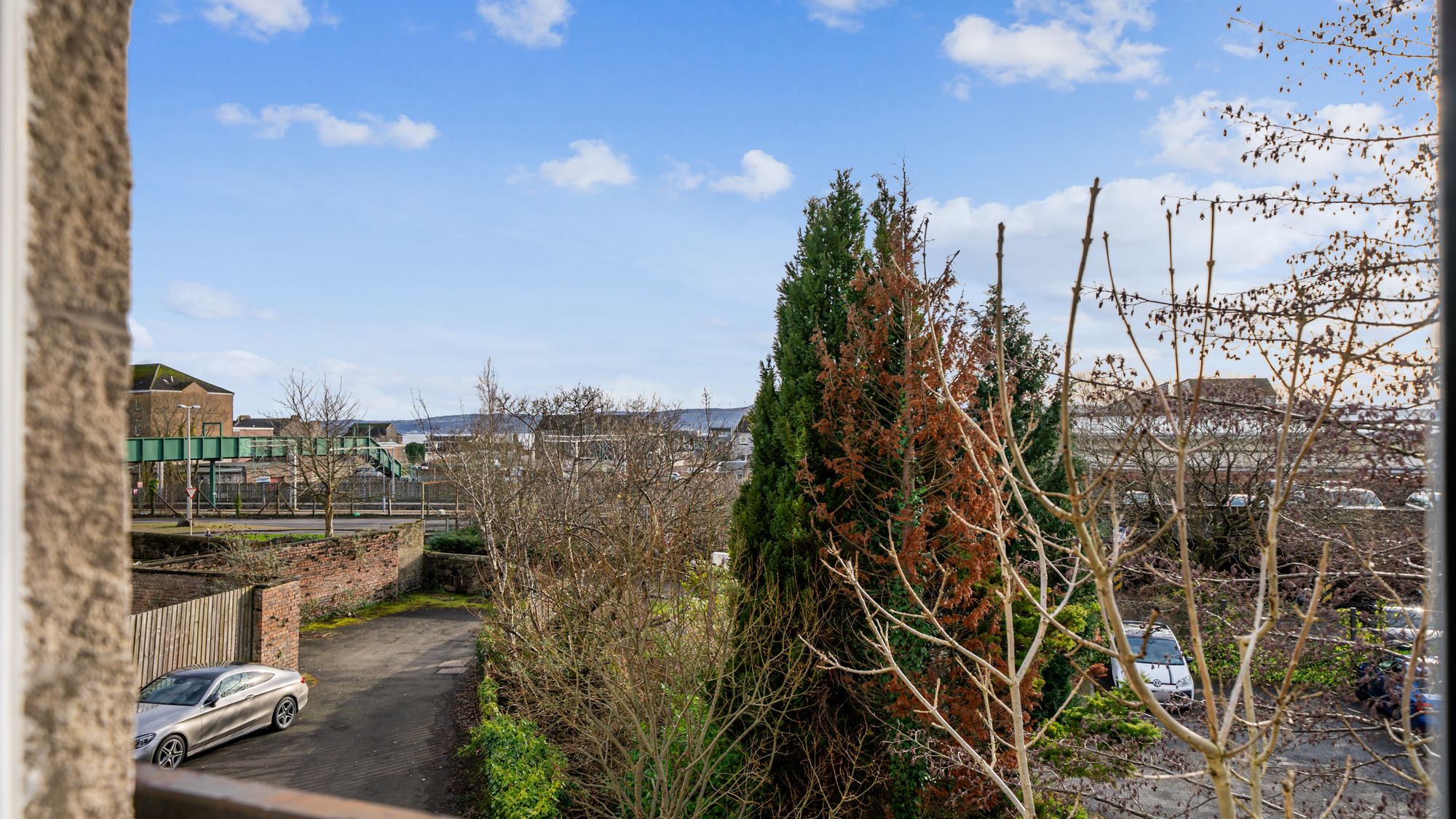 Number 2 comprises a welcoming entrance hallway leading to a bright and spacious south-facing lounge with Juliet balcony, offering partial views towards the Clyde estuary. Off the lounge is a modern dining kitchen fitted with a range of wall and floor units and a stainless-steel sink. The master bedroom features built-in mirrored wardrobes and a private ensuite shower room with walk-in shower, wc and wash hand basin, while the second double bedroom also includes fitted wardrobes. A stylish family bathroom with a white three-piece suite and extractor fan completes the layout in this spacious flat. Further benefits include PVC double glazing throughout, and gas-fired central heating. The building features a communal carpeted stairwell, shared bin store within the pend below, and residents’ off-street parking to the rear. The rear of the property is defined by timber fencing and stone walls, with a small gravelled area and a burn running alongside.
