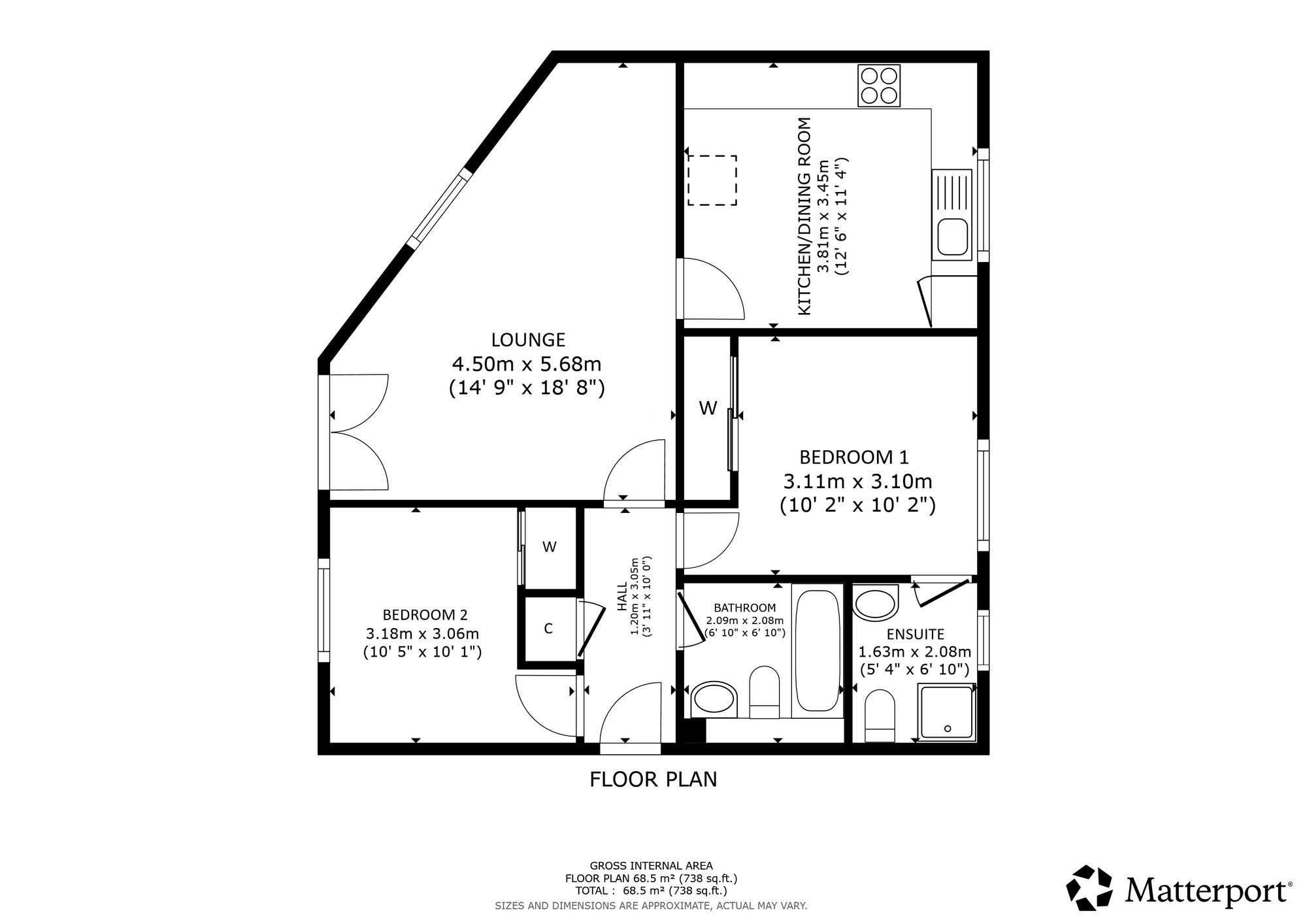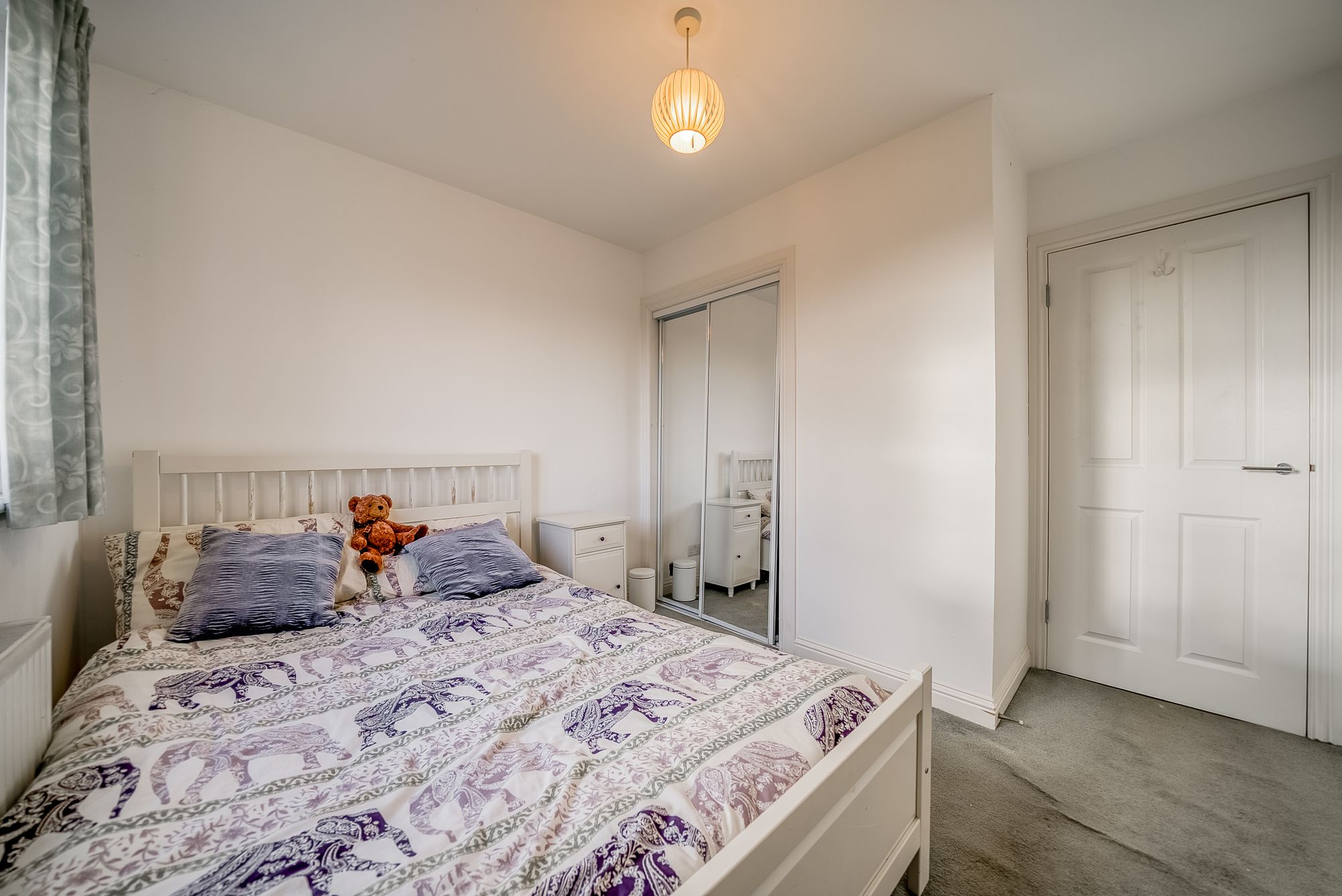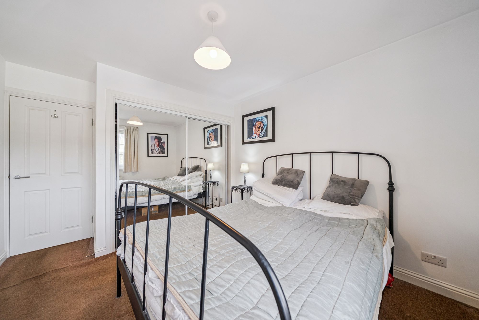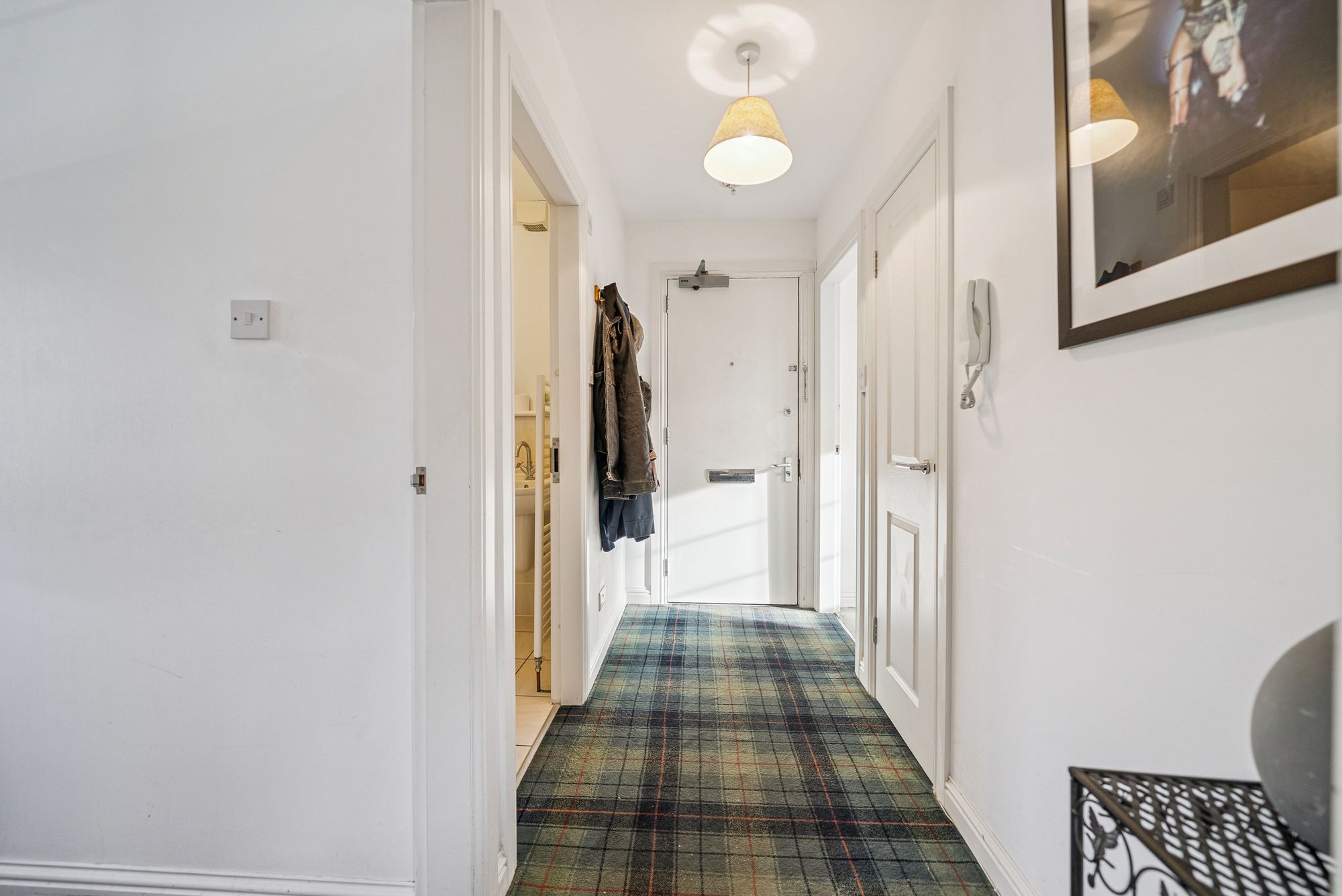 Number 2 comprises a welcoming entrance hallway leading to a bright and spacious south-facing lounge with Juliet balcony, offering partial views towards the Clyde estuary. Off the lounge is a modern dining kitchen fitted with a range of wall and floor units and a stainless-steel sink. The master bedroom features built-in mirrored wardrobes and a private ensuite shower room with walk-in shower, wc and wash hand basin, while the second double bedroom also includes fitted wardrobes. A stylish family bathroom with a white three-piece suite and extractor fan completes the layout in this spacious flat. Further benefits include PVC double glazing throughout, and gas-fired central heating. The building features a communal carpeted stairwell, shared bin store within the pend below, and residents’ off-street parking to the rear. The rear of the property is defined by timber fencing and stone walls, with a small gravelled area and a burn running alongside.