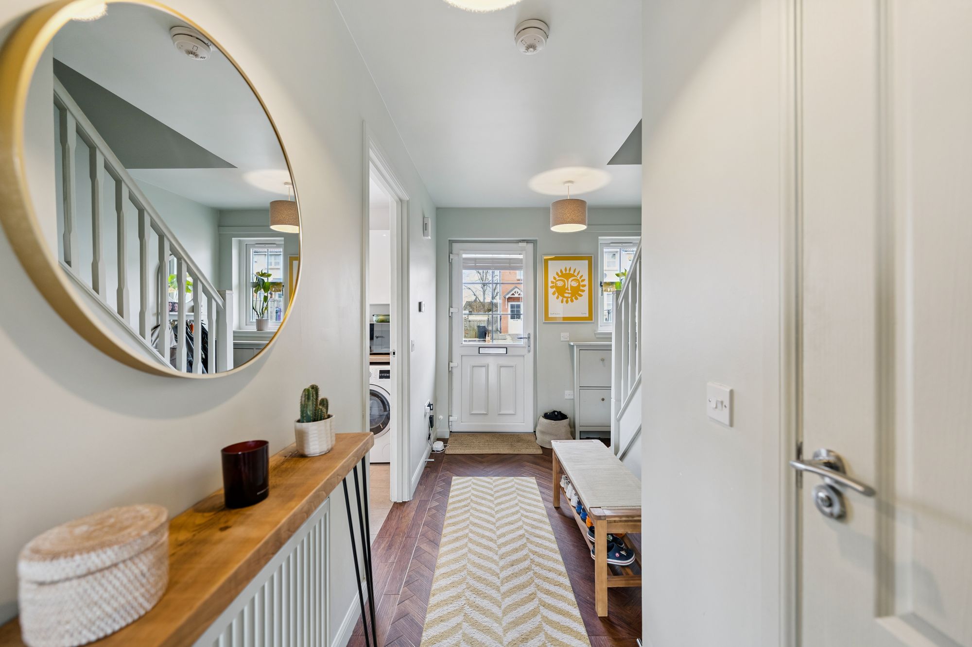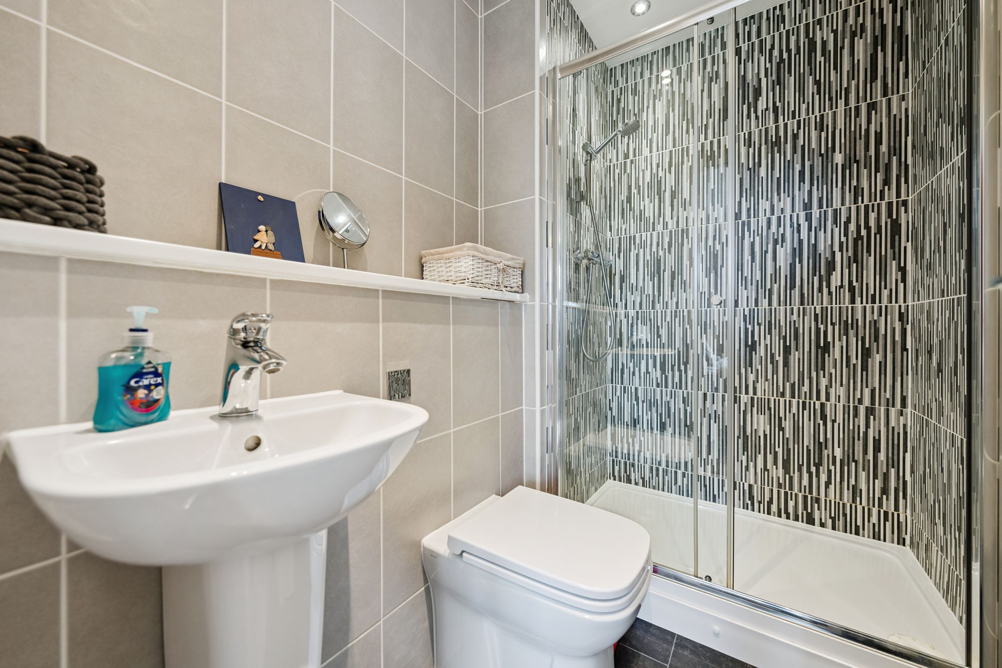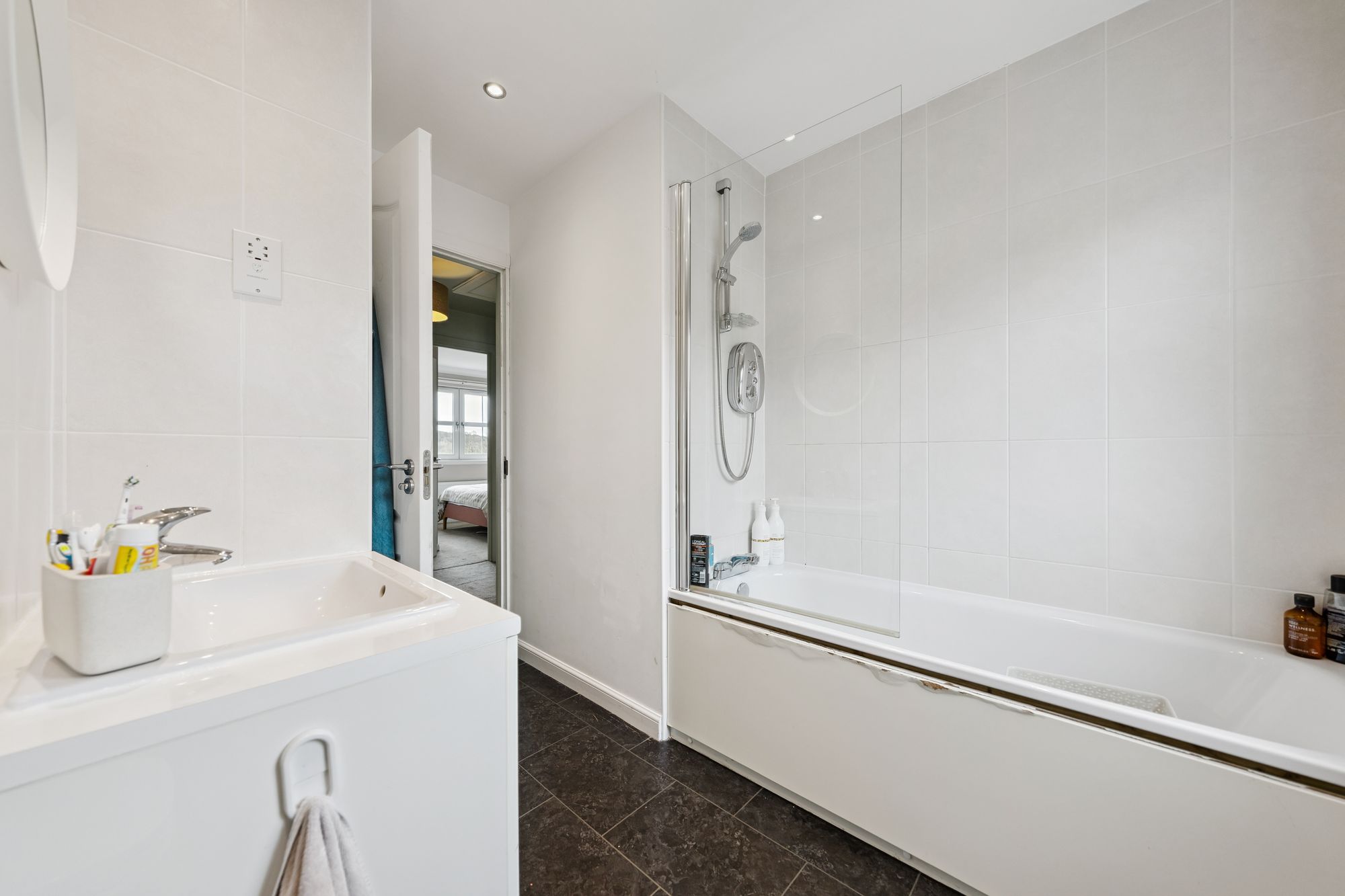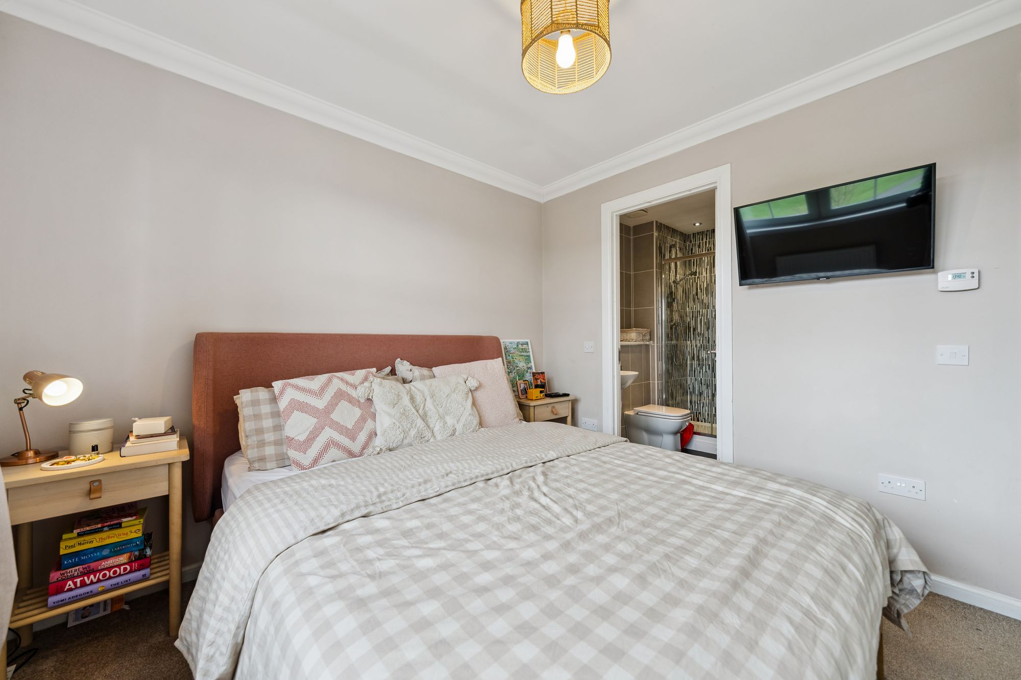 On the upper level, a landing with additional storage leads to three well-proportioned bedrooms. Two are generous doubles, both benefiting from in-built storage, with the principal bedroom further enhanced by a sleek en-suite shower room. A third bedroom offers flexibility as a child’s room, home office, or guest space. Completing the accommodation is a beautifully presented family bathroom, fitted with a three-piece suite and shower over bath.