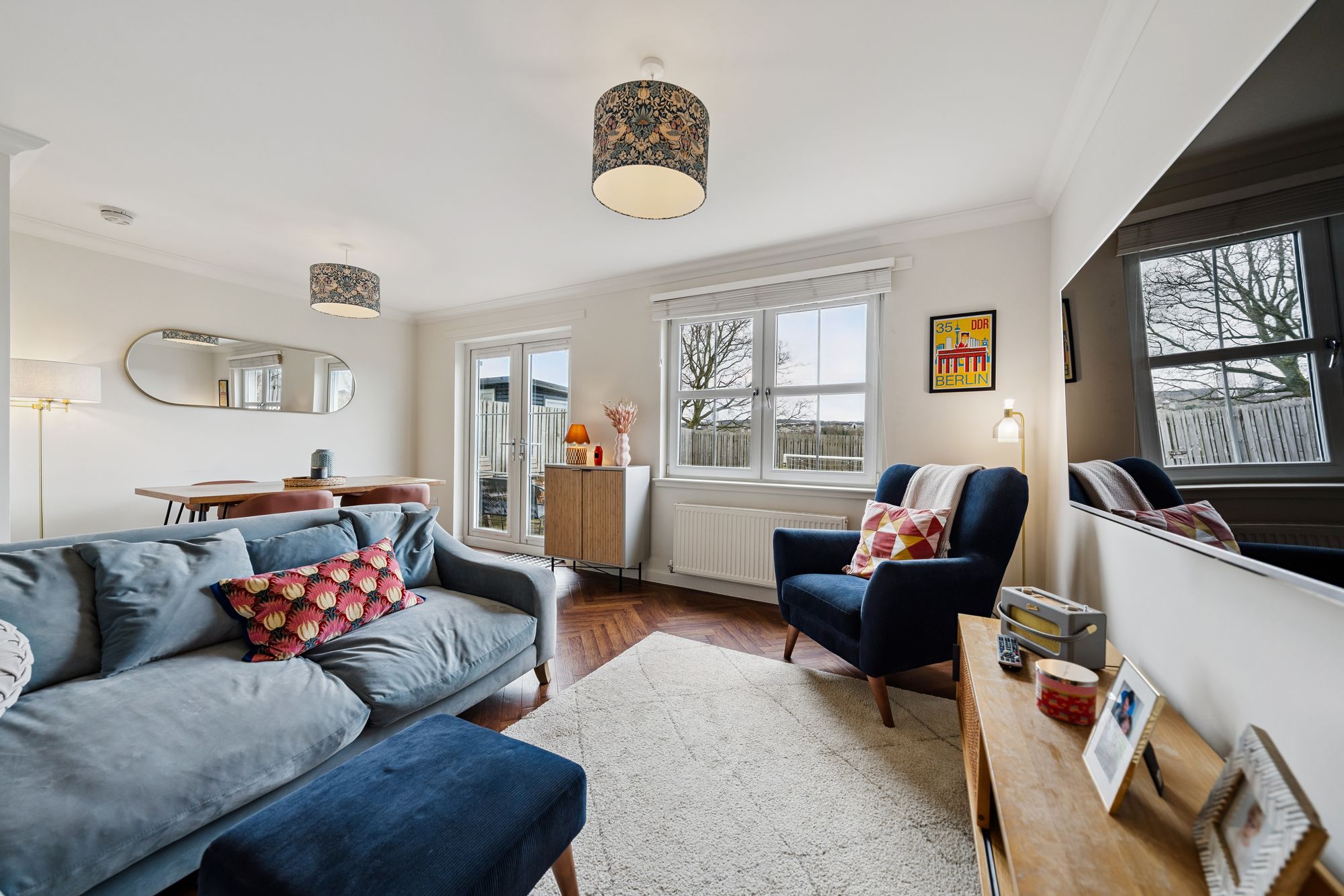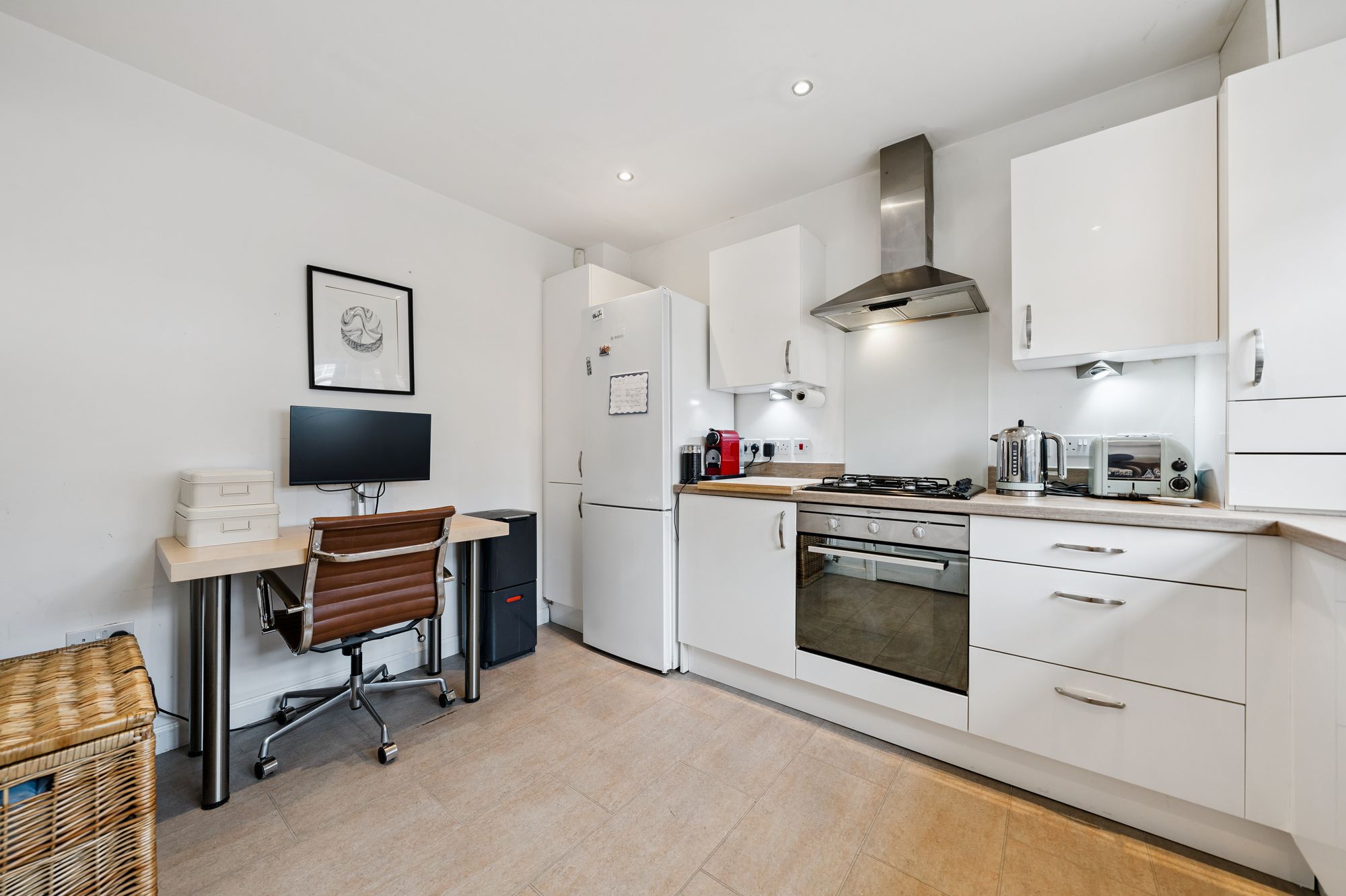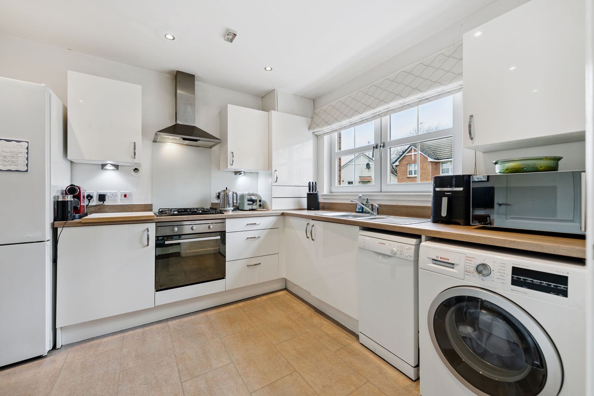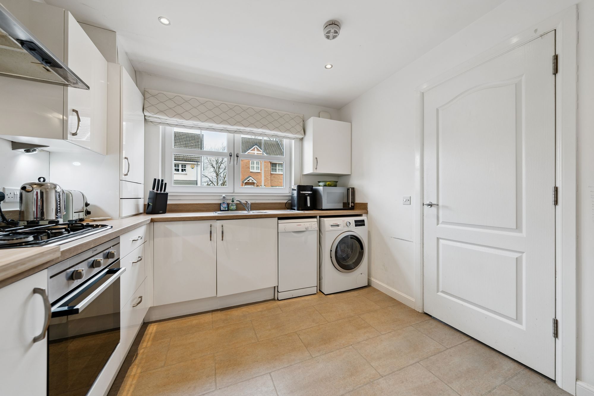 Positioned to the front, the modern fitted kitchen is well-appointed with a range of base and wall-mounted units, complemented by integrated appliances and ample workspace.