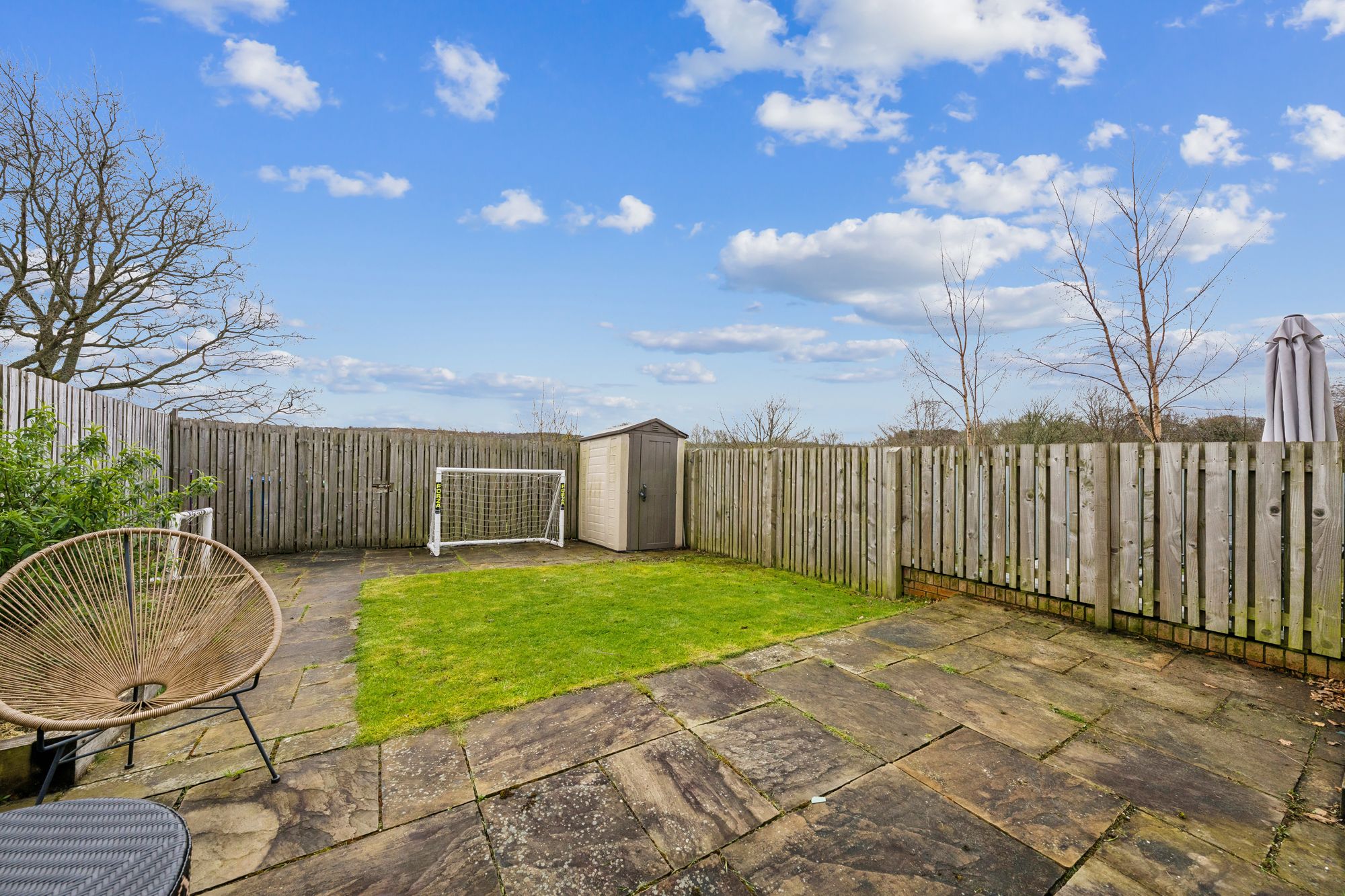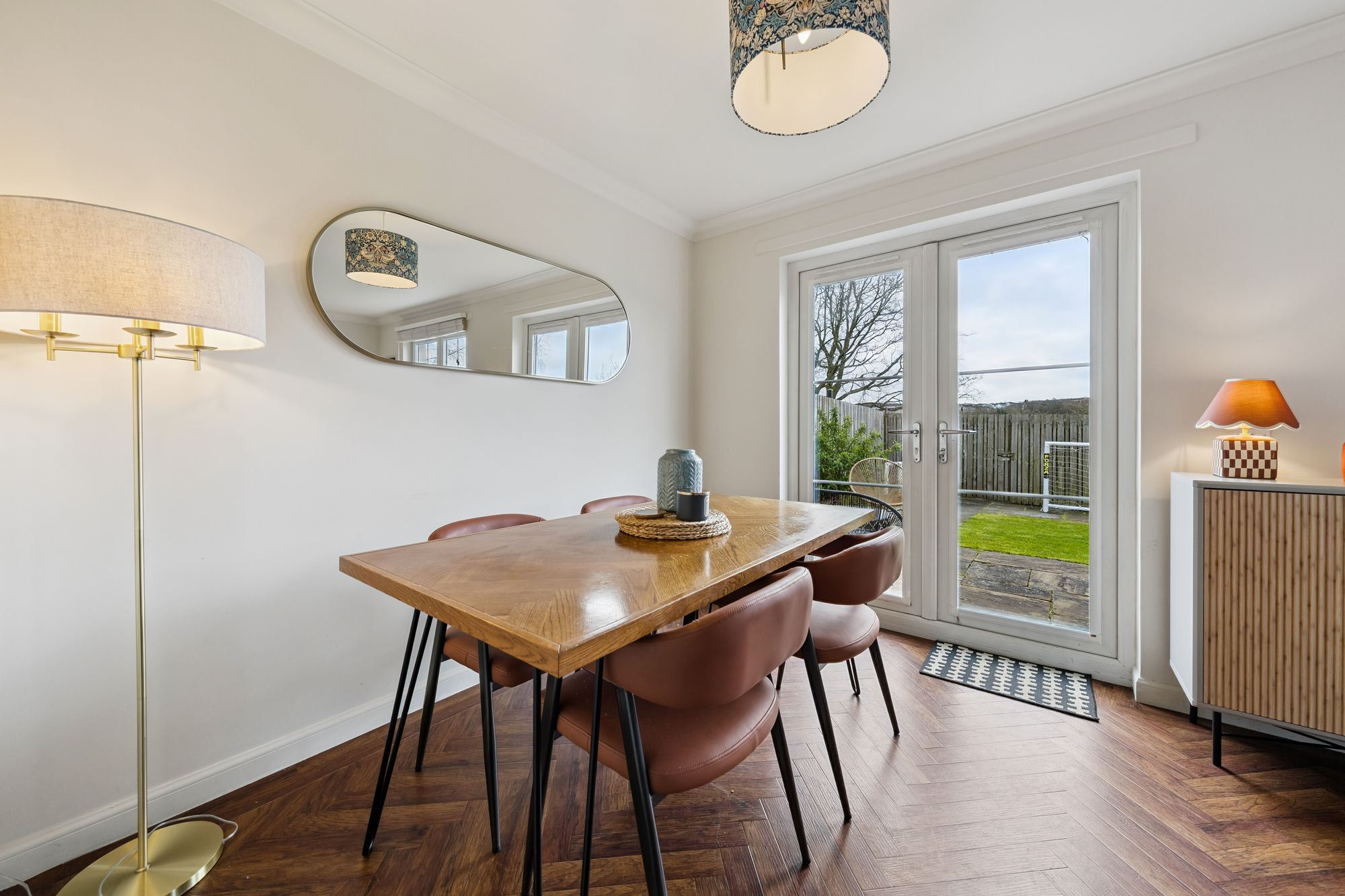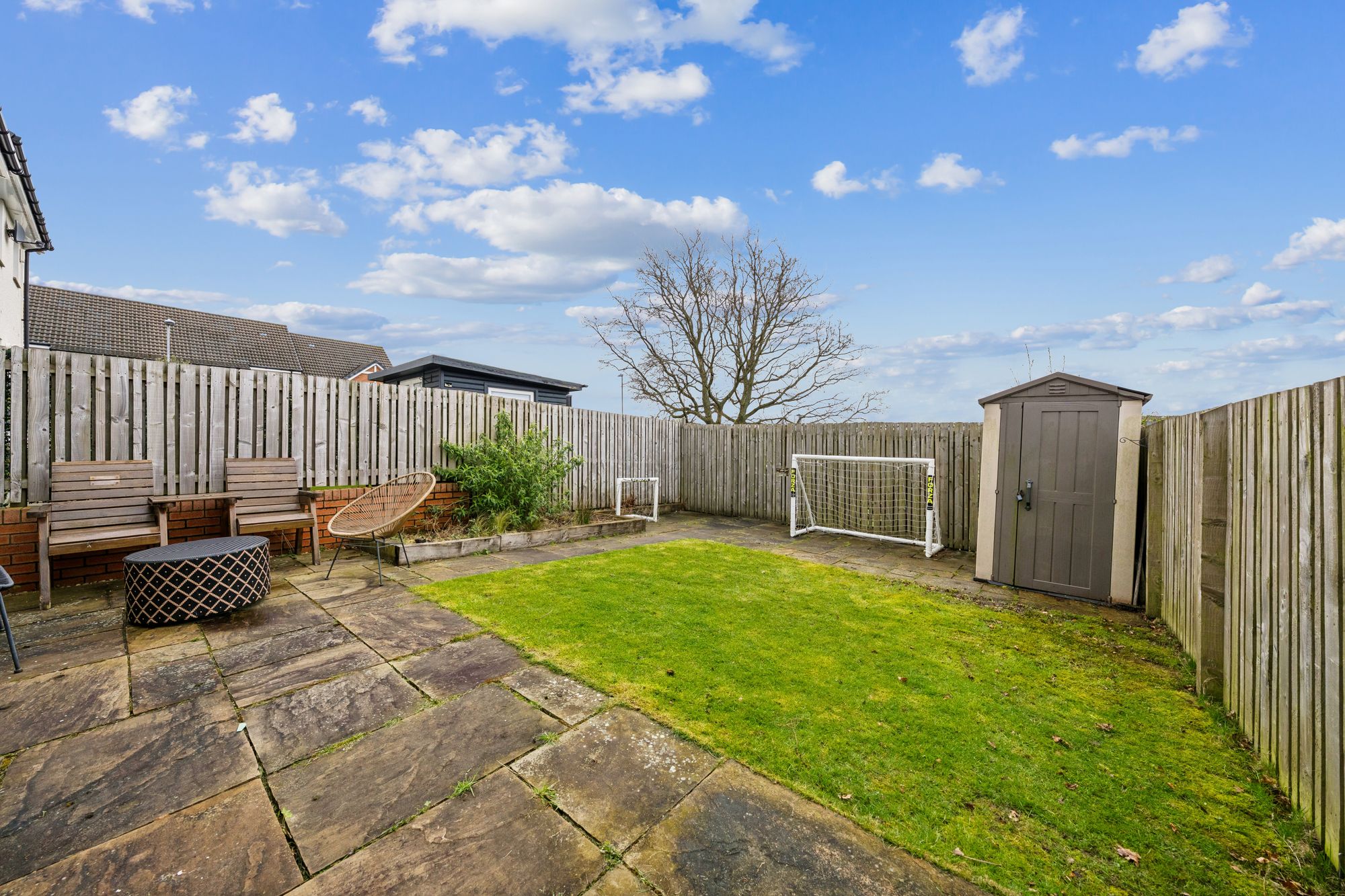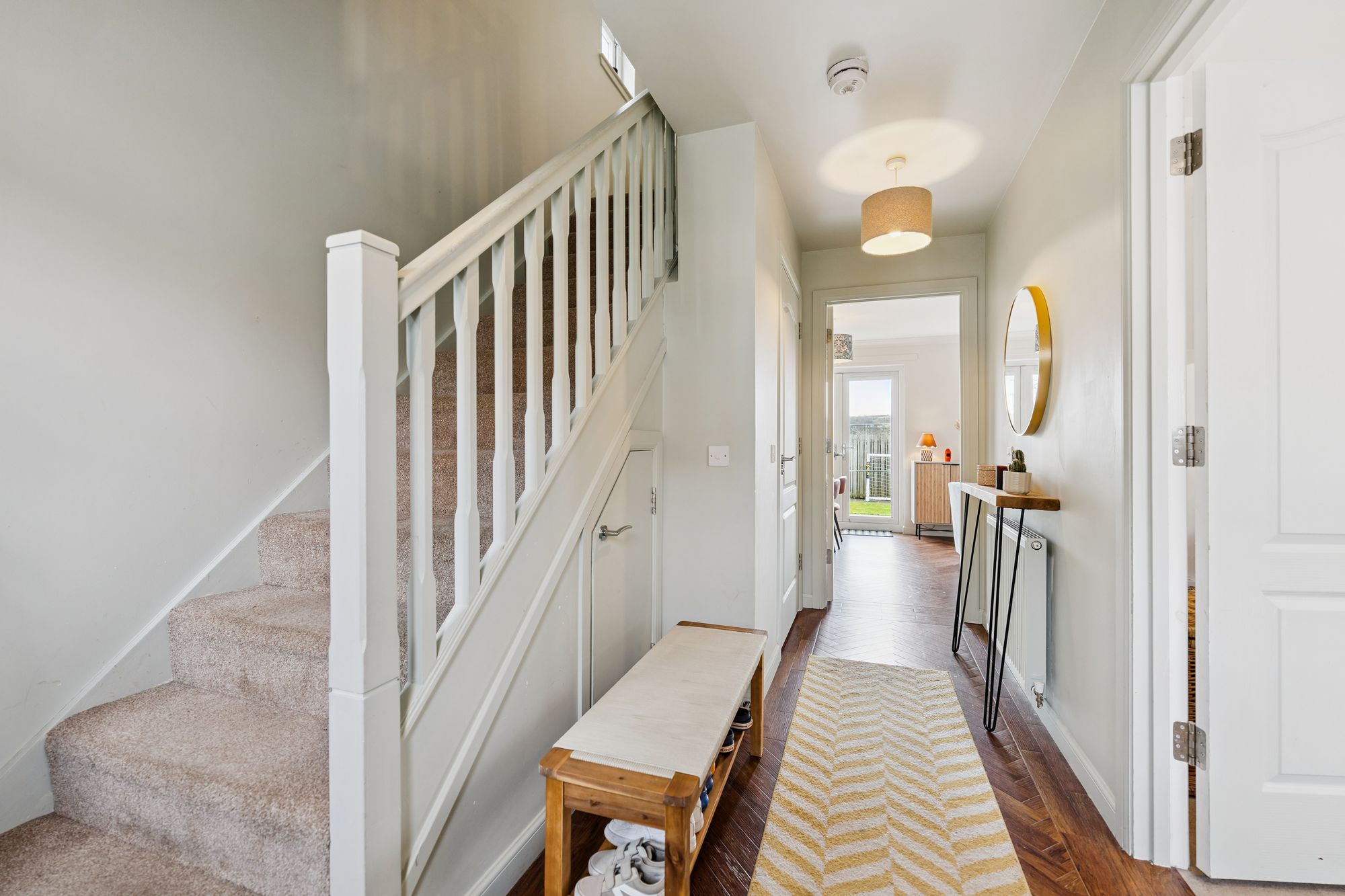 The accommodation is arranged over two levels and opens with a bright and welcoming entrance hallway, complete with convenient under-stair storage and a ground floor W/C. To the rear, the impressive lounge flows seamlessly into a spacious dining area, creating an ideal setting for both everyday living and entertaining. Patio doors provide direct access to the private, fully enclosed rear garden, which features a paved patio area and a generous lawn bordered by timber fencing, perfect for outdoor enjoyment.