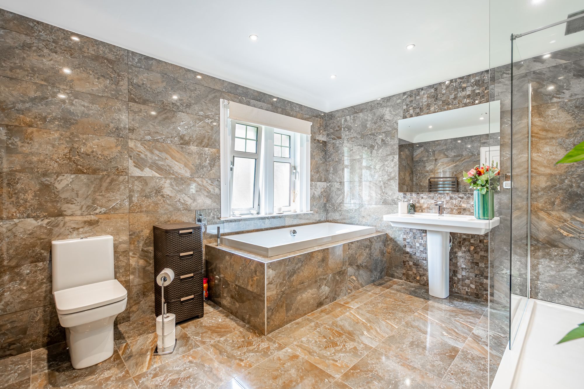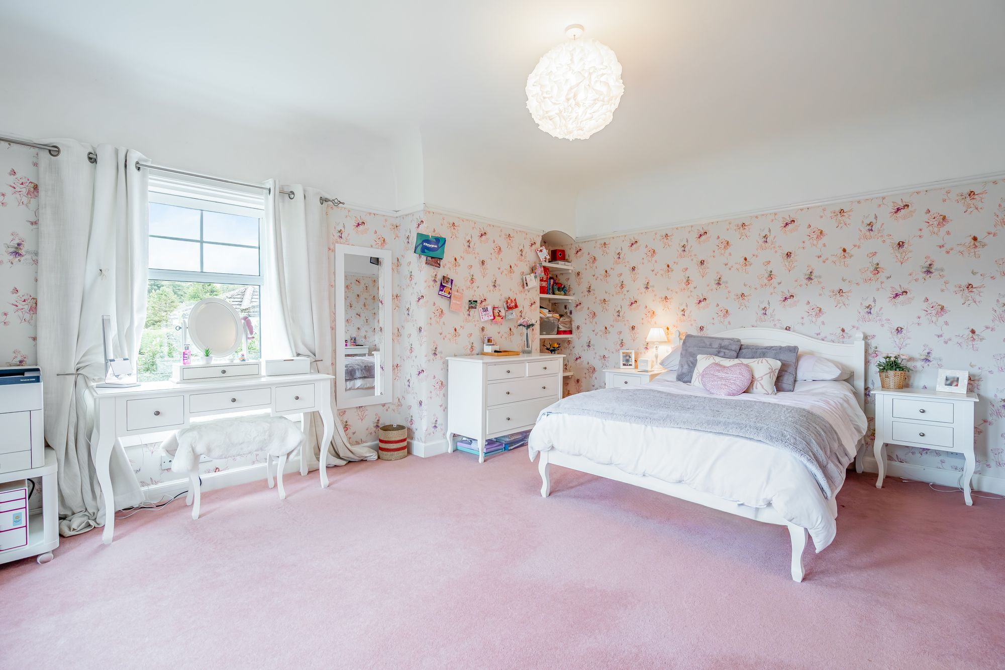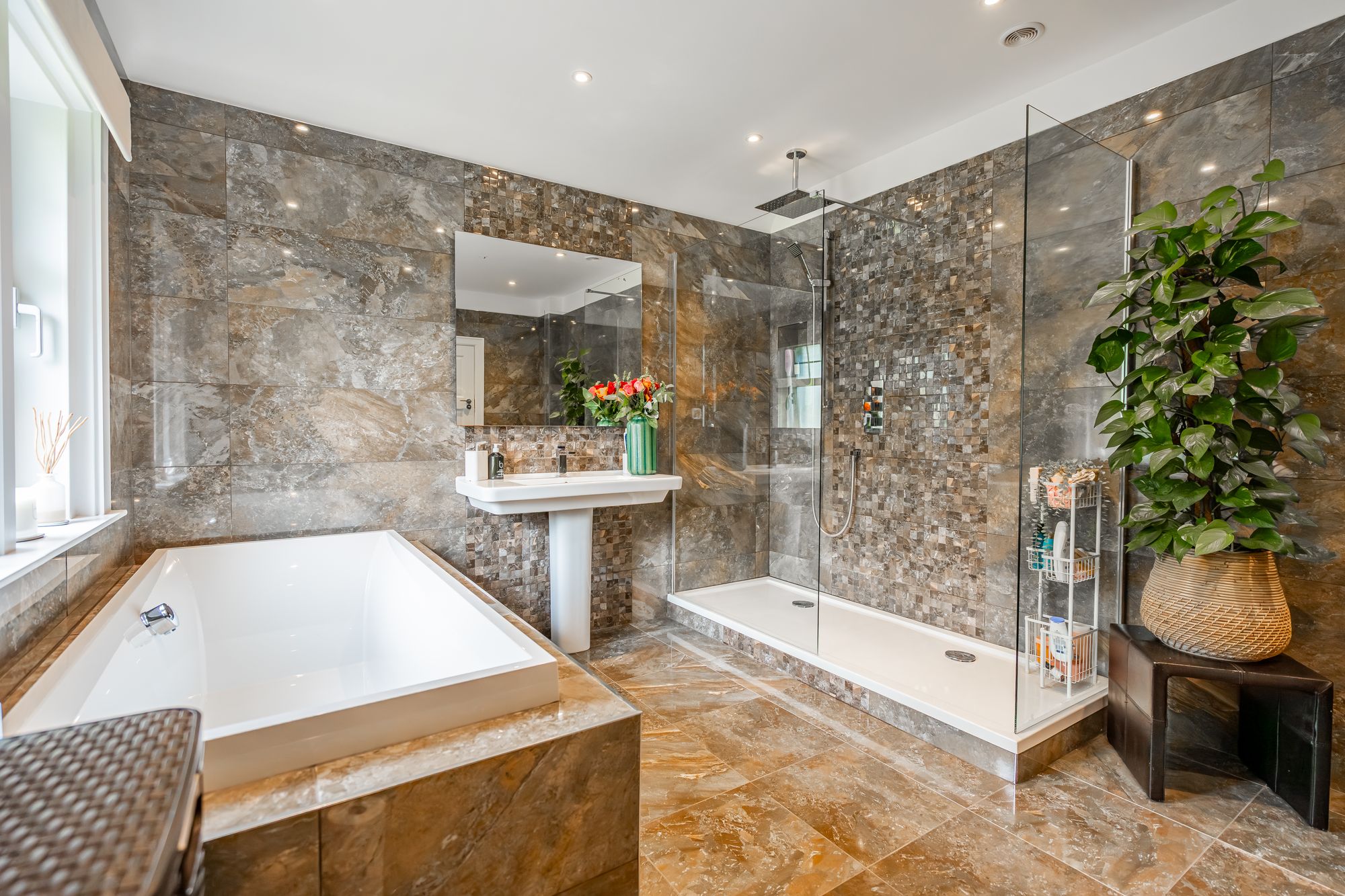 Upstairs, the principal bedroom is particularly impressive, offering generous proportions and a private dressing room, creating a tranquil and luxurious retreat. Two further double bedrooms are equally spacious, while the large family bathroom features quality fixtures and a modern finish, completing the first-floor accommodation.