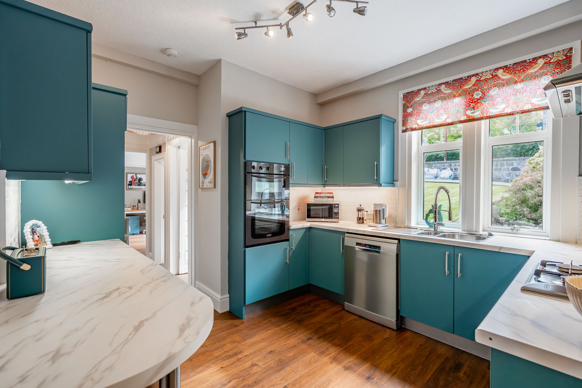 The ground floor comprises an entrance vestibule leading into a spacious central hallway, giving access to a large and comfortable lounge that enjoys natural light from expansive front-facing windows. A multifuel stove provides a cosy focal point, particularly during the colder months.