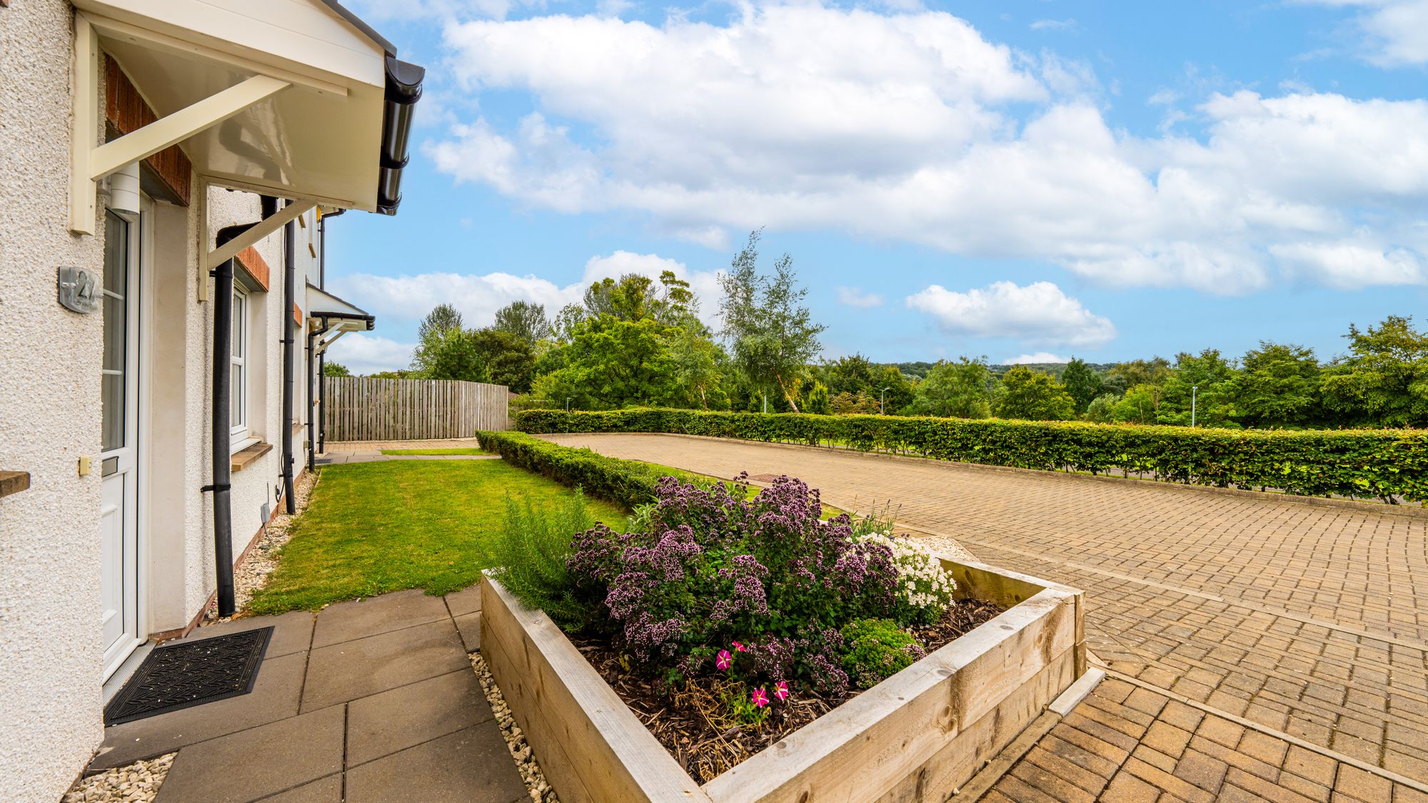 The home is accessed via a private driveway, leading to a well-kept front garden and the welcoming entrance.
