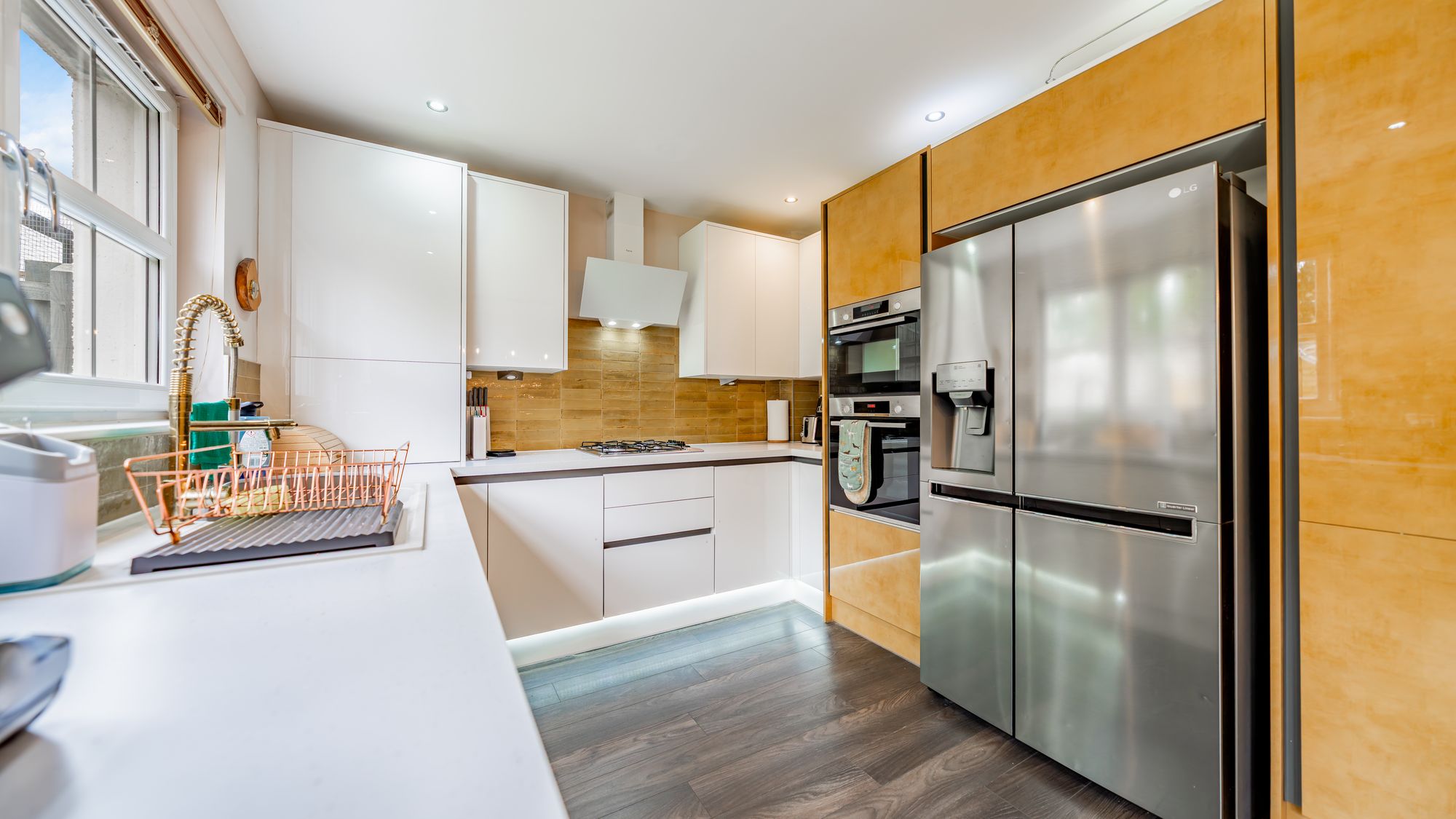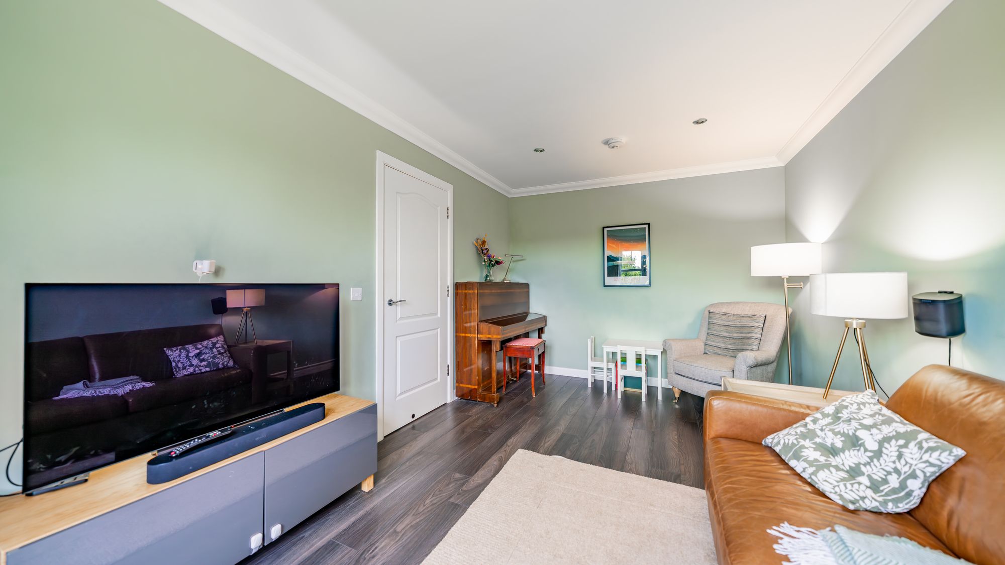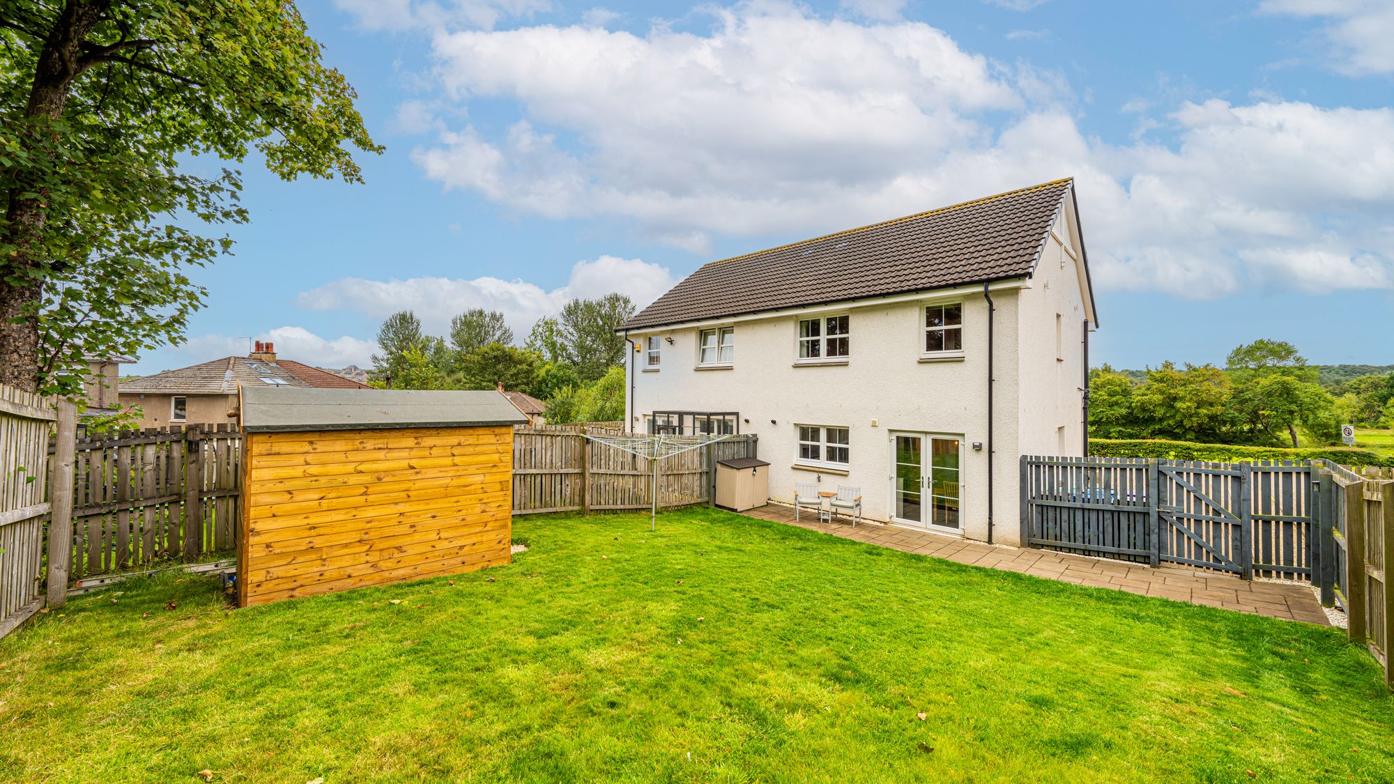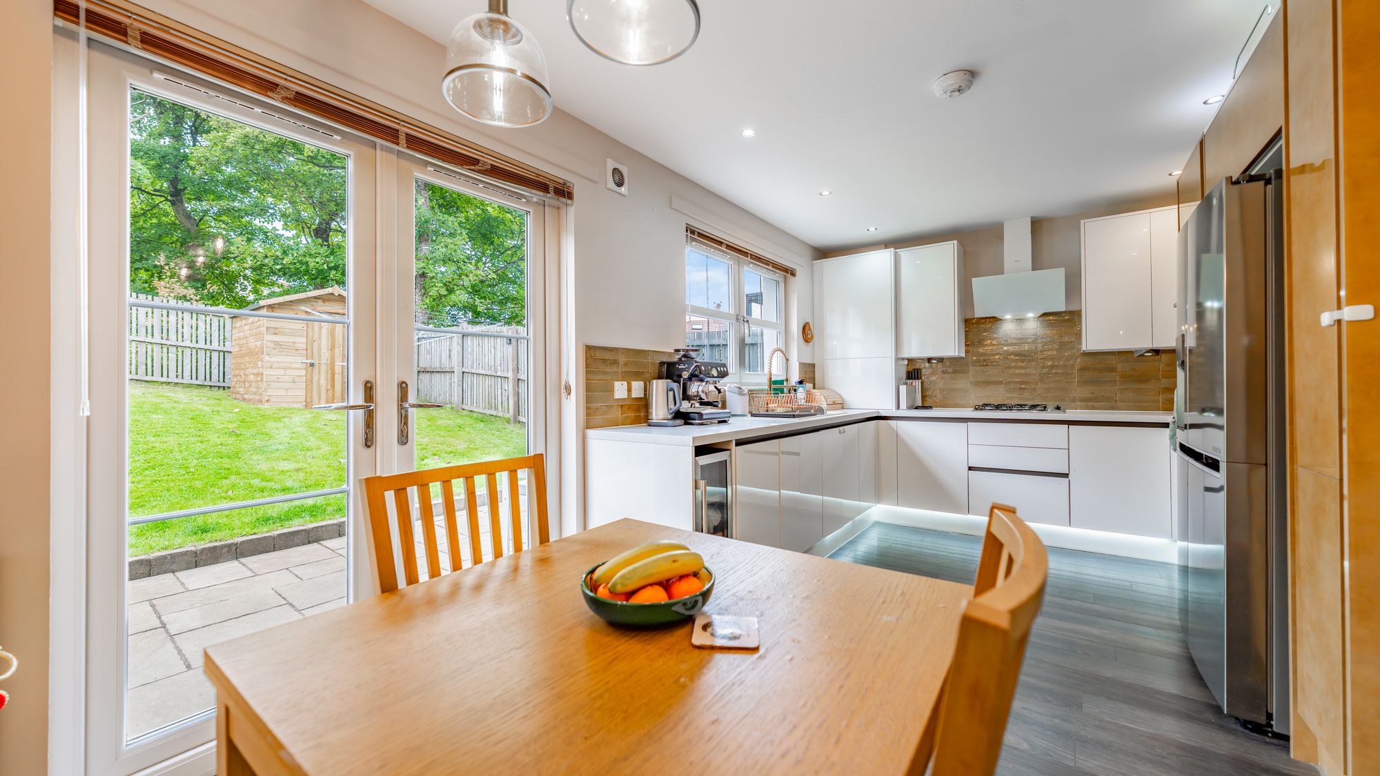 Inside, the spacious layout includes a light-filled reception hallway with an under-stair cupboard, a guest W.C, and a generous lounge. The dining-sized kitchen is modern, featuring integrated appliances, plenty of base and wall-mounted units, and ample space for a dining table. Double doors lead out to the rear garden, extending the living space outdoors.