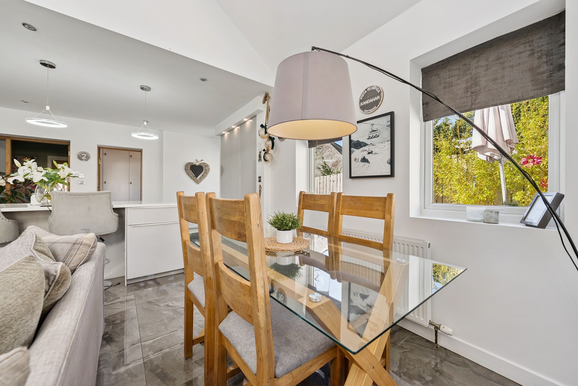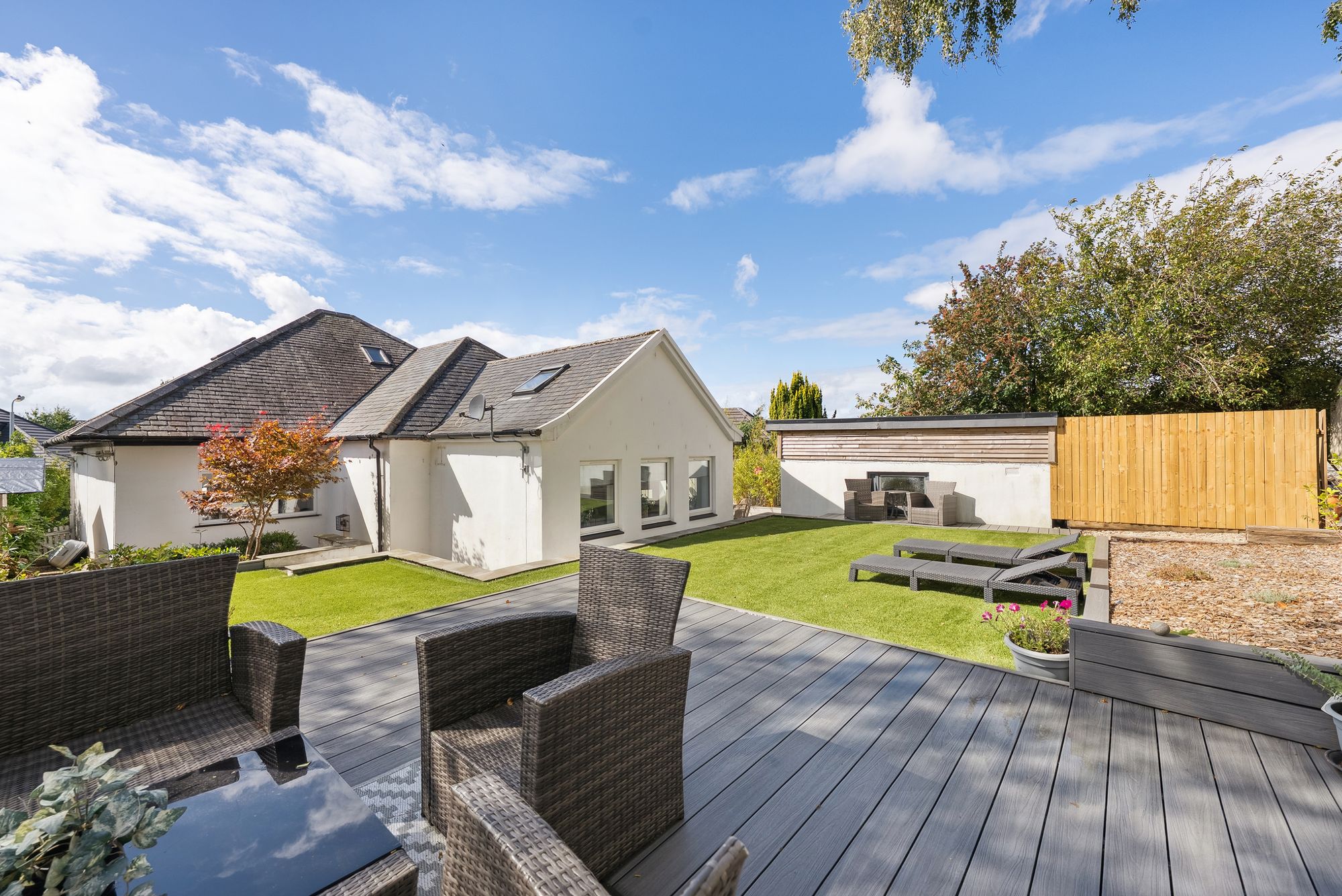 A driveway provides off street parking for multiple vehicles as well as an electric vehicle charging point, adjacent beautifully manicured front gardens with well stocked and colourful display beds. The rear garden has an area of patio adjacent to the back door providing a private area for alfresco dining/entertaining as well as a raised area of artificial grass and a further, broad decking area. There is a detached garage used a store room/gym.