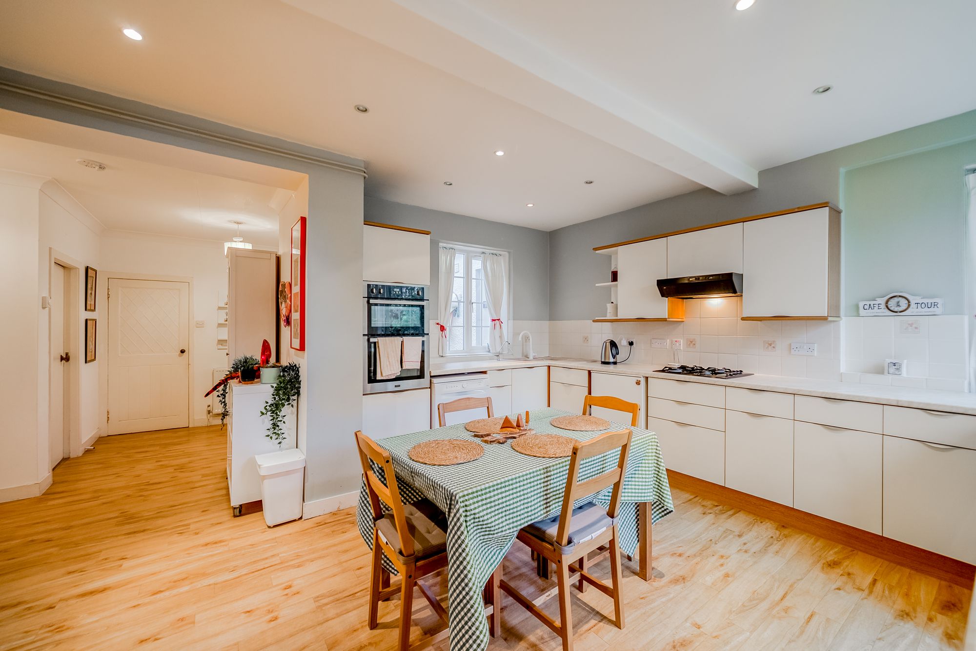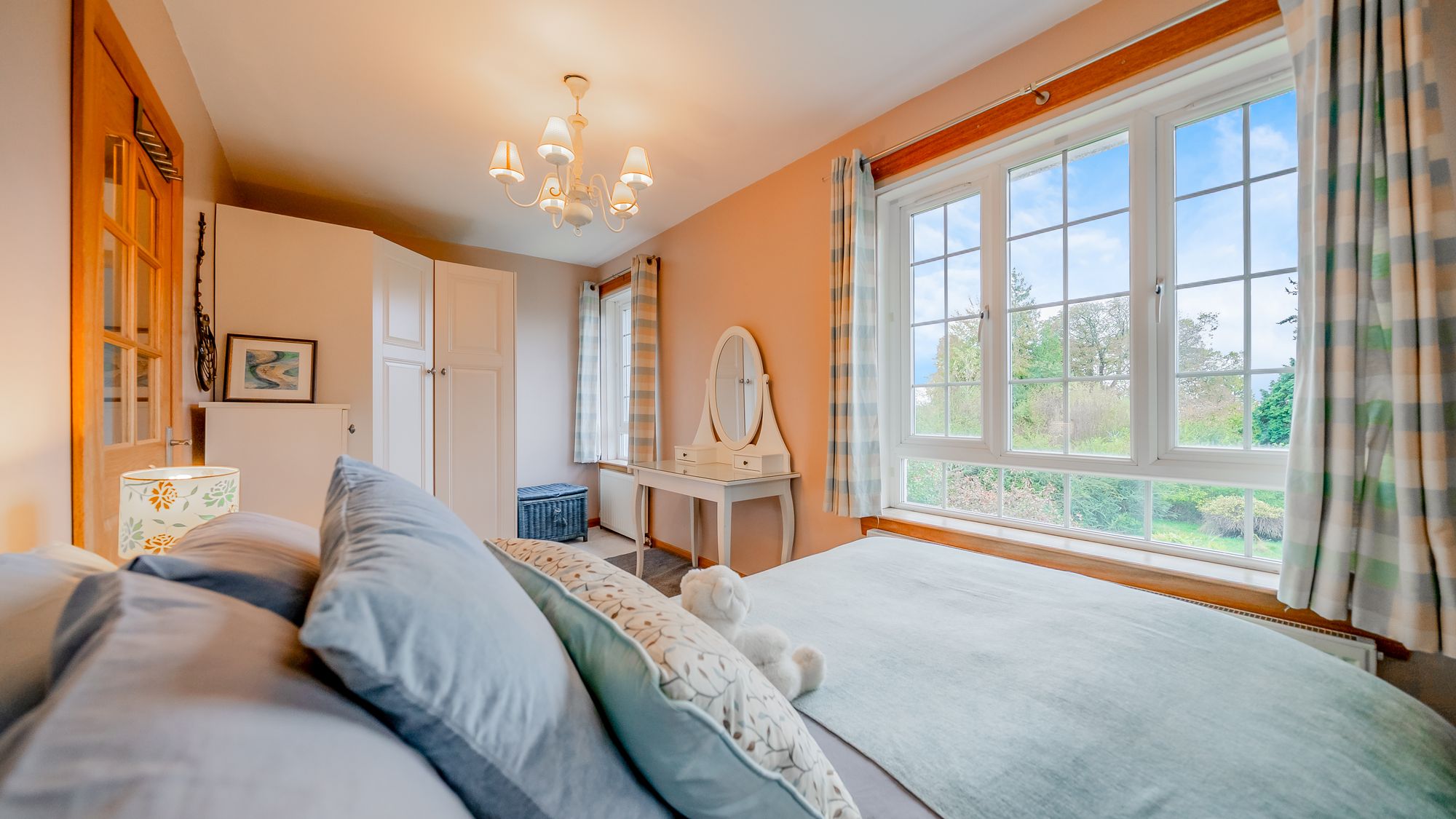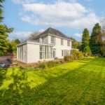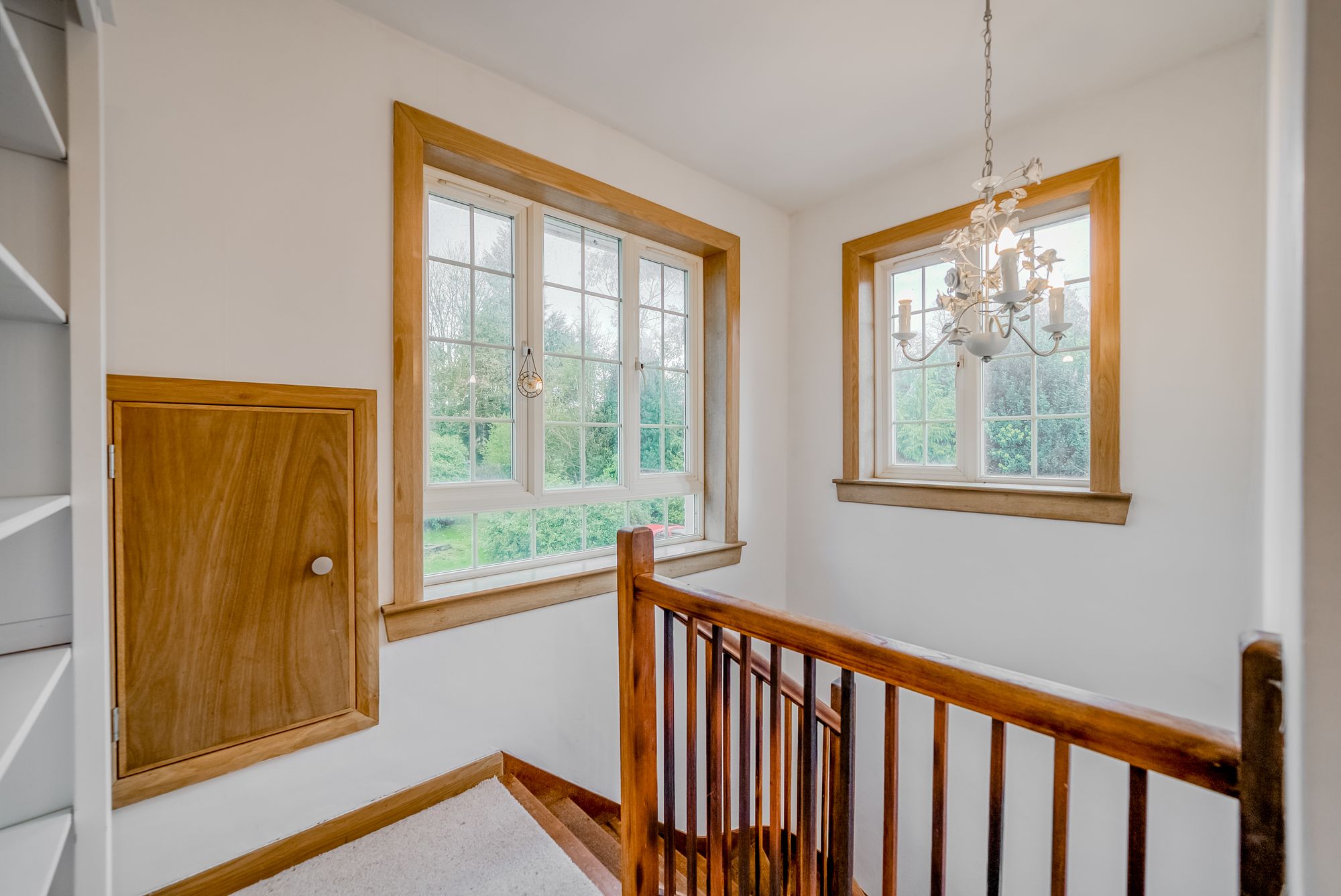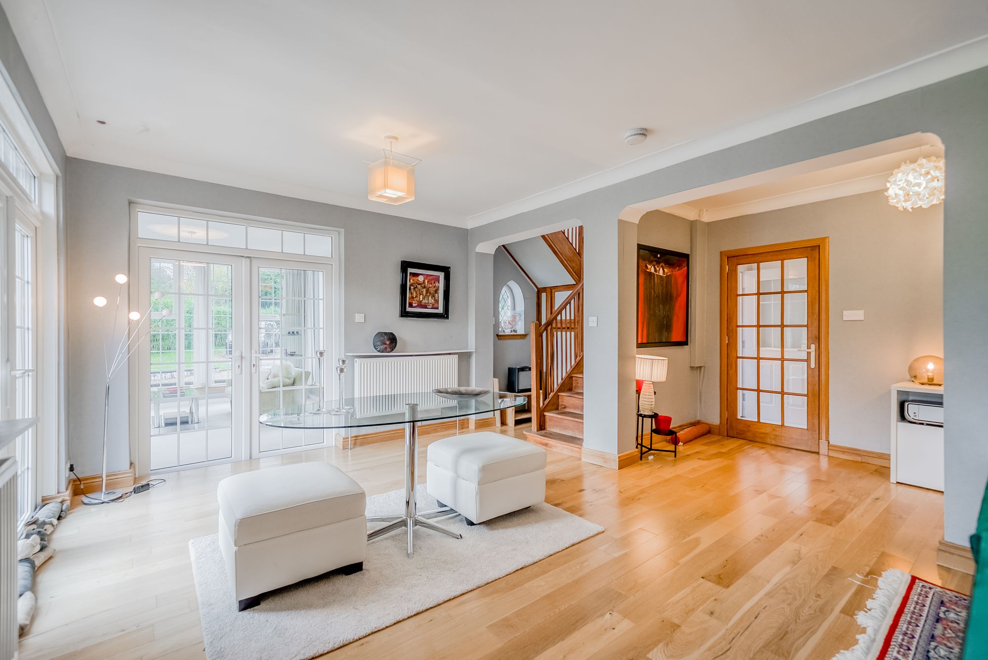 The welcoming entrance vestibule opens into a bright hallway leading to the main ground floor accommodation. The beautifully proportioned lounge is a standout feature of the home, boasting stunning wooden flooring, a large bay window that floods the room with natural light, and ample space to accommodate both living and dining areas. Double doors open out to a patio and the landscaped gardens, creating a perfect flow between indoors and out. From the lounge, there is direct access to a delightful sun room, which enjoys panoramic views over the gardens and provides a tranquil space to relax throughout the year. The modern kitchen offers an excellent range of fitted wall and floor units, stylish finishes, and direct access to the garden. The wooden flooring continues seamlessly through to this space, where French doors once again open out to the patio and garden, ideal for al fresco dining or entertaining. Across the hallway, a large contemporary shower room features a spacious walk-in shower, wc and wash hand basin, perfect for those seeking on-the-level living. Adjacent lies a generous double bedroom, also ideal as a guest room or home office. To the front of the house is another stunning double bedroom with a charming bay window and plenty of natural light. Upstairs, a bright landing leads to two further double bedrooms, one benefiting from a private dressing room, both offering a peaceful outdoor outlook. Completing this floor is a spacious family bathroom featuring a free standing claw-foot bath and a separate cloakroom with wc and wash hand basin.