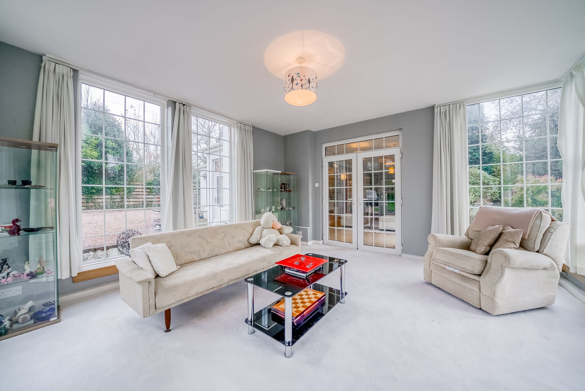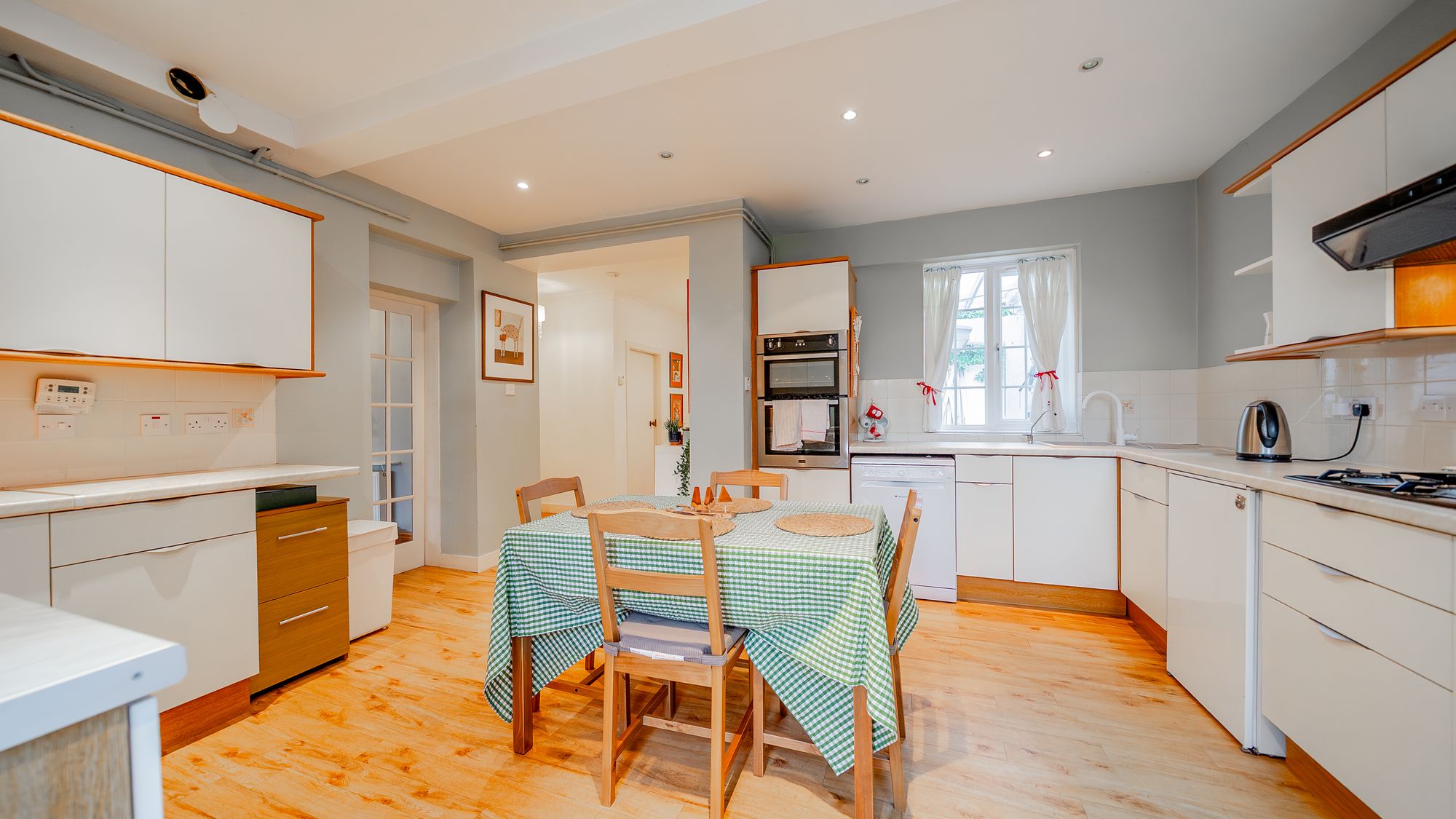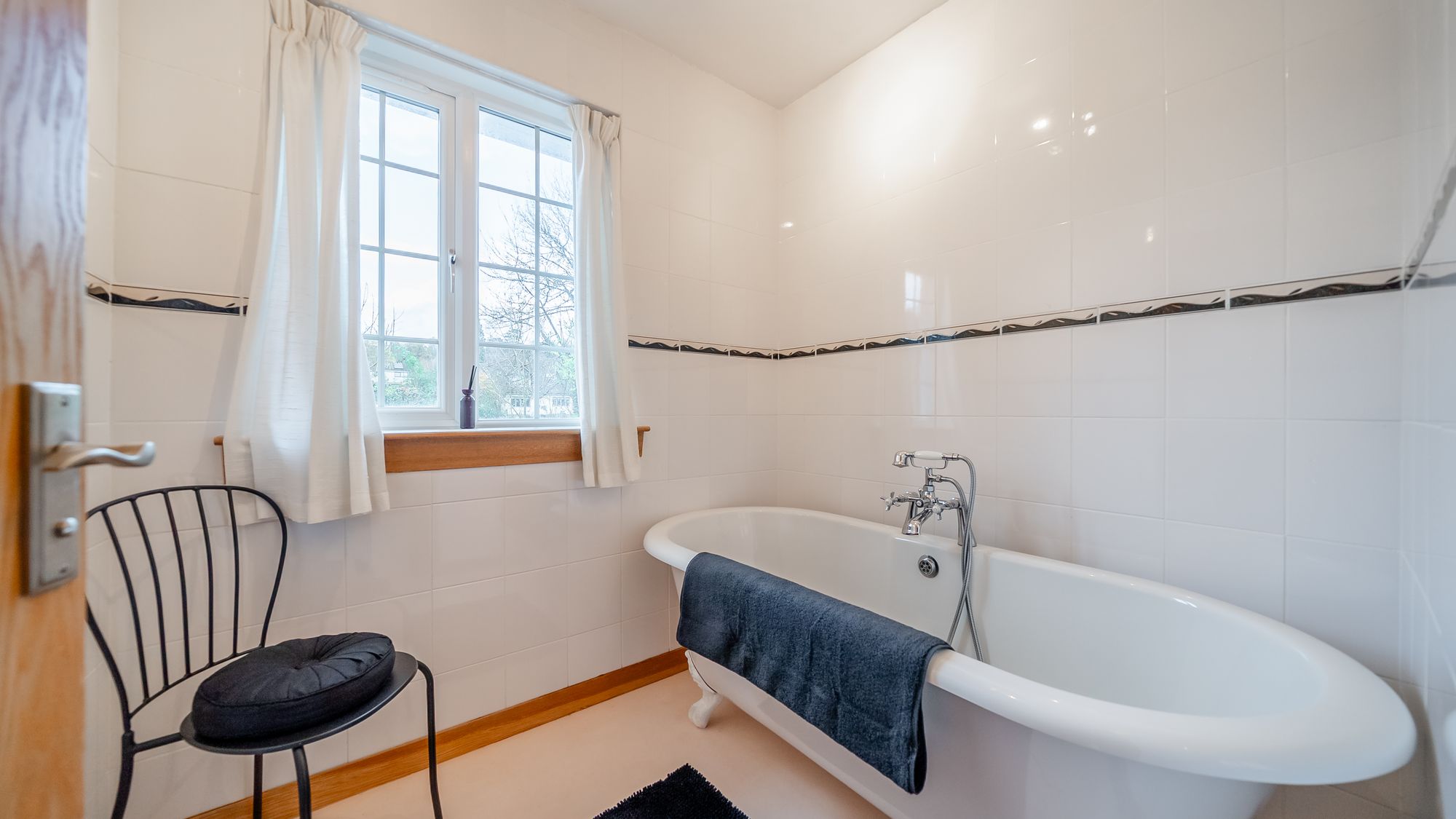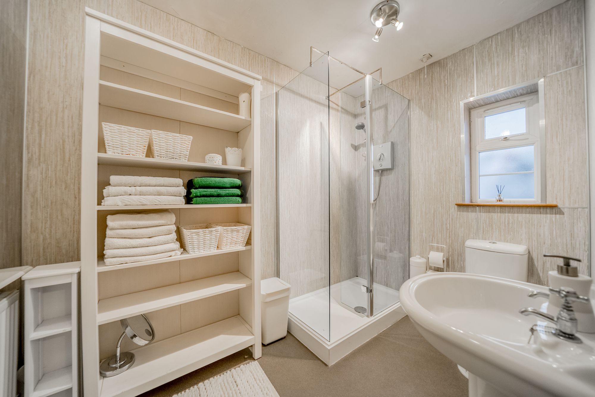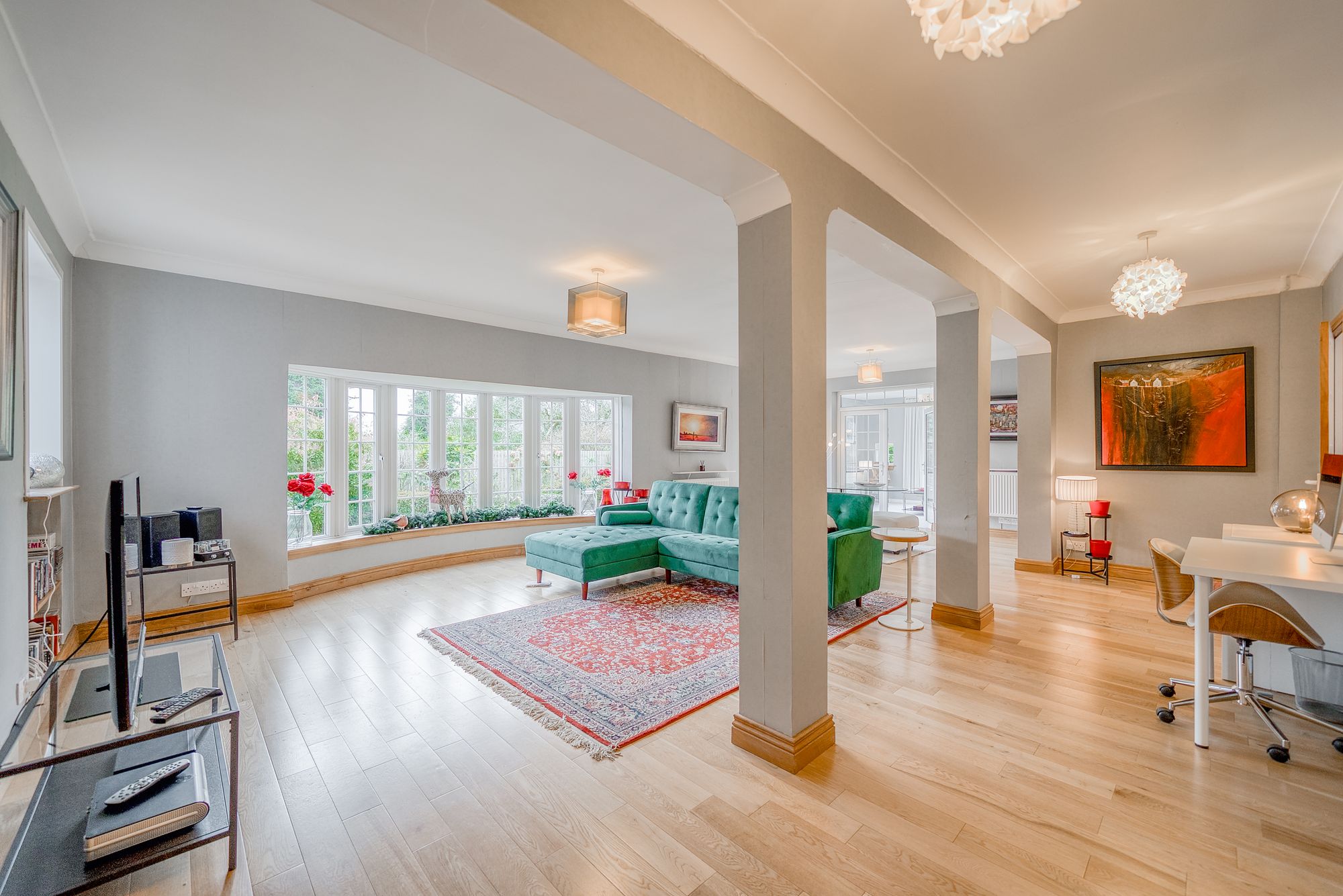The welcoming entrance vestibule opens into a bright hallway leading to the main ground floor accommodation. The beautifully proportioned lounge is a standout feature of the home, boasting stunning wooden flooring, a large bay window that floods the room with natural light, and ample space to accommodate both living and dining areas. Double doors open out to a patio and the landscaped gardens, creating a perfect flow between indoors and out. From the lounge, there is direct access to a delightful sun room, which enjoys panoramic views over the gardens and provides a tranquil space to relax throughout the year. The modern kitchen offers an excellent range of fitted wall and floor units, stylish finishes, and direct access to the garden. The wooden flooring continues seamlessly through to this space, where French doors once again open out to the patio and garden, ideal for al fresco dining or entertaining. Across the hallway, a large contemporary shower room features a spacious walk-in shower, wc and wash hand basin, perfect for those seeking on-the-level living. Adjacent lies a generous double bedroom, also ideal as a guest room or home office. To the front of the house is another stunning double bedroom with a charming bay window and plenty of natural light. Upstairs, a bright landing leads to two further double bedrooms, one benefiting from a private dressing room, both offering a peaceful outdoor outlook. Completing this floor is a spacious family bathroom featuring a free standing claw-foot bath and a separate cloakroom with wc and wash hand basin.