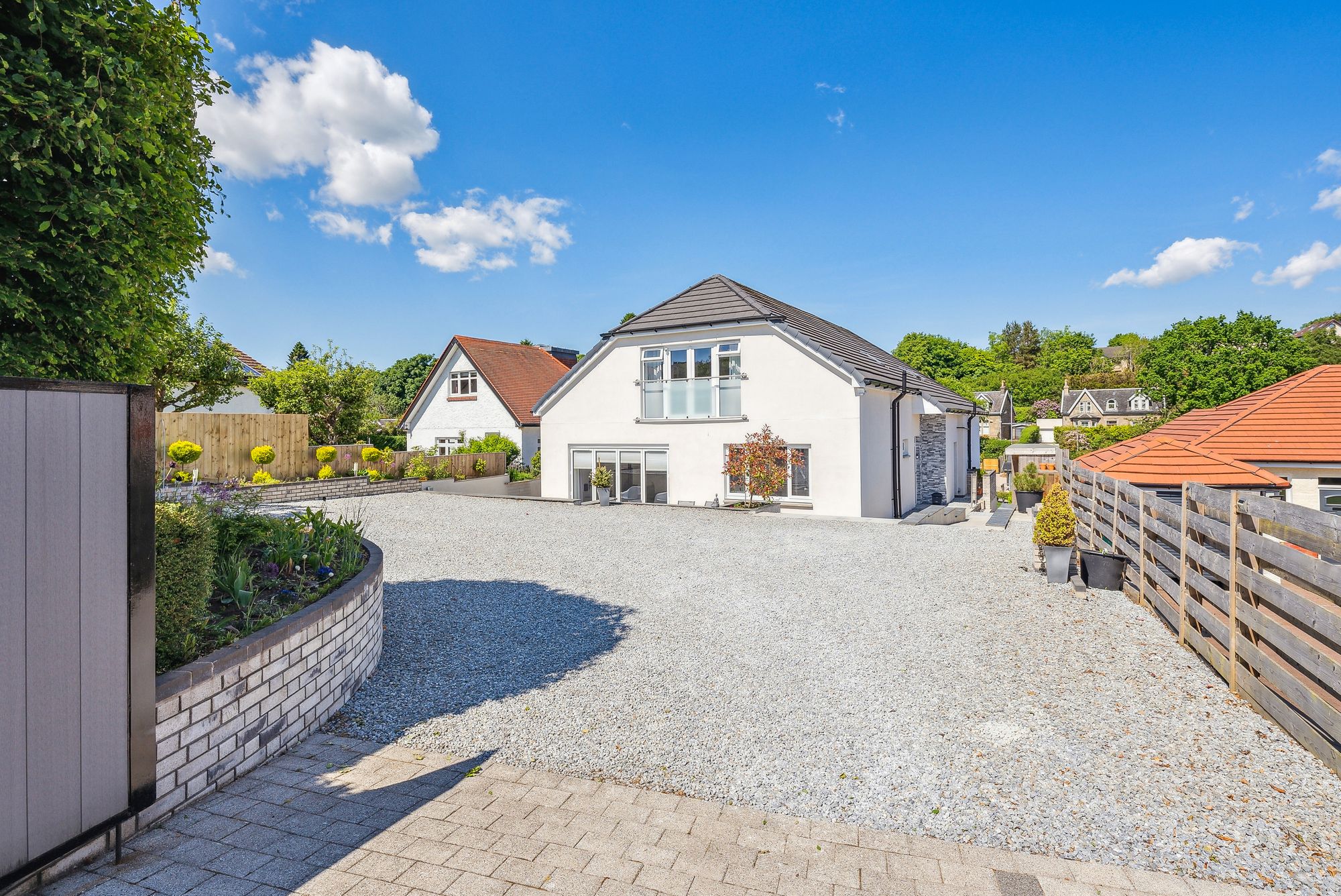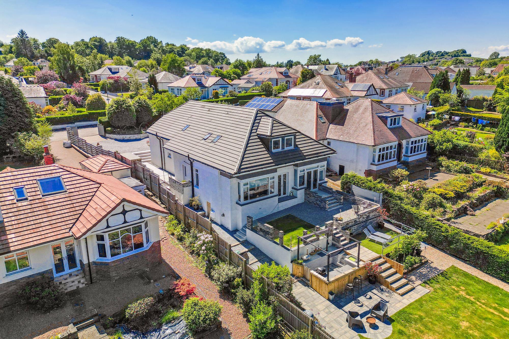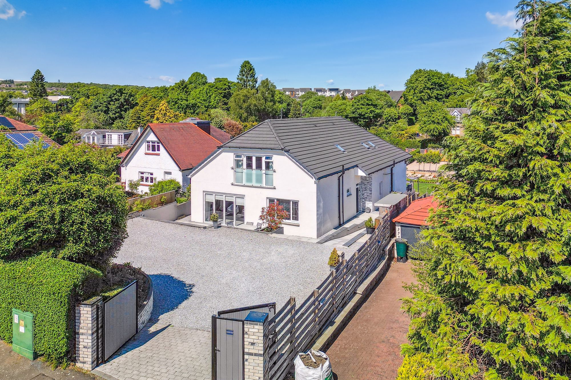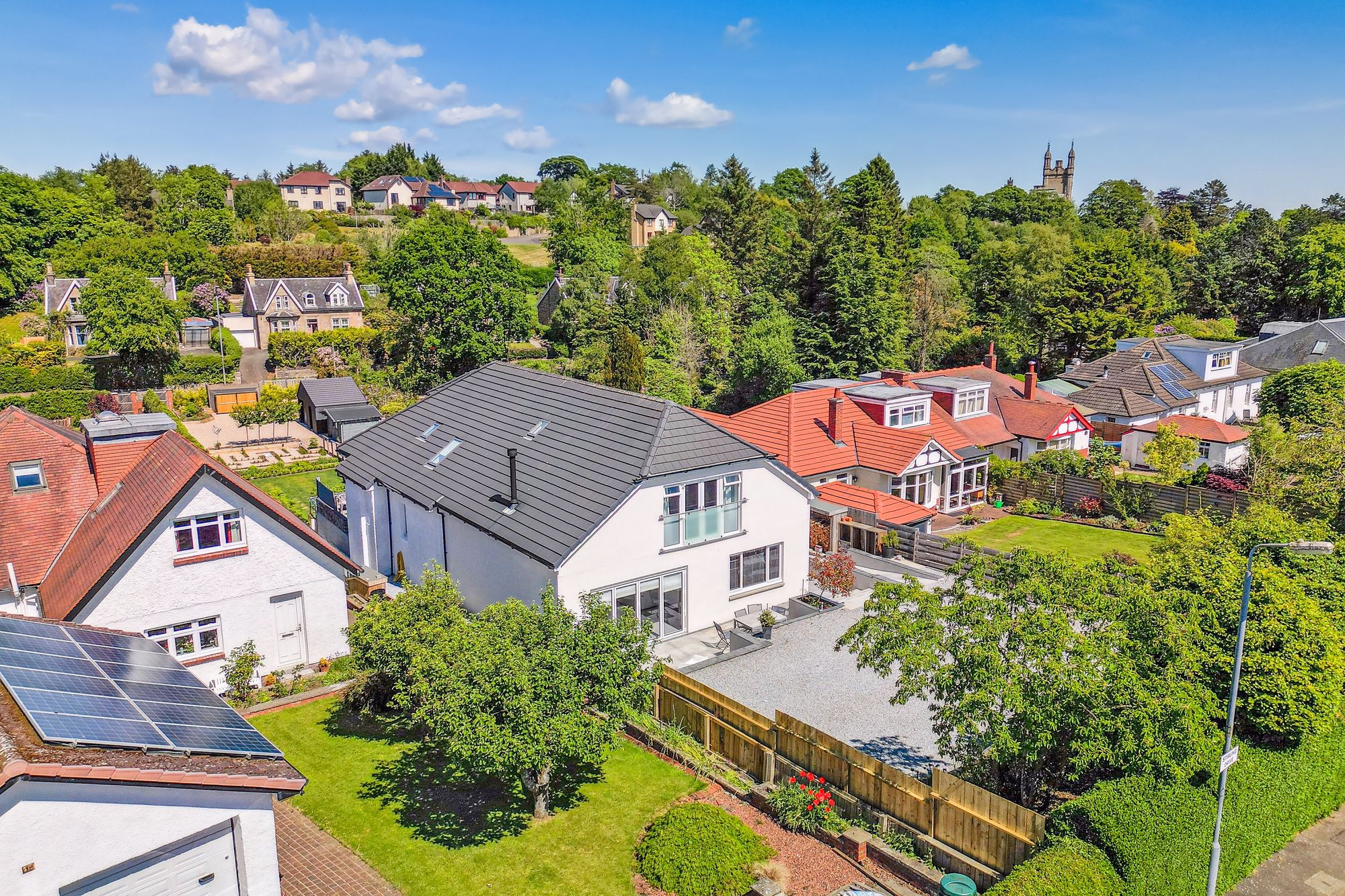 Recently transformed through an extensive programme of remodelling and extension by the current owner, this exquisite detached villa effortlessly blends timeless character with luxurious modern living. Set within expansive and beautifully landscaped grounds, the property enjoys the rare benefit of dual access points. The primary entrance at 115 Drymen Road boasts a substantial detached garage, workshop, summer house, and generous parking, while the secondary entrance at 36 Stirling Drive offers additional courtyard parking—an exceptionally rare feature secured through approved planning permission. The gardens have been thoughtfully redesigned as a private haven, complete with a charming planted maze, bespoke outdoor kitchen, multiple elegant seating and patio areas, and an array of vibrant, mature plantings that offer year-round visual appeal.