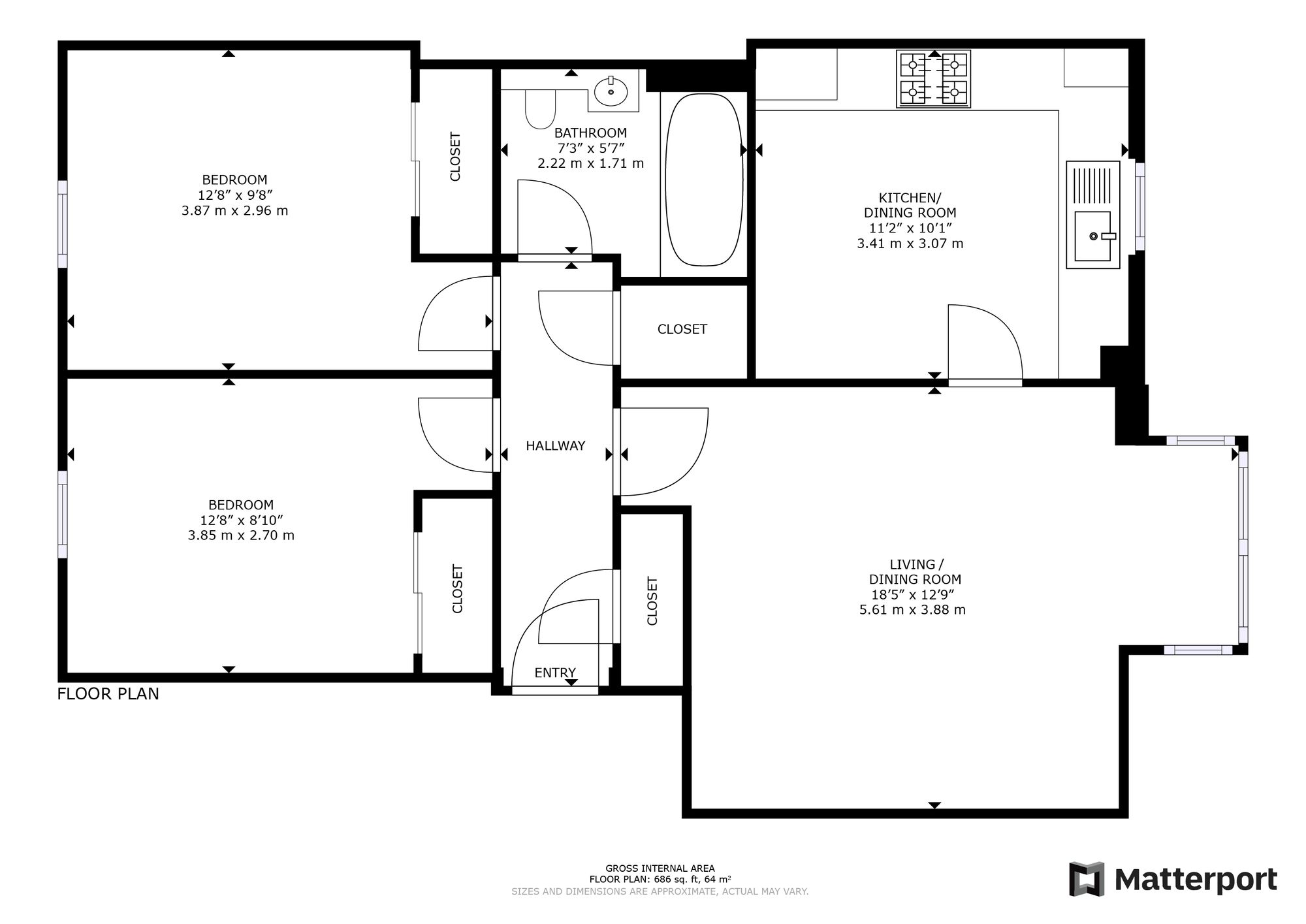 The property is approached via communal stair with secure entry phone system. Welcoming hallway with two storage cupboards leads through to the bright and spacious living room with ample space for a dining table. Located off the living room is the dining kitchen with a range of floor and wall mounted units. The appliances include four ring gas hob, oven, fridge freezer and washing machine. There are two well proportioned bedrooms both benefitting from built in wardrobes with sliding mirrored doors. The bathroom has a white three piece suite comprising of bath with mains shower over, wash hand basin with lower storage and WC.