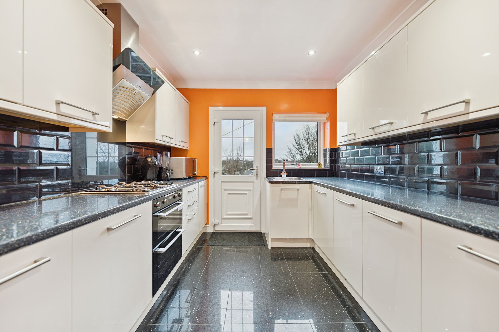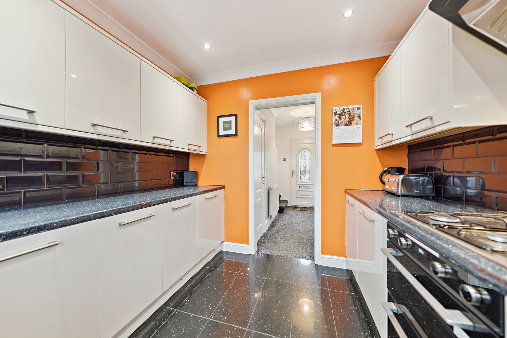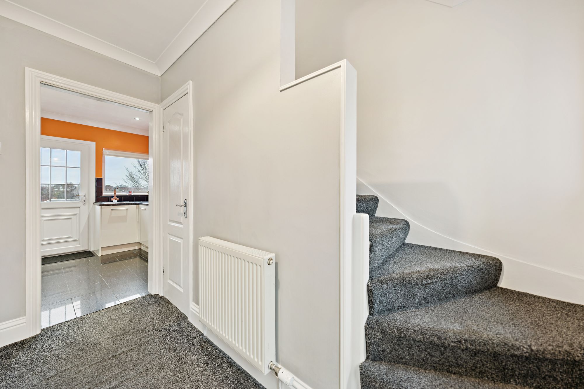 Internally, the accommodation is thoughtfully arranged over two levels. The welcoming entrance hallway incorporates useful storage and leads through to a bright, front-facing lounge with ample space for dining — an ideal setting for both relaxing and entertaining. To the rear, a modern fitted kitchen is equipped with a range of wall and floor-mounted units, integrated appliances and provides direct access to the private rear garden, which benefits from open outlooks and generous outdoor space.