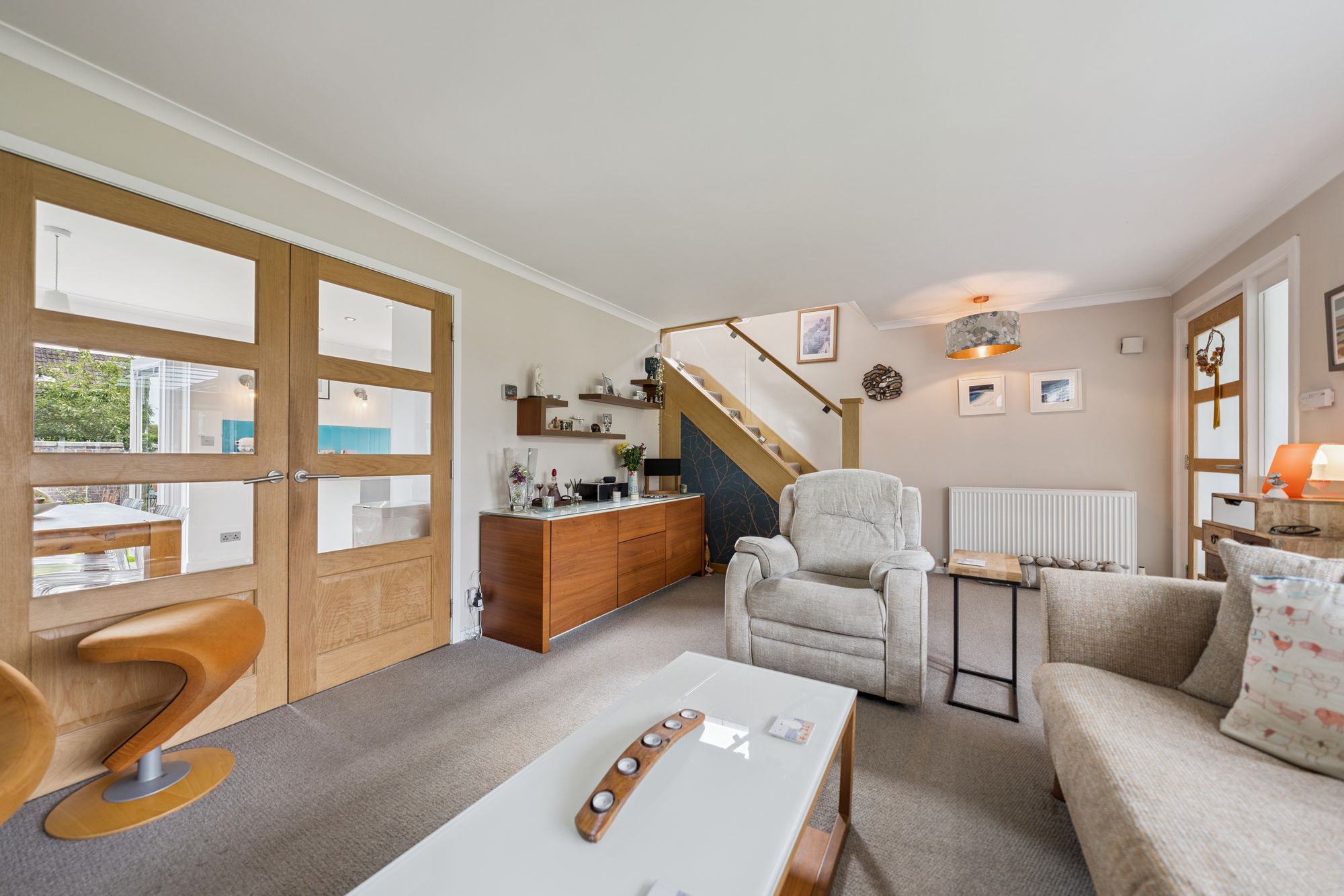 The ground floor welcomes you with an entrance vestibule featuring a convenient storage cupboard. A bright and spacious living room flows seamlessly through double doors into a contemporary open-plan dining kitchen. The kitchen is fitted with an attractive range of wall and base units, a handy pantry cupboard, and ample space for a dining table and chairs. French patio doors open directly onto a sunny rear garden—perfect for entertaining or relaxing.