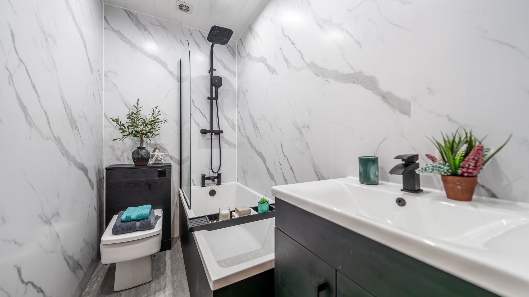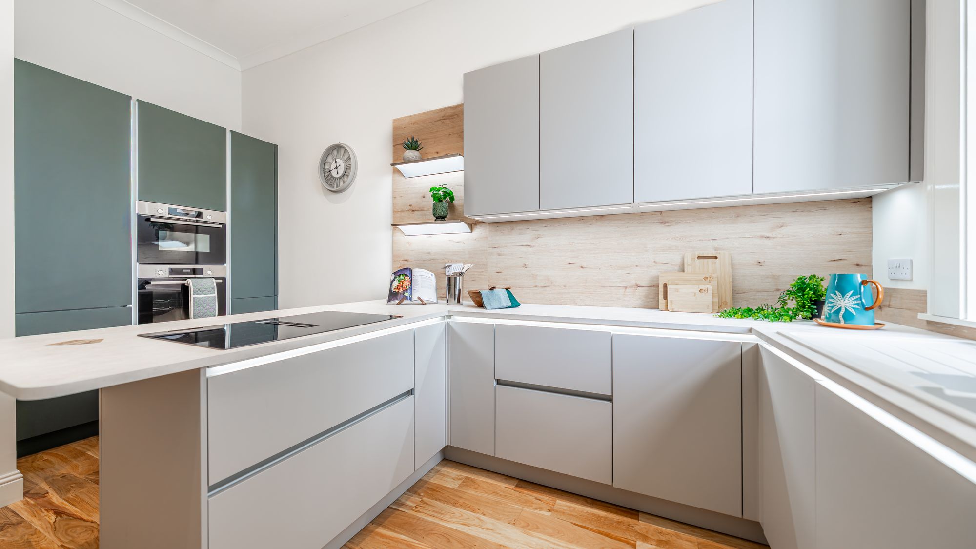 Internally, the accommodation comprises a welcoming reception hallway with press cupboard, a stunning front-facing lounge with expansive bay window and walk-in storage, and a generous modern dining kitchen fitted with a range of sleek units and integrated appliances. Both bedrooms are spacious doubles, while the stylish family bathroom features a shower over bath and quality fittings.