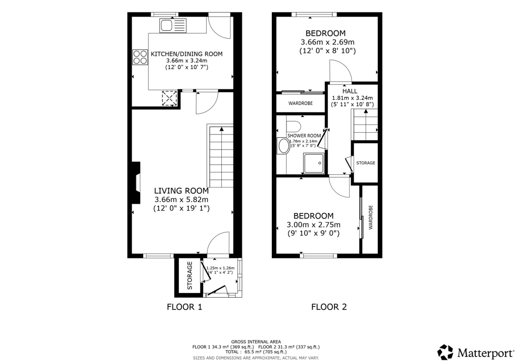 Upstairs, the upper landing gives access to two well-proportioned double bedrooms, both featuring integrated storage, and a contemporary family bathroom complete with a three-piece suite and walk-in shower enclosure.