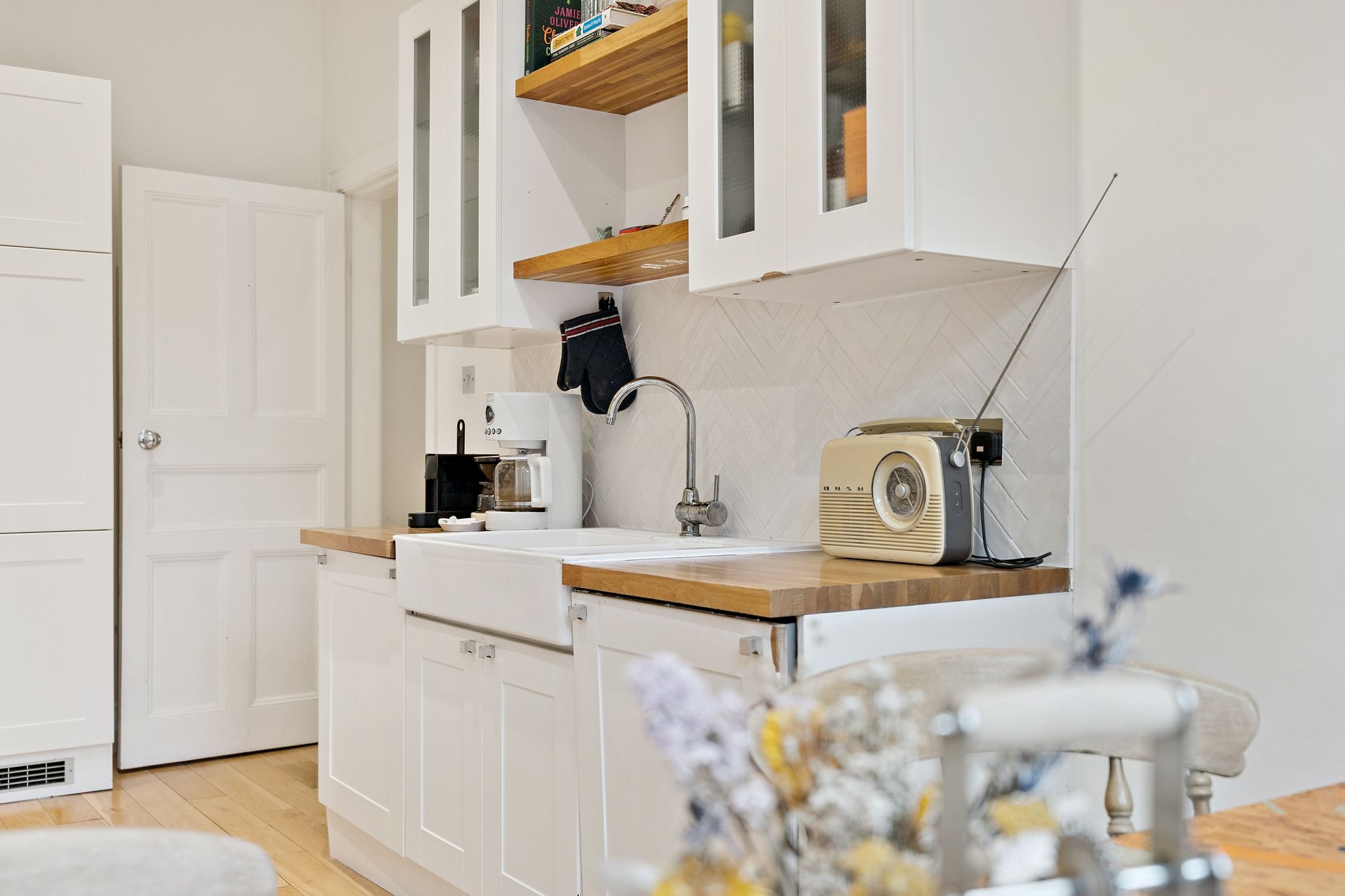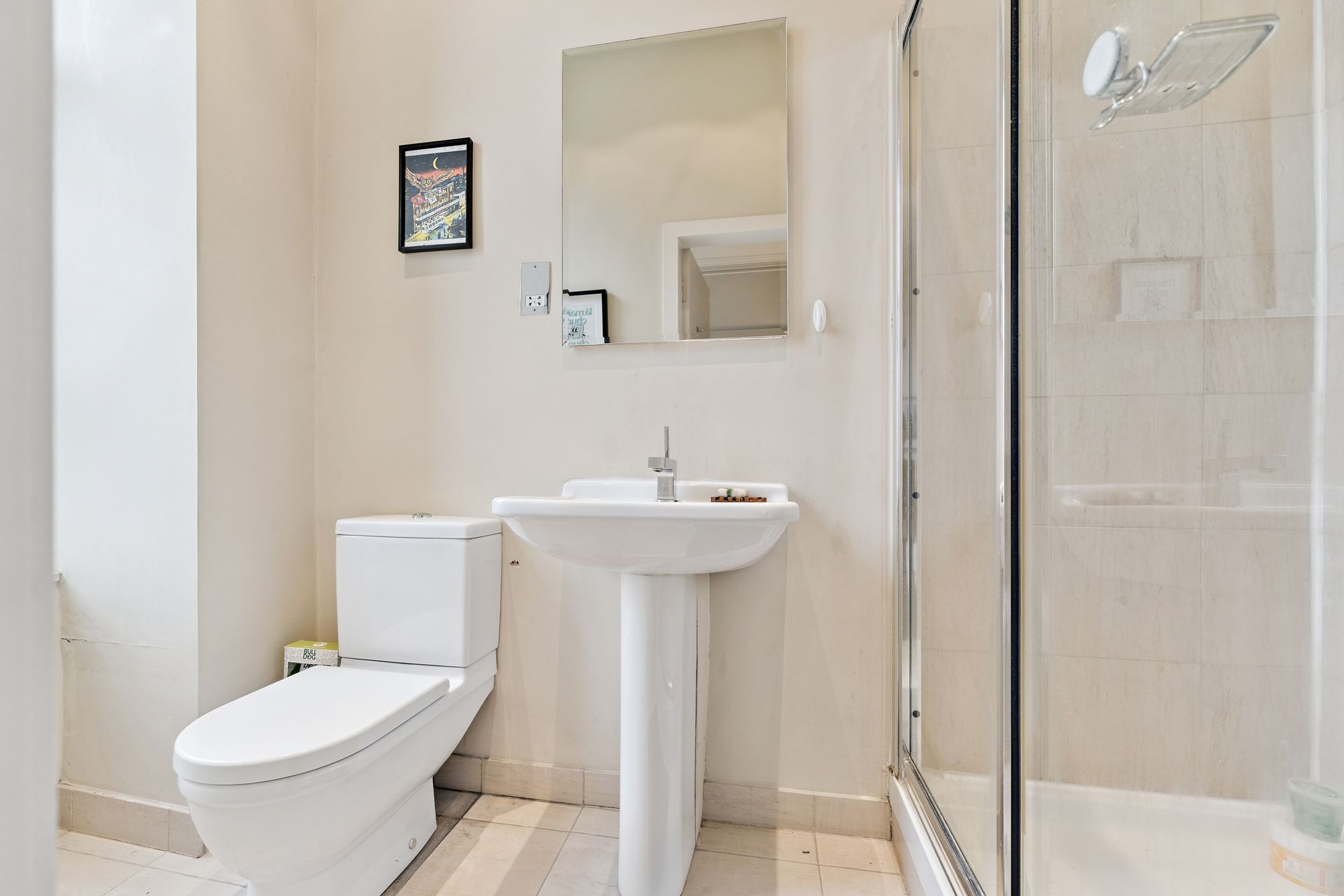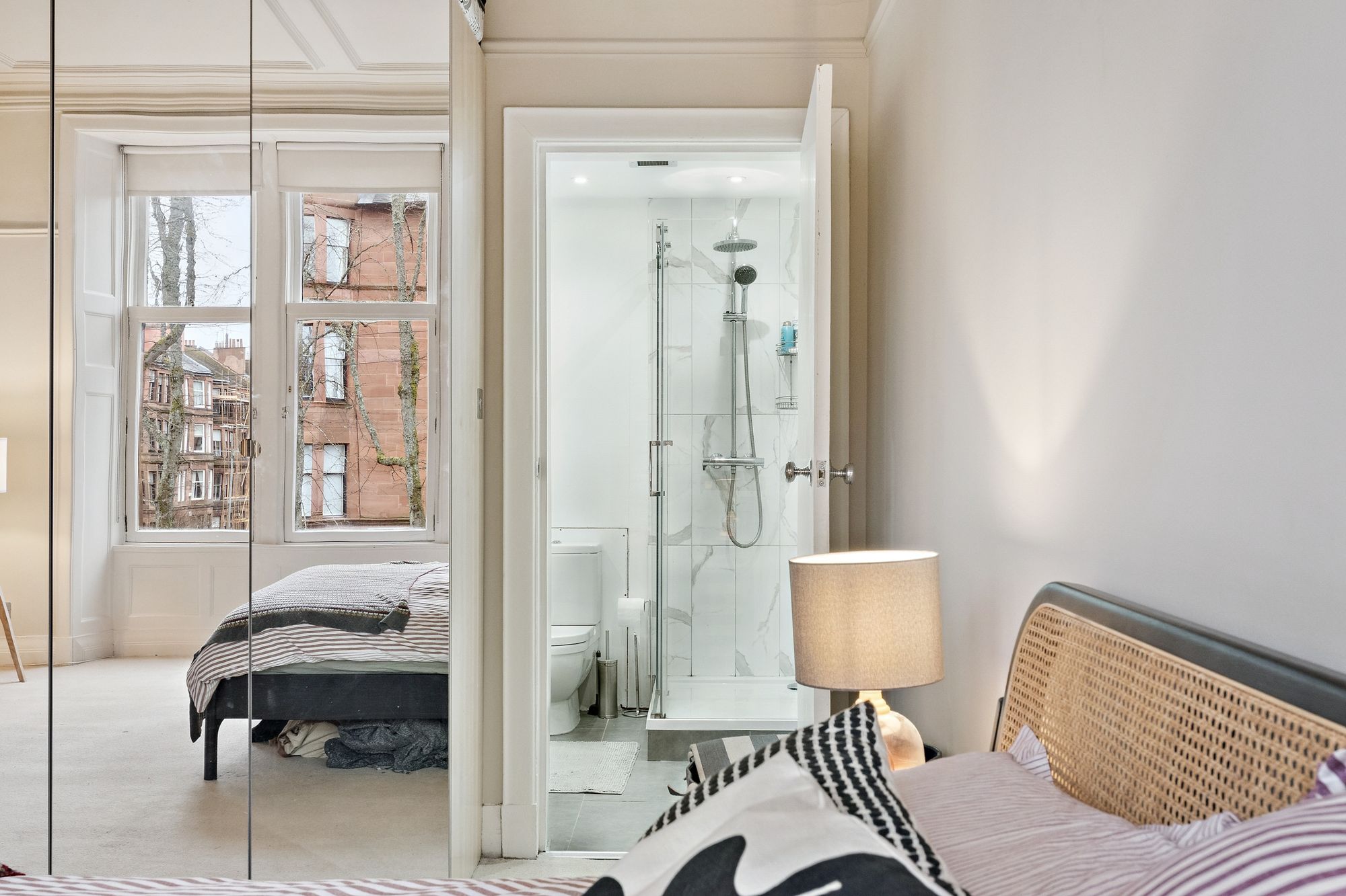The home for sale occupies the preferred first floor position, within a well maintained tenement building. Internally, the flat is modern and has been well maintained by the current owners. In brief, the accommodation extends to; welcoming entrance hallway with storage off, wonderful bay windowed living room with dual aspect windows, gas fire and incredibly rare, open aspect. There is a stylish dining sized kitchen with shaker style units, Belfast sink, integrated appliances and Herringbone style splash back. Two double bedrooms both of which have en-suites with the generous principal bedroom's en-suite benefitting from both a bath and a shower. The accommodation is completed by a w/c off the hallway.