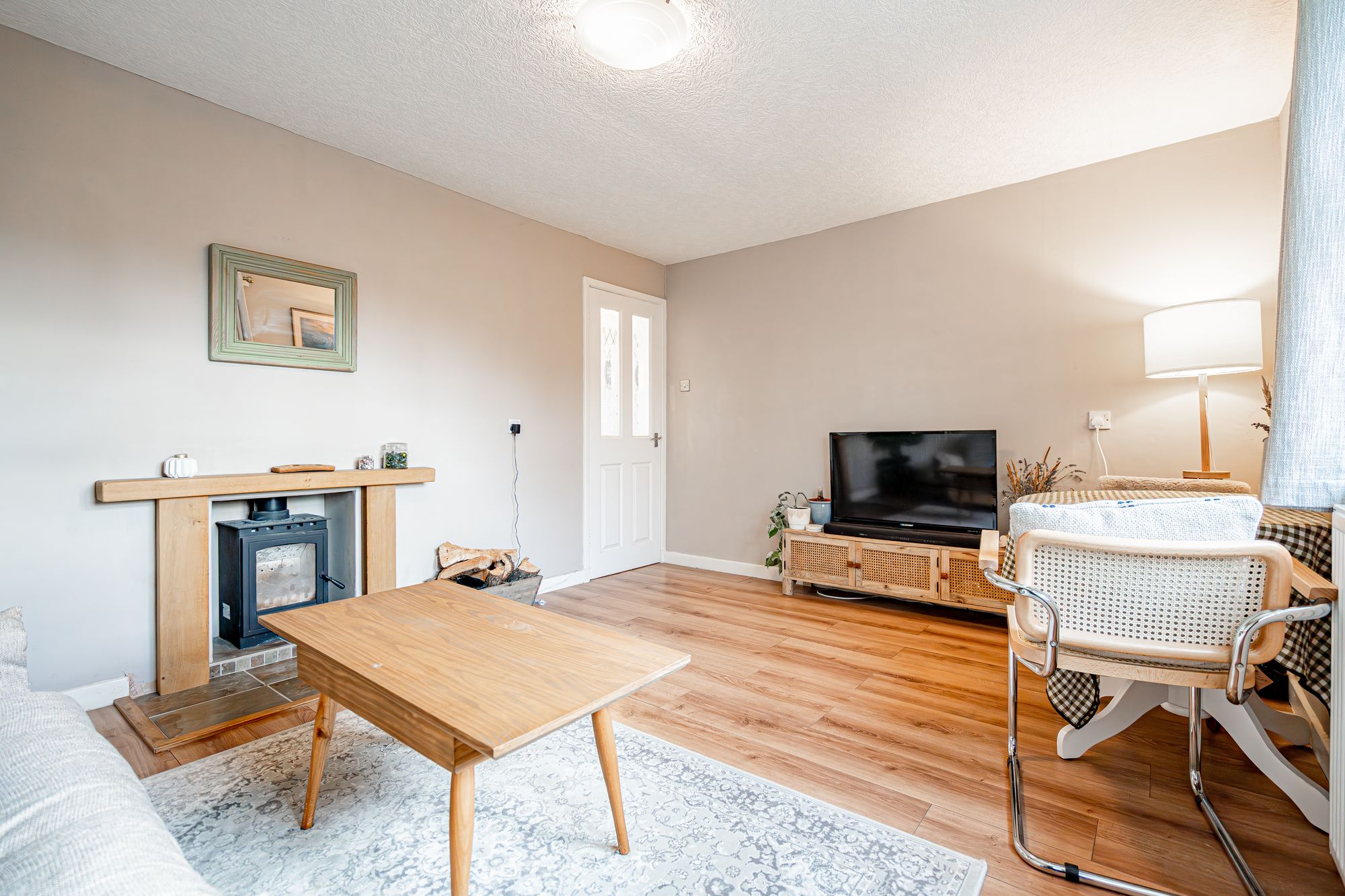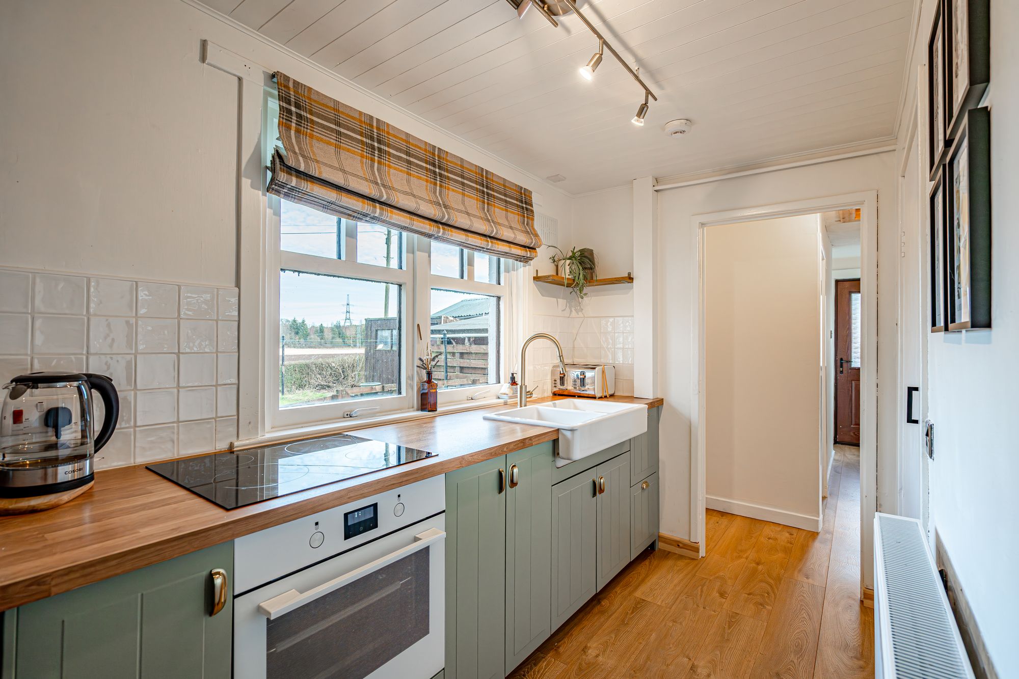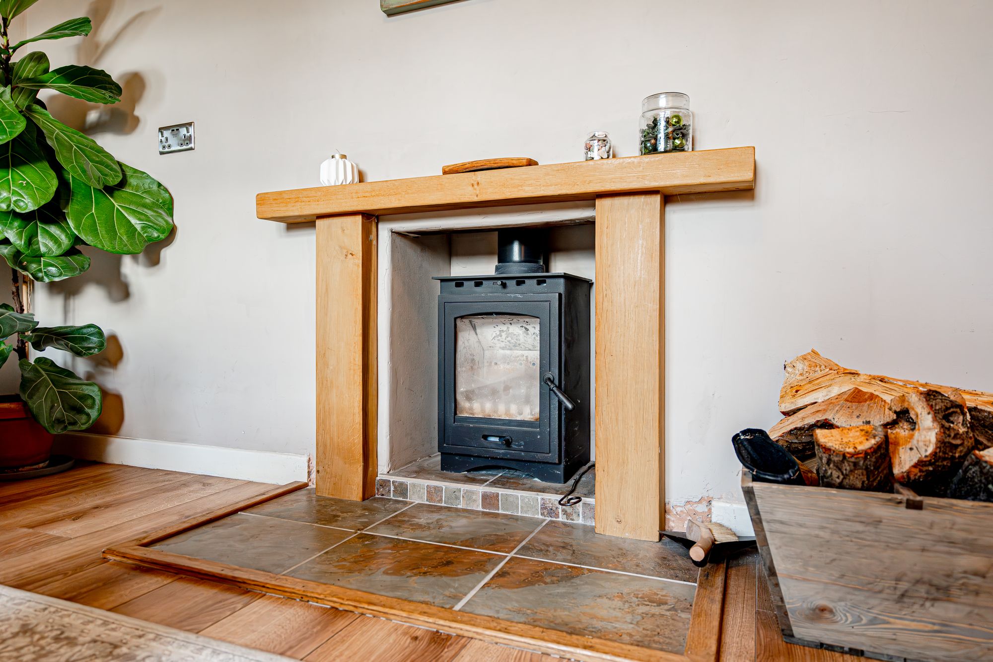 The cottage is accessed via a private front garden and driveway, leading to the front door and a welcoming hallway complete with a convenient utility cupboard. The bright and spacious lounge features a characterful wood-burning stove, creating a warm and relaxing atmosphere. Adjacent is the stylish, fully fitted kitchen, boasting a selection of modern floor units and integrated appliances, ideal for both cooking and entertaining.
