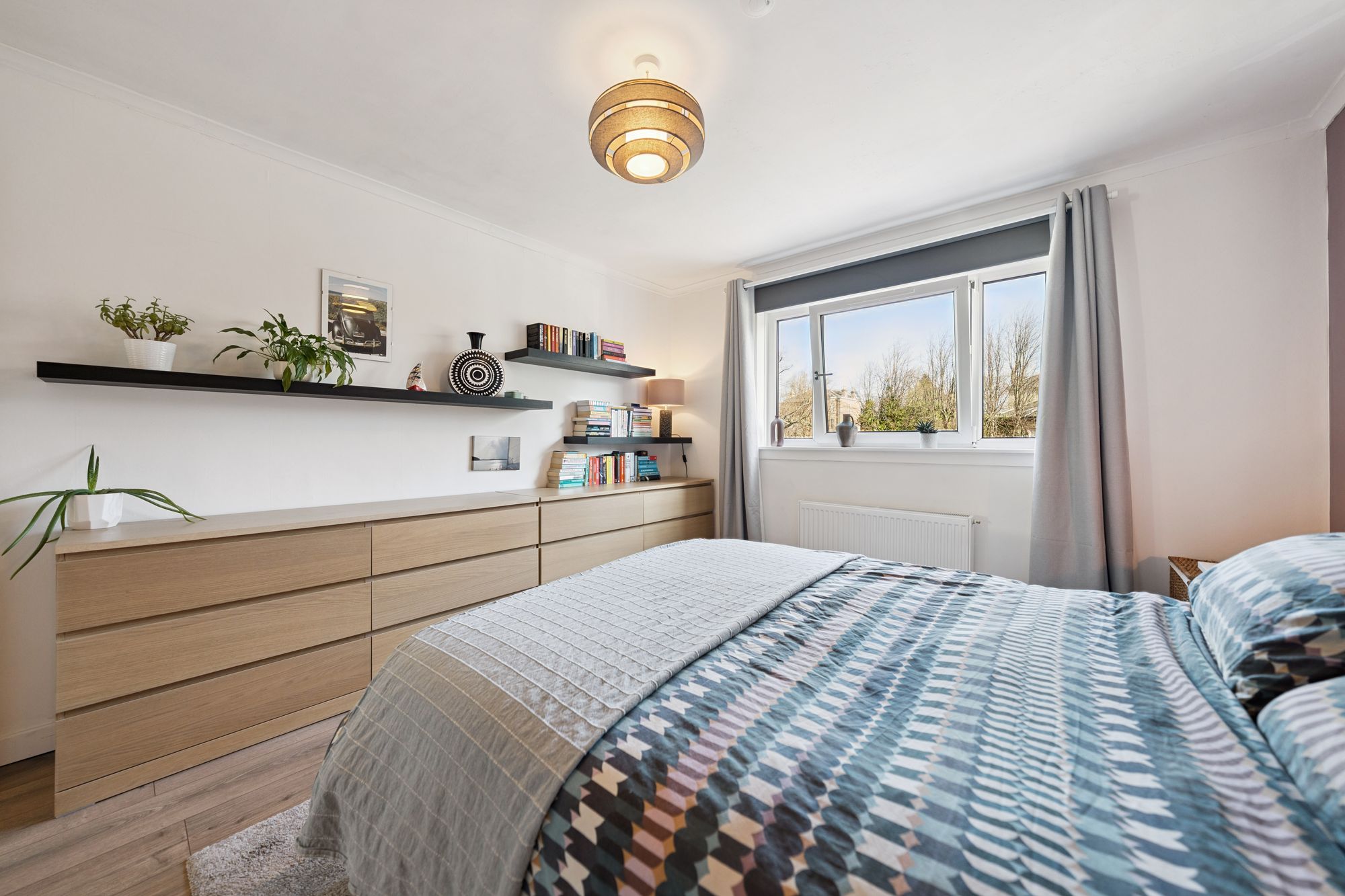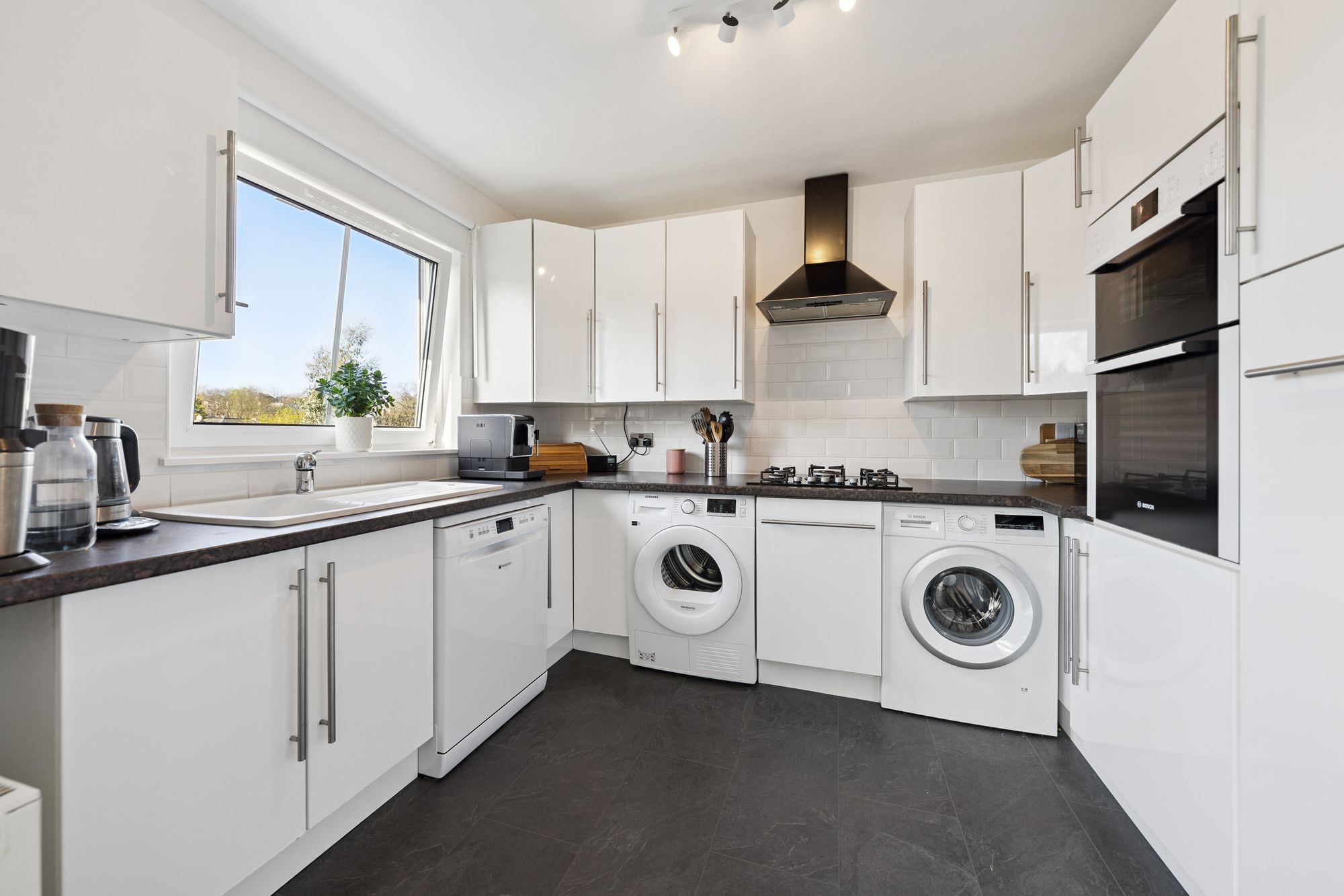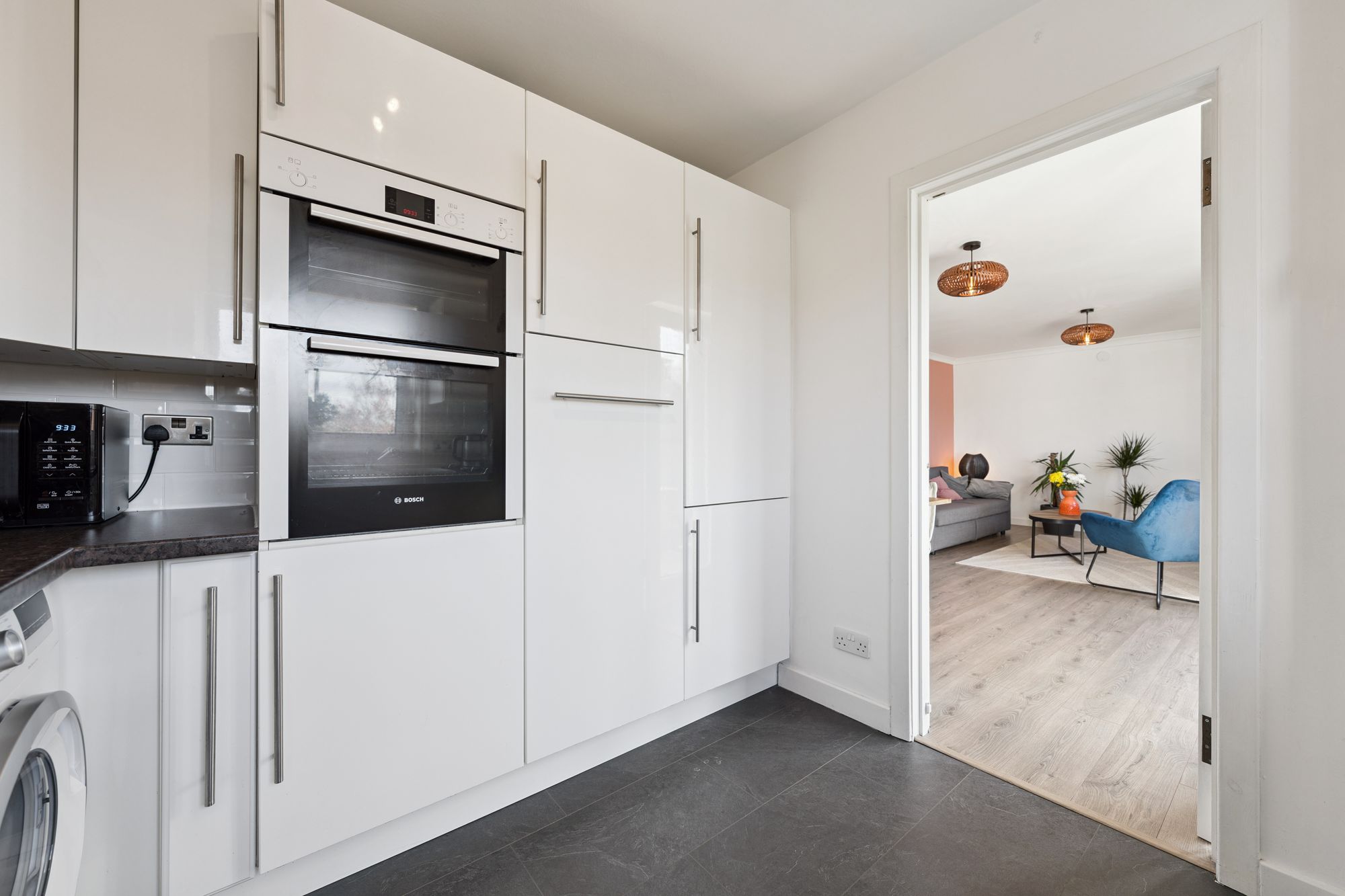 The accommodation is entered via a well-kept residents’ stairwell leading to a welcoming private hallway, complete with three excellent storage cupboards. The generous lounge is bathed in natural light thanks to its dual-aspect outlook and provides ample space for both relaxing and dining, with patio doors opening onto the private balcony. The modern fitted kitchen is well appointed with a range of floor and wall-mounted units and integrated appliances.