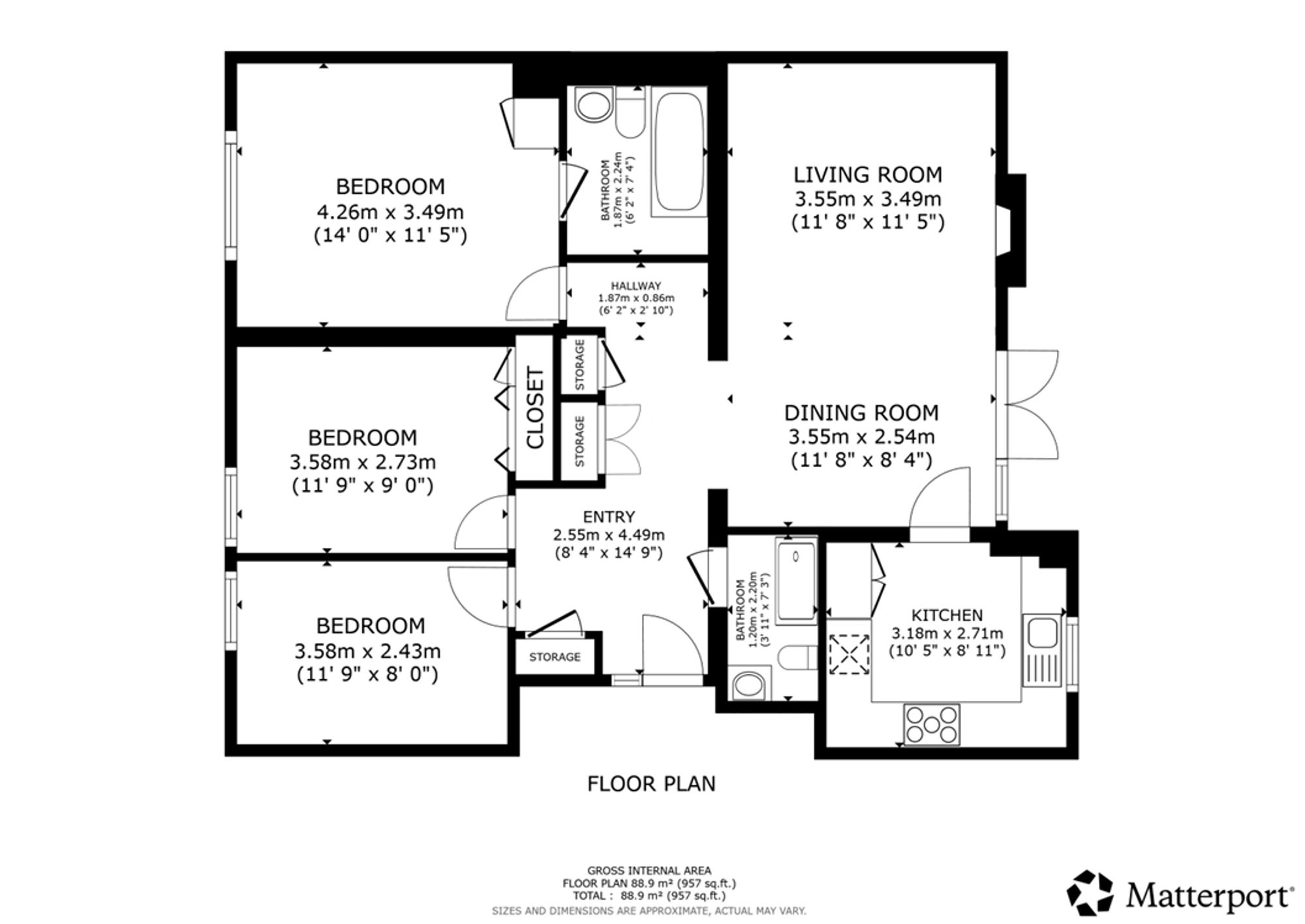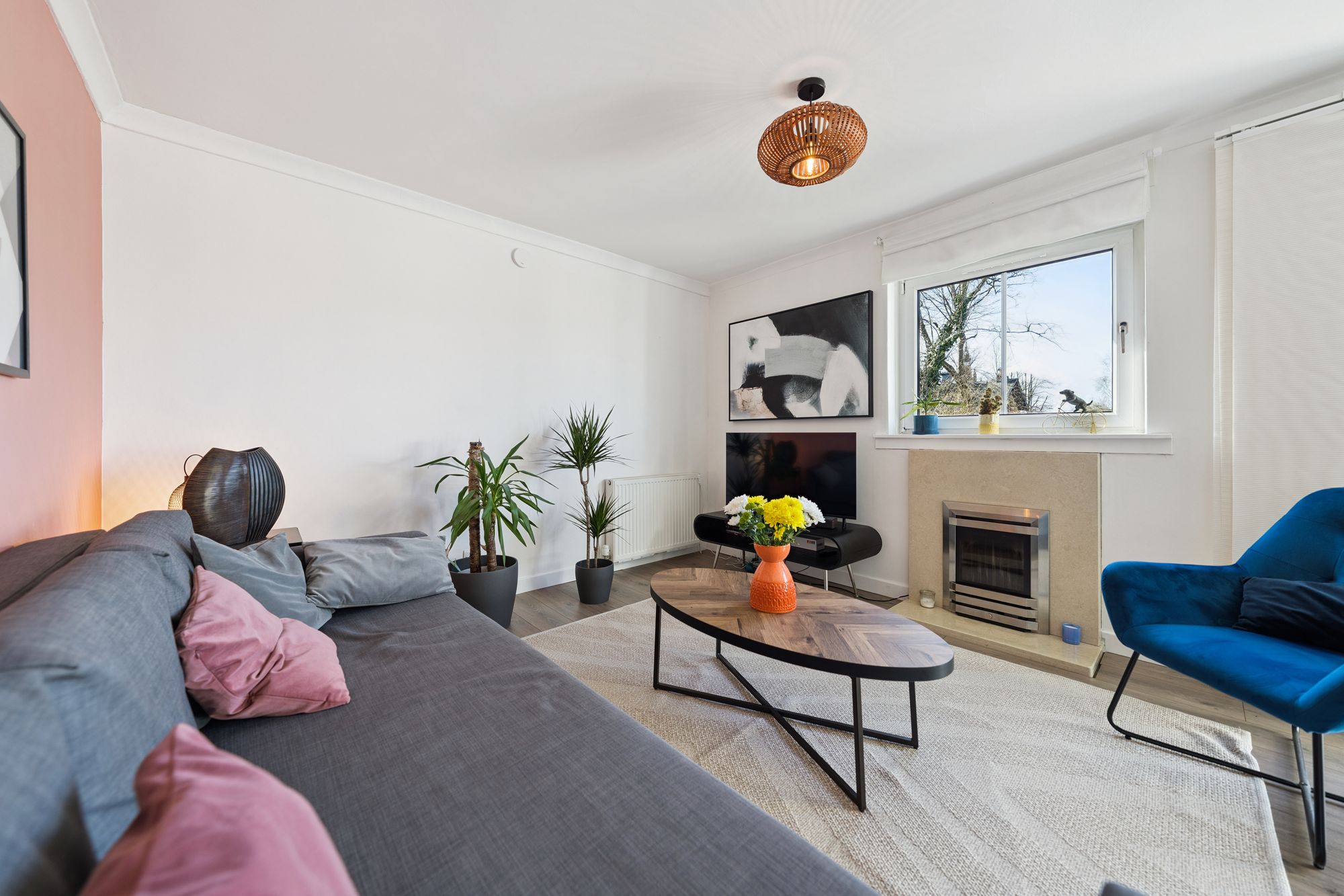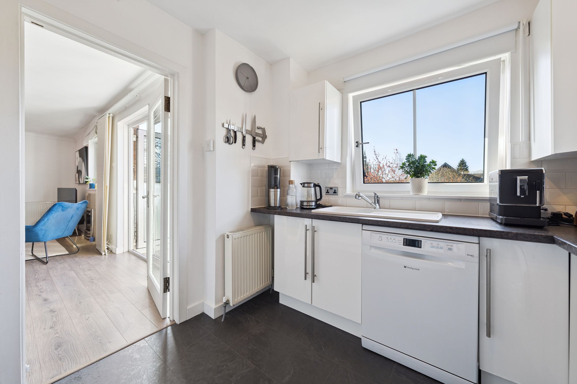 The accommodation is entered via a well-kept residents’ stairwell leading to a welcoming private hallway, complete with three excellent storage cupboards. The generous lounge is bathed in natural light thanks to its dual-aspect outlook and provides ample space for both relaxing and dining, with patio doors opening onto the private balcony. The modern fitted kitchen is well appointed with a range of floor and wall-mounted units and integrated appliances.