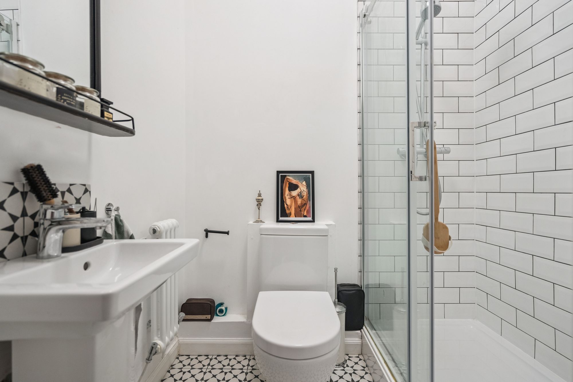 Set within a charming Victorian tenement with secure entry, the property welcomes you into a grand reception room where soaring ceilings, large sash windows, intricate cornicing, and elegant dark herringbone parquet flooring create a sense of space and sophistication. A feature fireplace and designer radiator add warmth and character, making this a truly inviting living area.